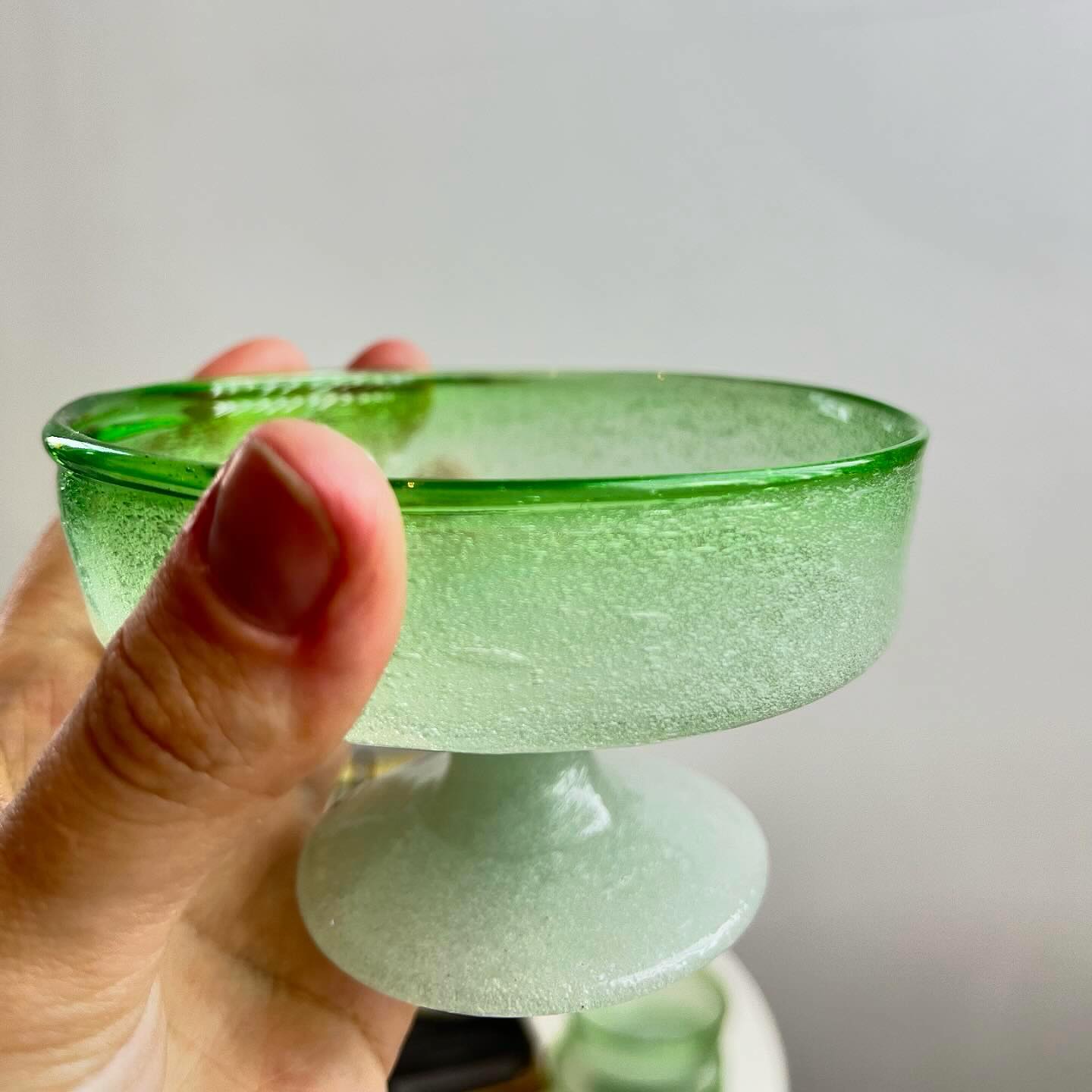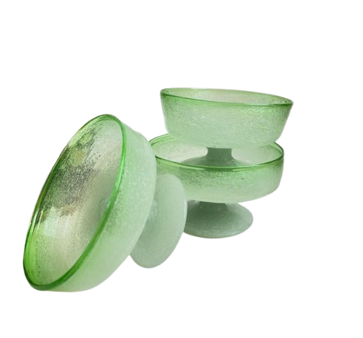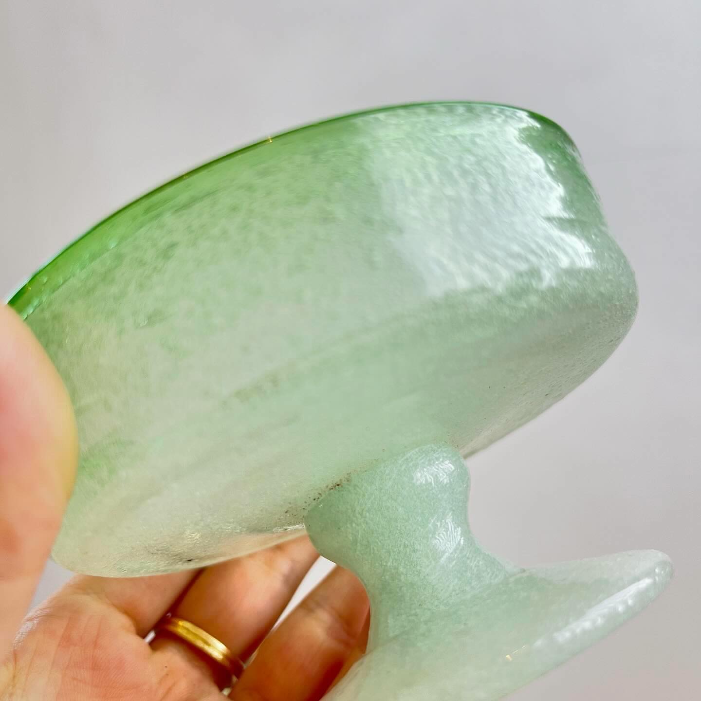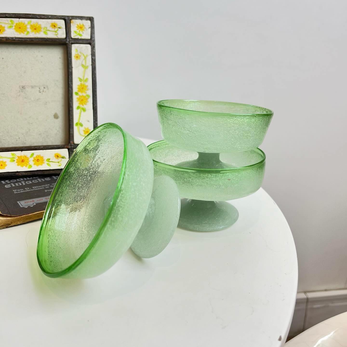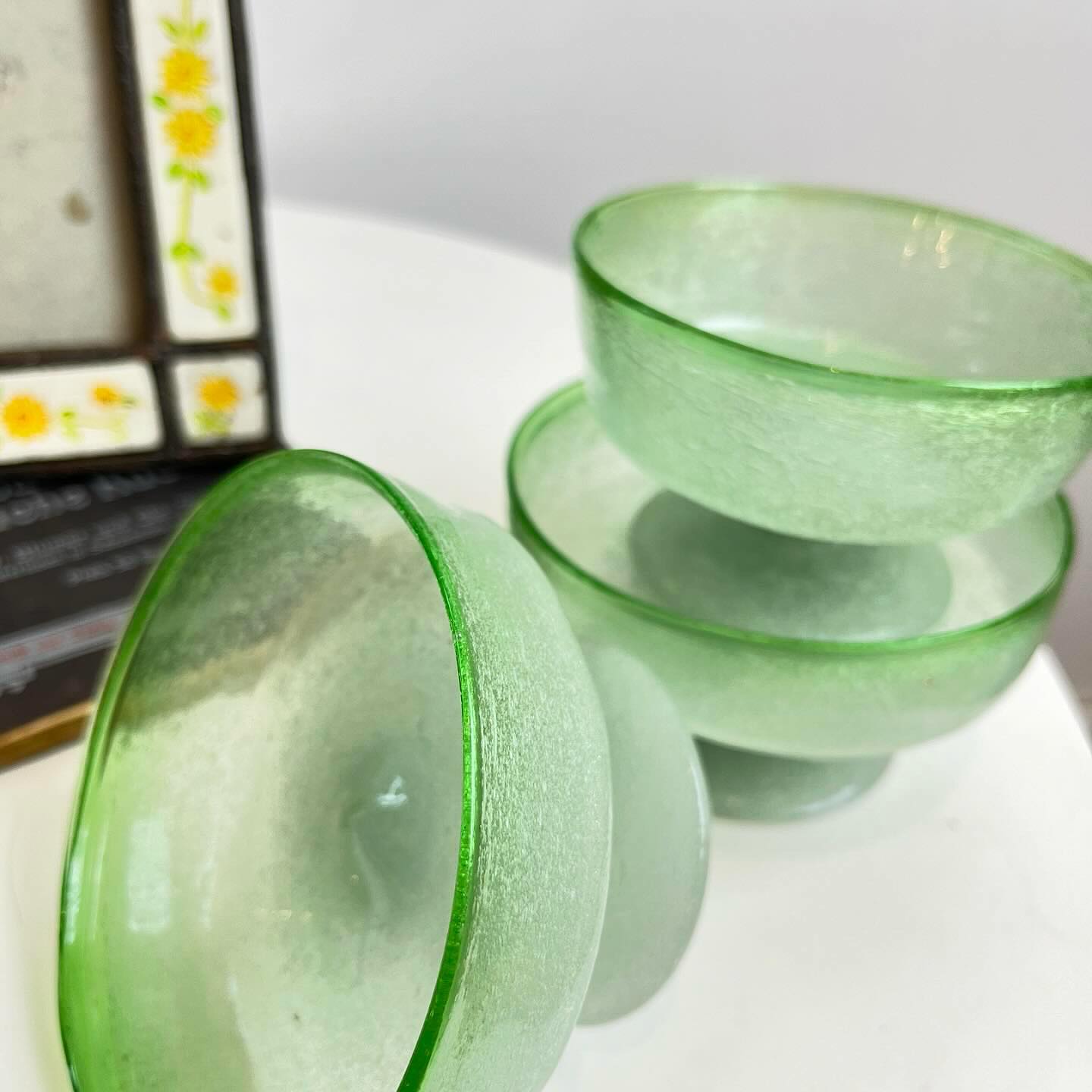 3 taças de sobremesa em grosso vidro soprado e moldado artesanalmente. Uma com quase imperceptível trincado.