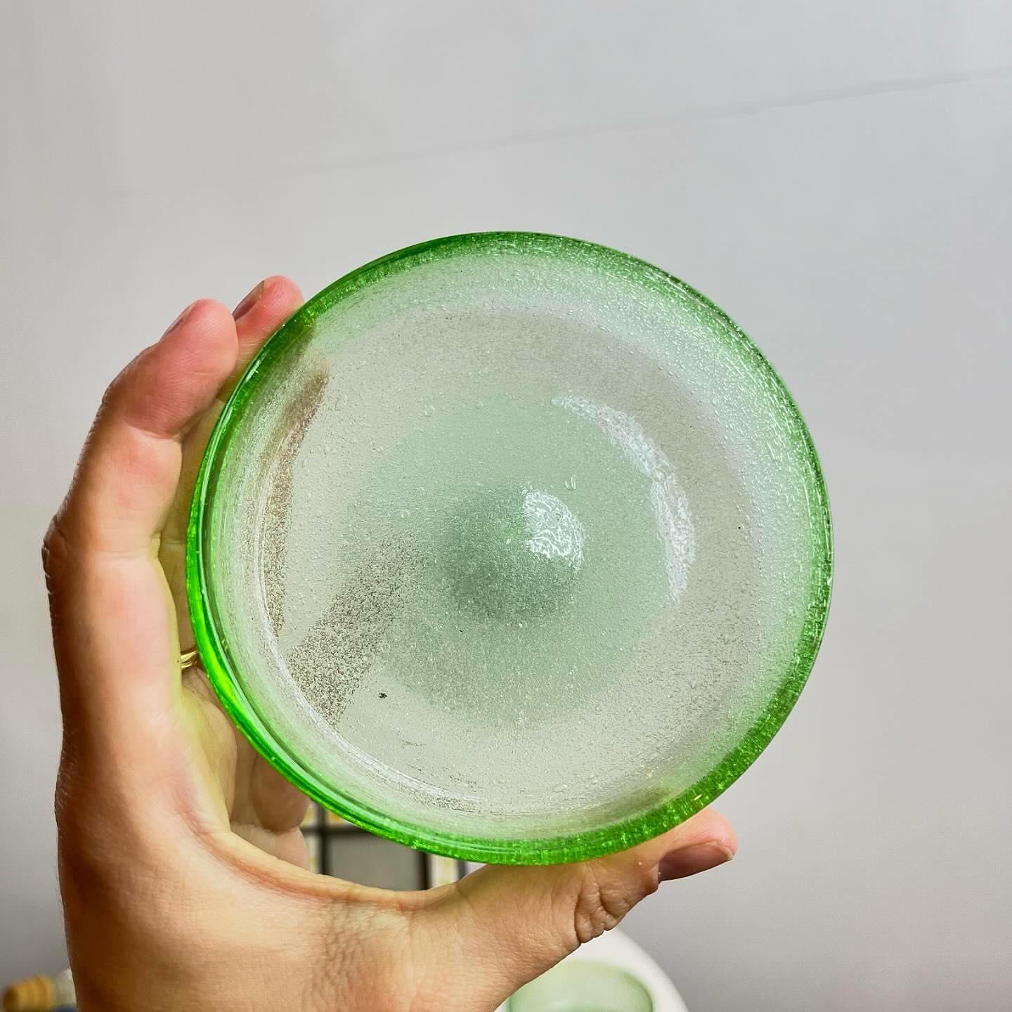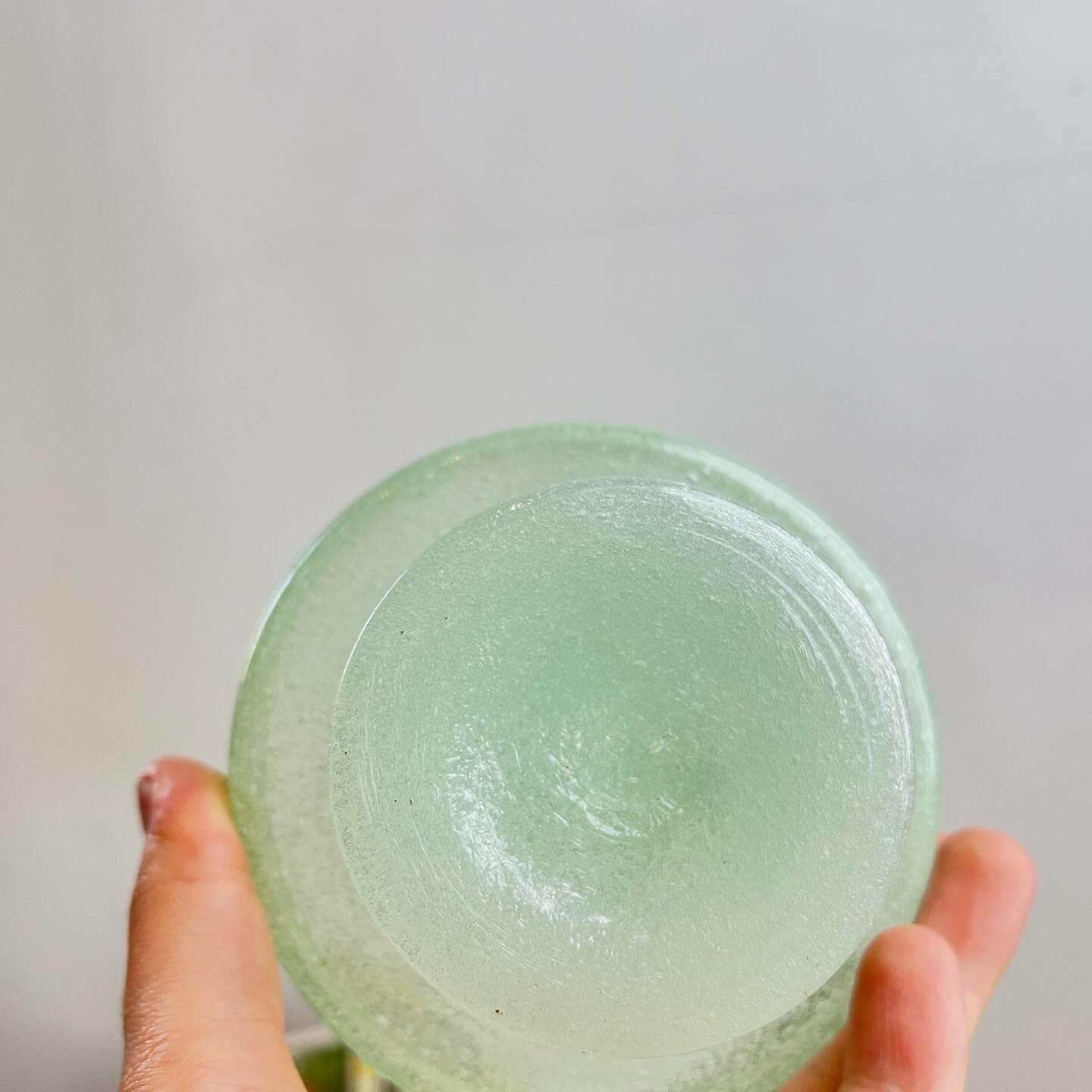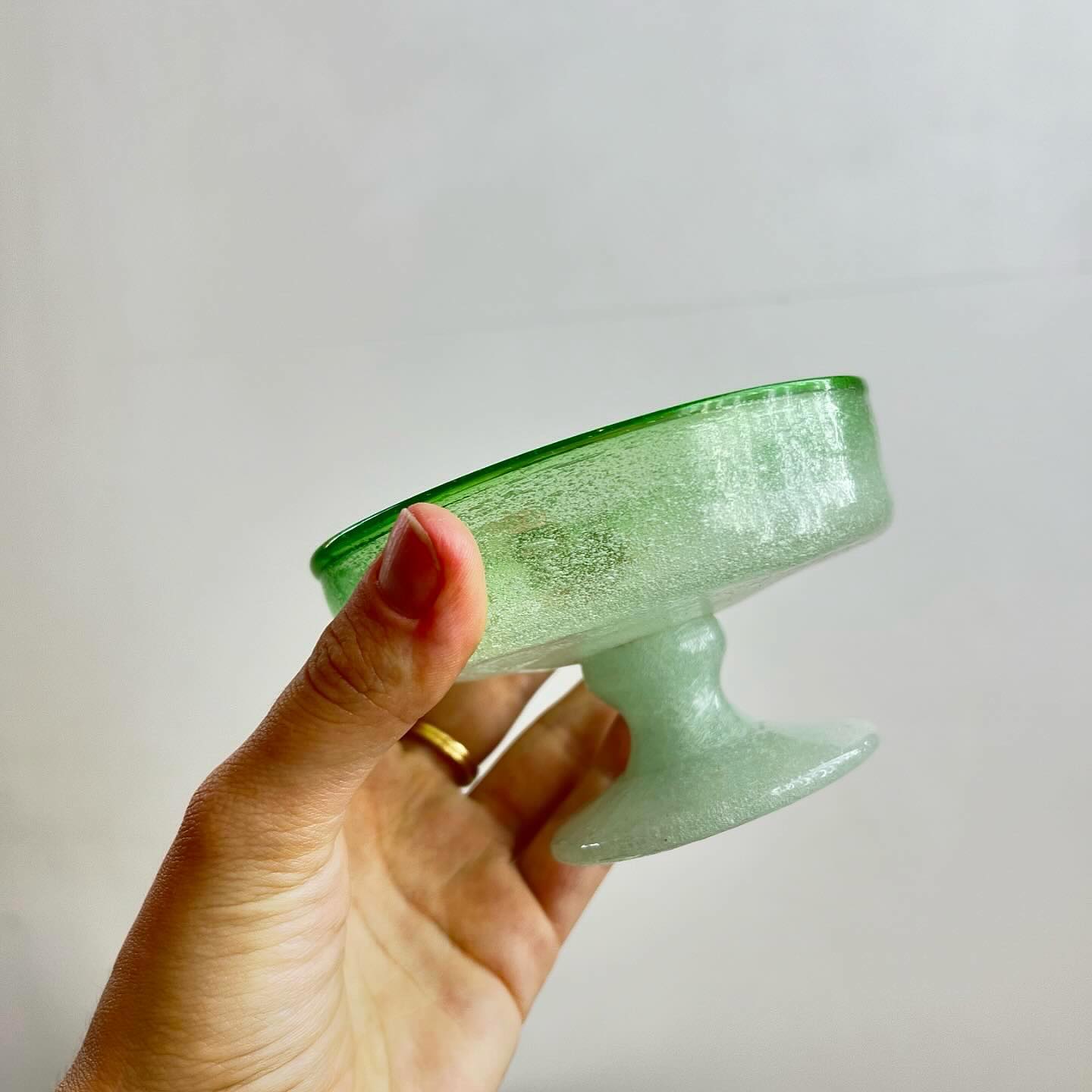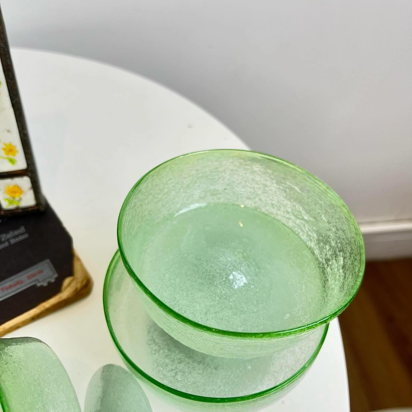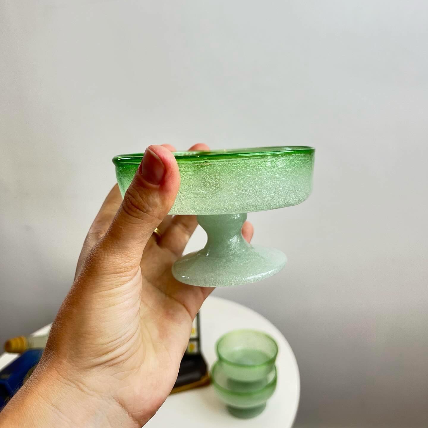 3 taças de sobremesa em grosso vidro soprado e moldado artesanalmente. Uma com quase imperceptível trincado.