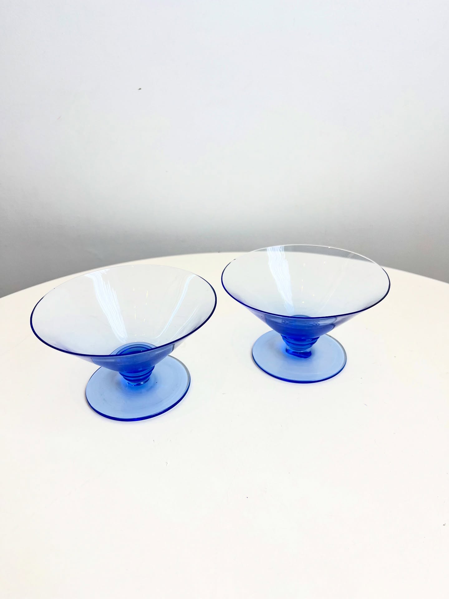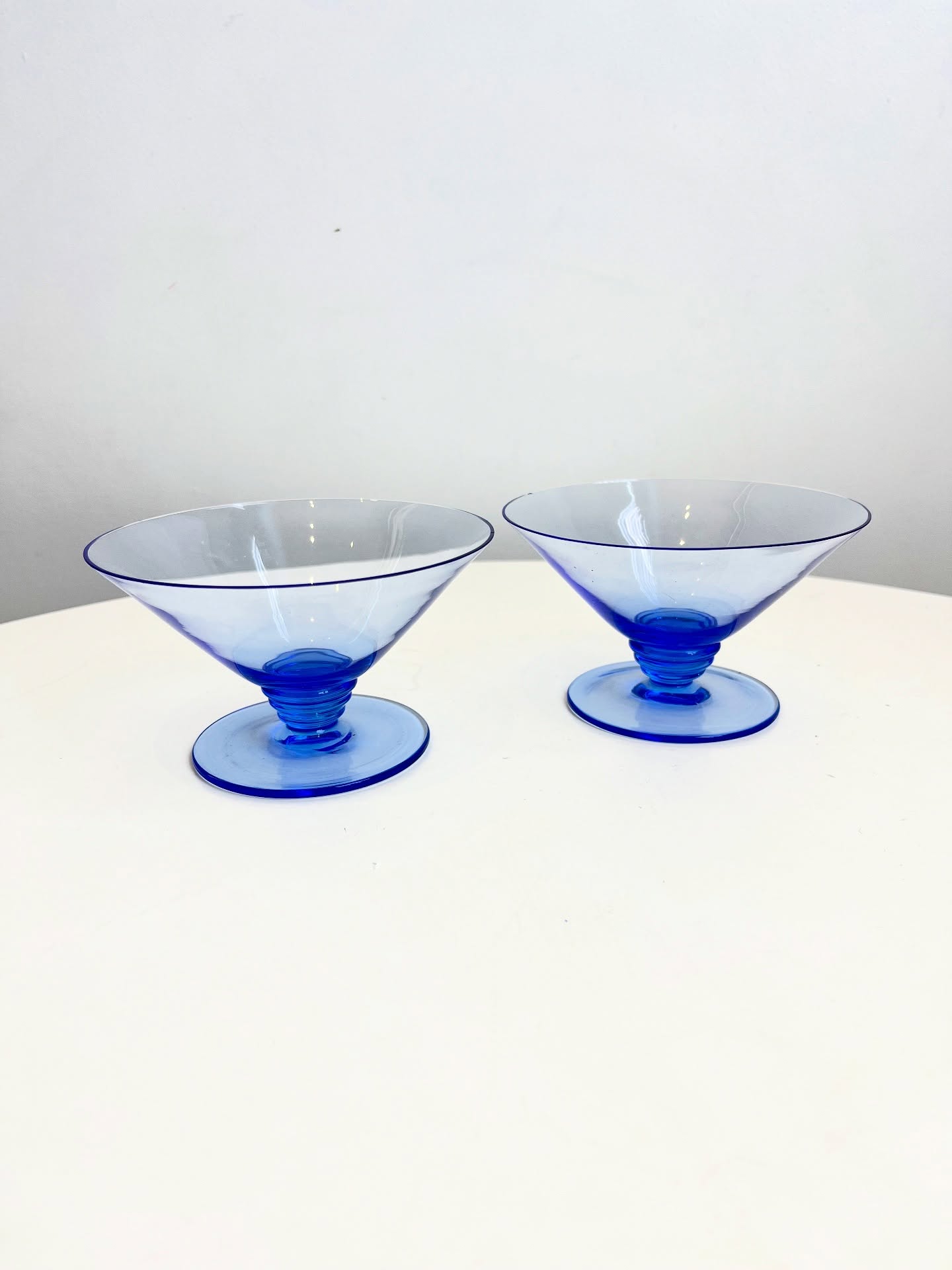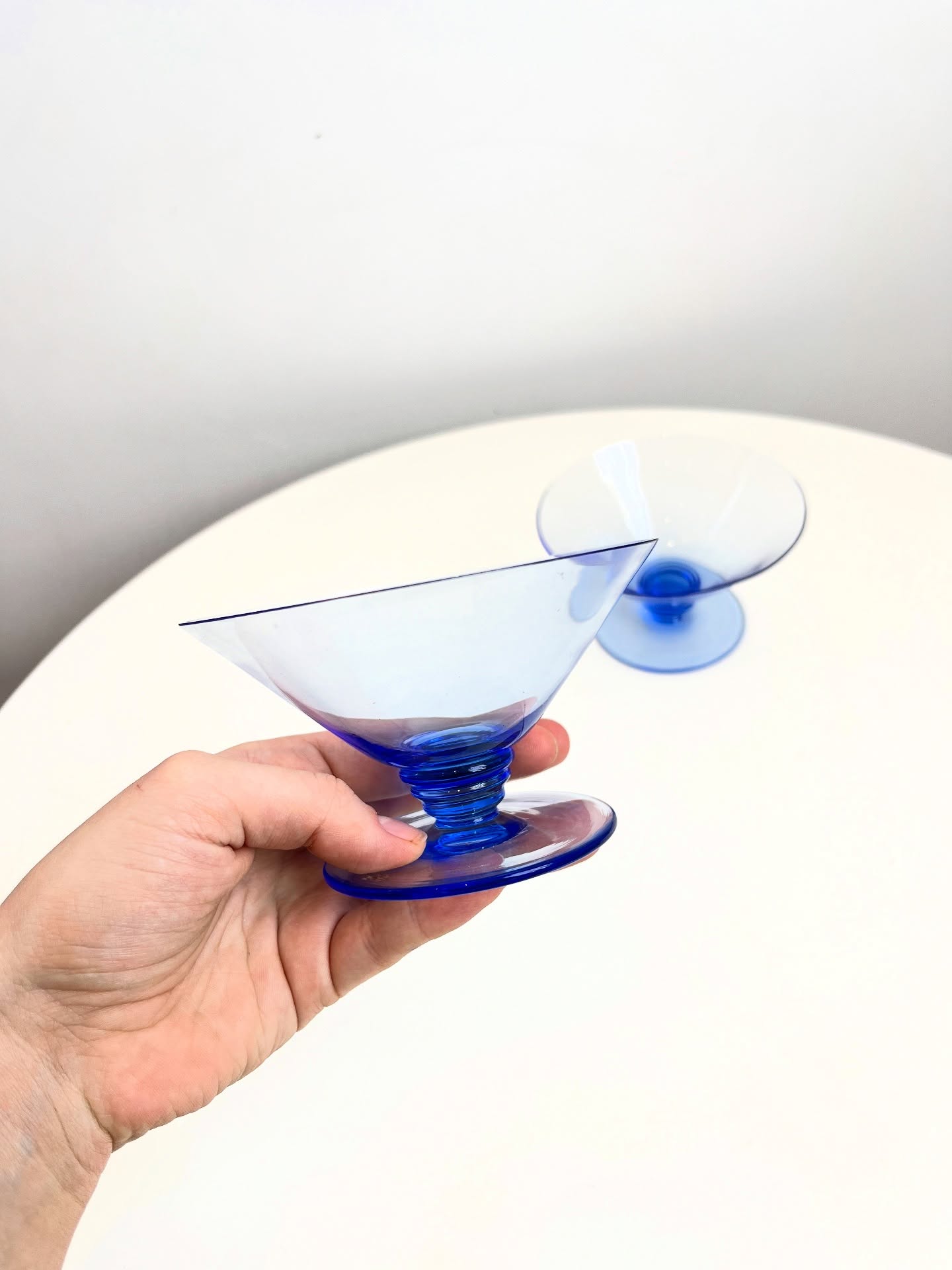 Dupla de taças para Martini/champanhe em fino vidro azul. Mínimos lascados na borda.