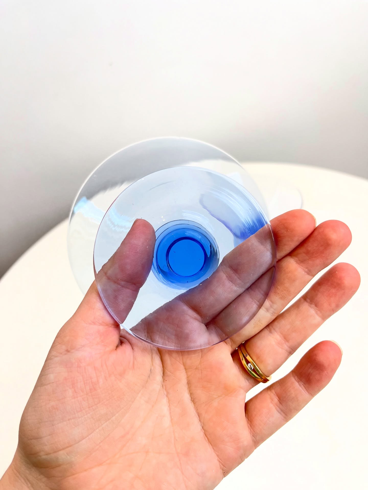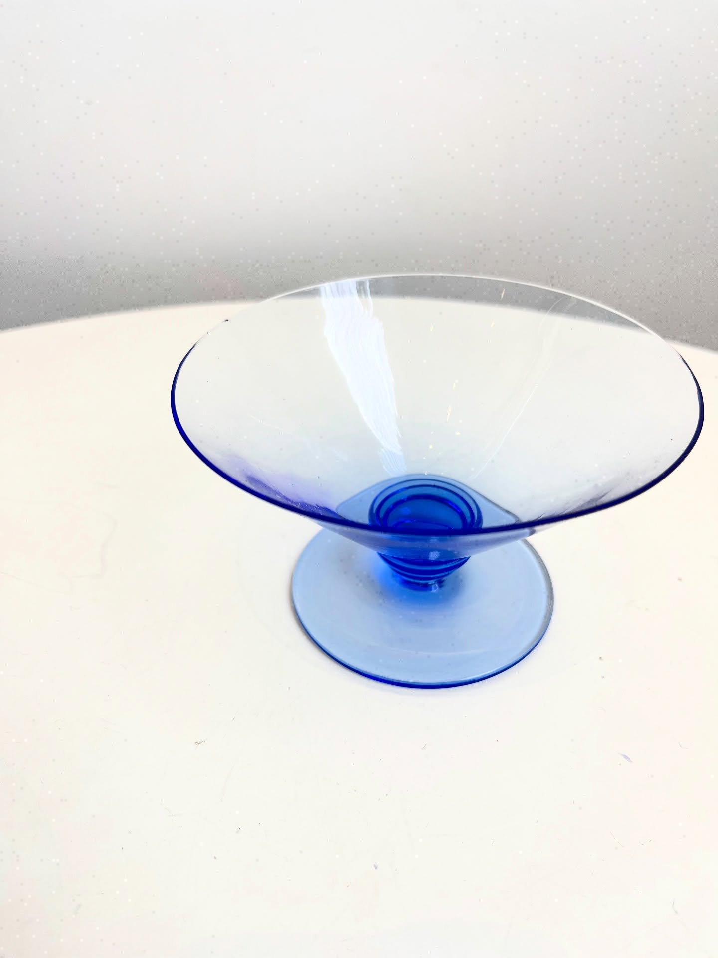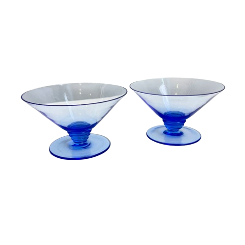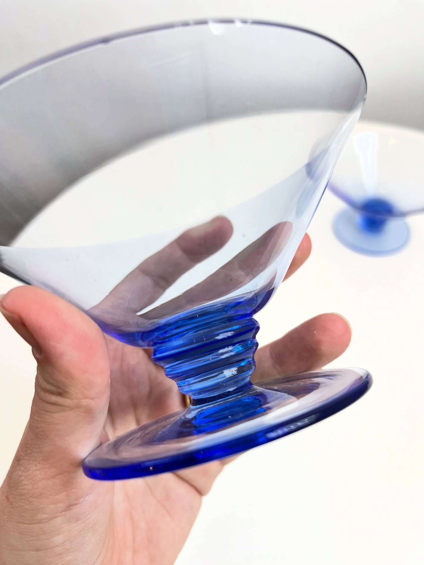 Dupla de taças para Martini/champanhe em fino vidro azul. Mínimos lascados na borda.