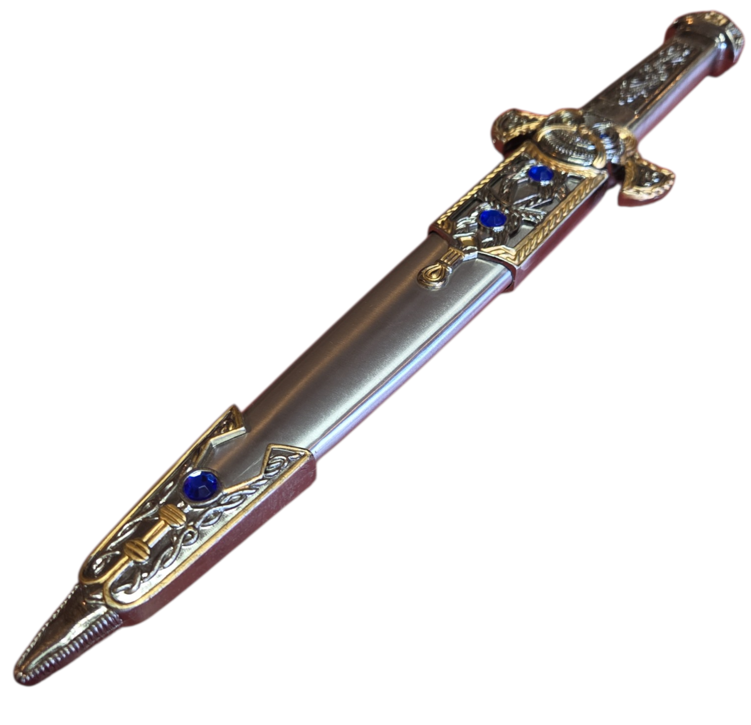 Adaga decorativa com design inspirado na fantasia épica, apresentando um acabamento refinado em tons de prata e ouro envelhecido. A peça destaca-se pela riqueza de detalhes em relevo e pela aplicação de cristais sintéticos na cor azul safira, que conferem um aspecto luxuoso e místico ao conjunto.