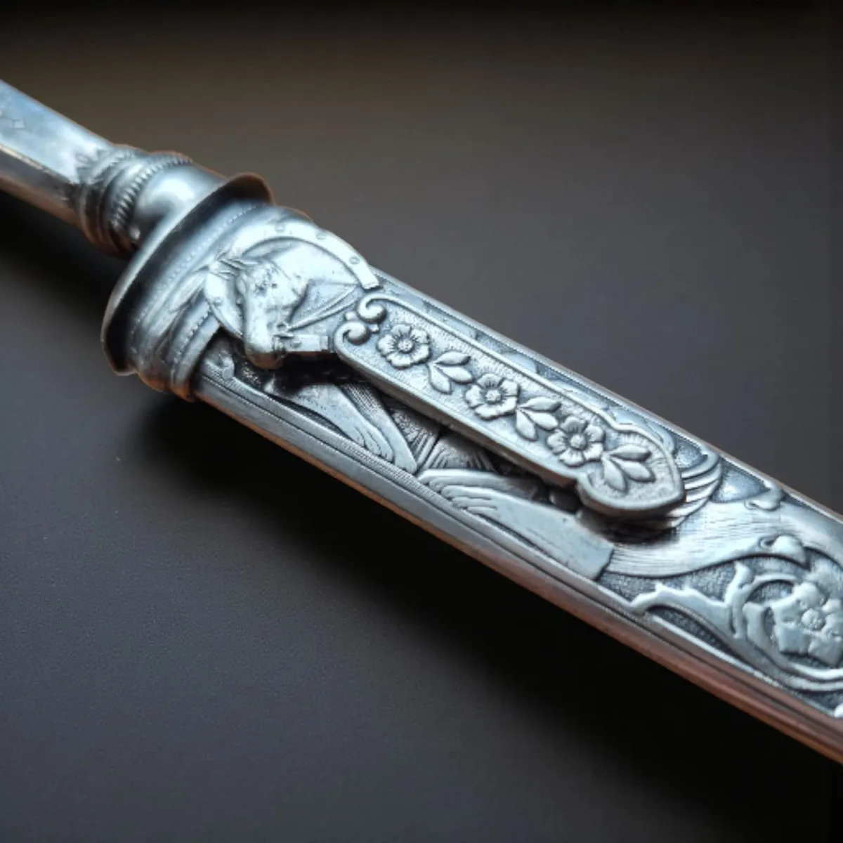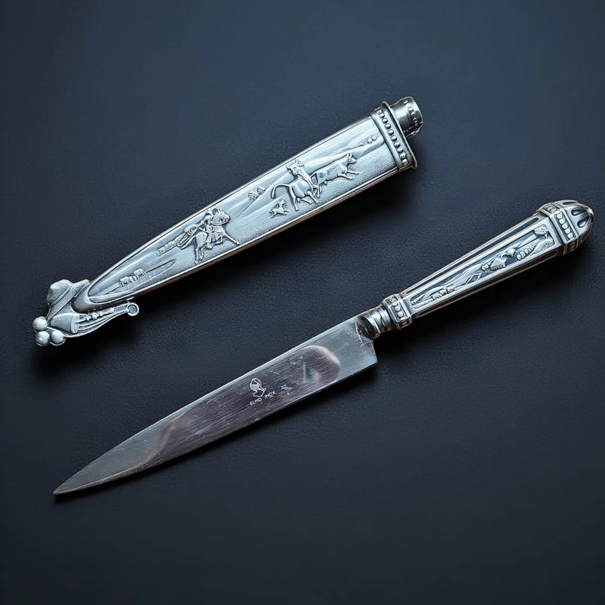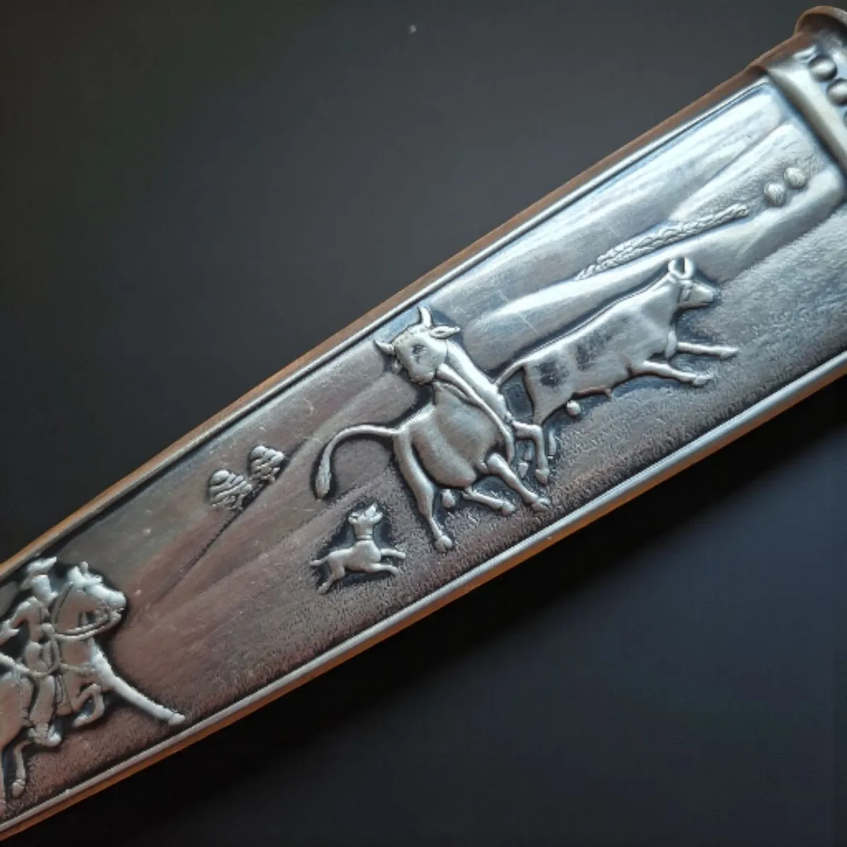 Uma peça que traduz a alma do sul do Brasil. Esta faca gaúcha, com cabo e bainha ricamente cinzelados em motivos campeiros — cavaleiros, cavalos e elementos da vida no campo — representa a estética tradicional da indumentária sulista e a profunda ligação do gaúcho com sua lida e sua terra.