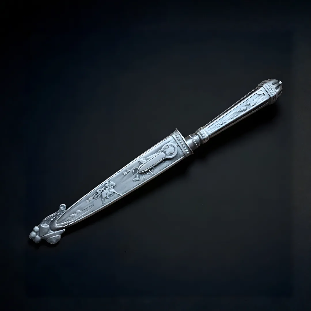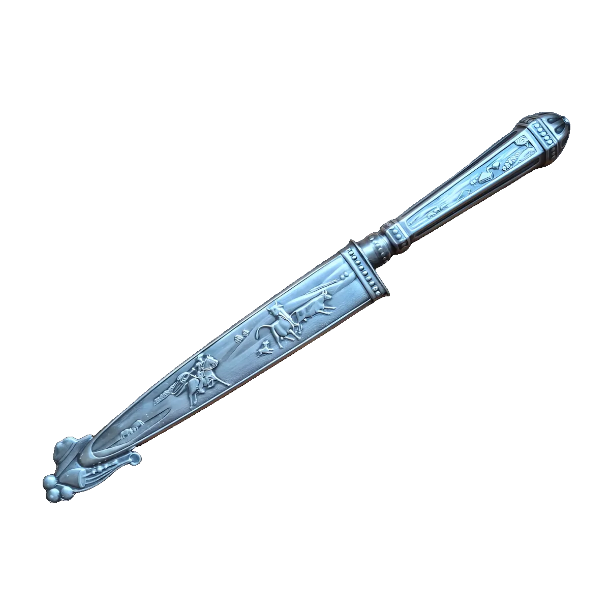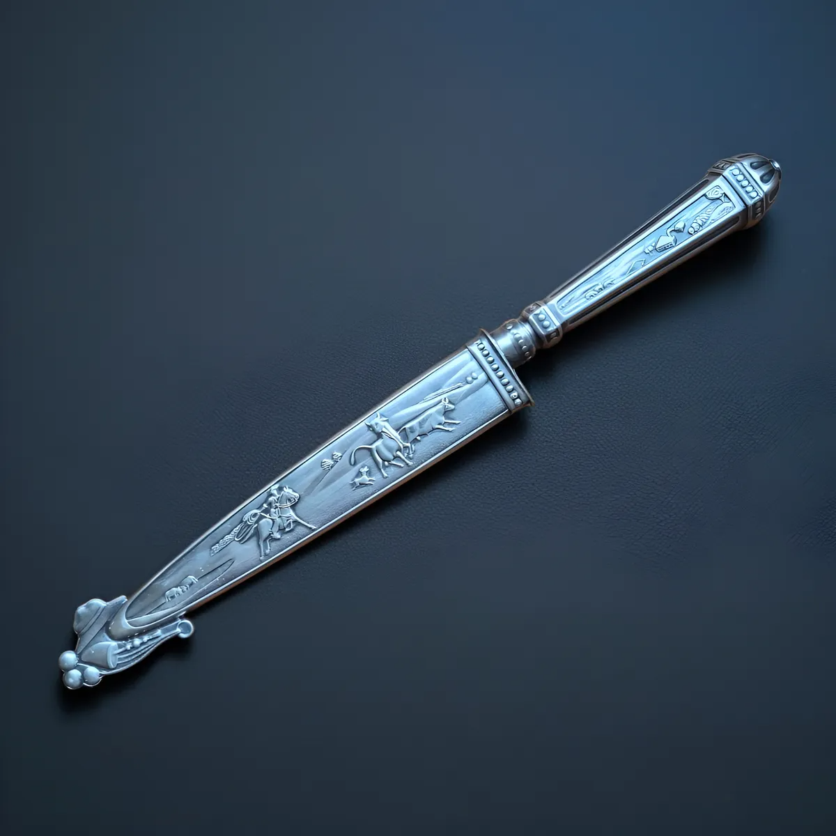 Uma peça que traduz a alma do sul do Brasil. Esta faca gaúcha, com cabo e bainha ricamente cinzelados em motivos campeiros — cavaleiros, cavalos e elementos da vida no campo — representa a estética tradicional da indumentária sulista e a profunda ligação do gaúcho com sua lida e sua terra.