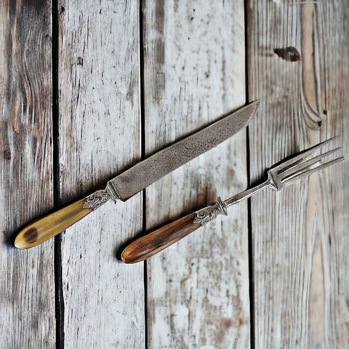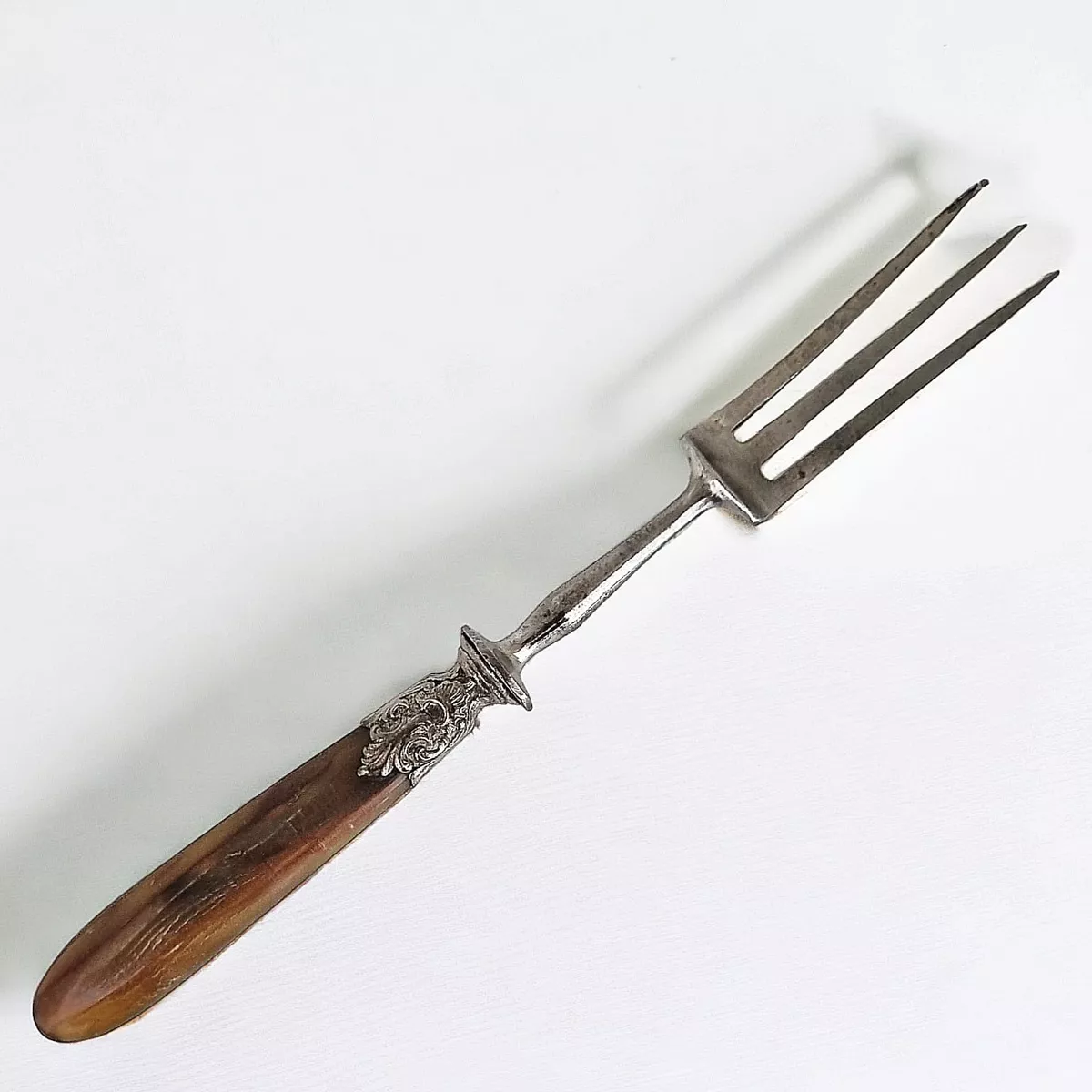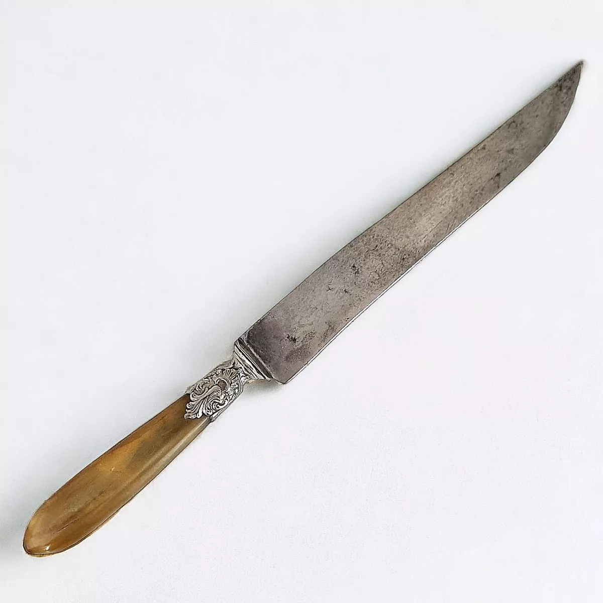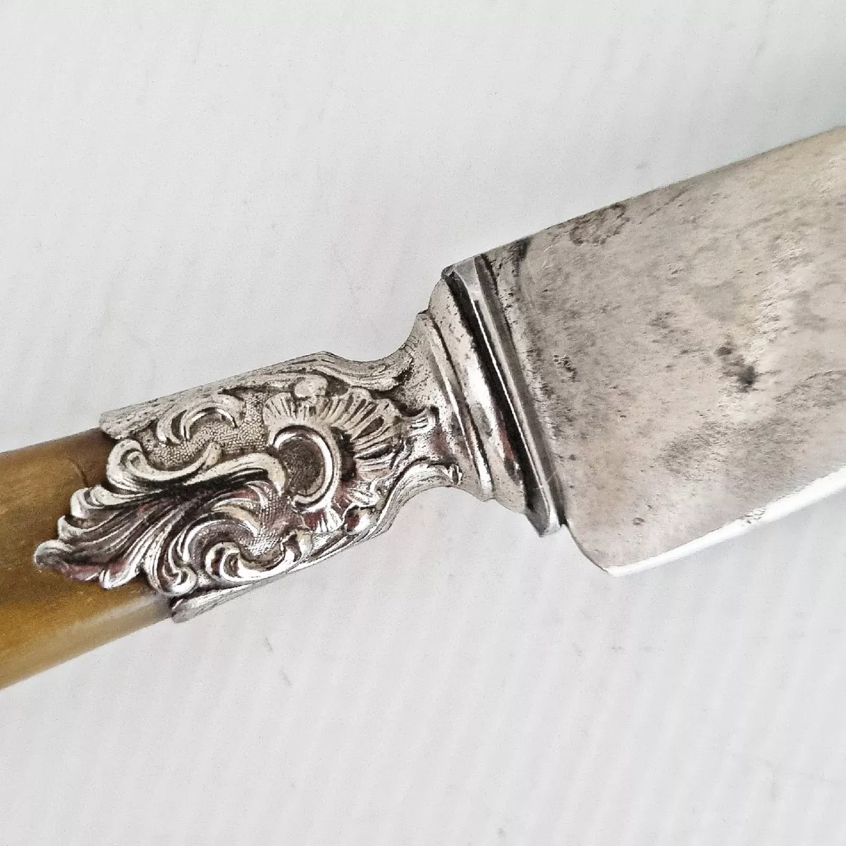 Lindo e antigo conjunto trinchante composto por 1 garfo e 1 faca com lamina em aço marcado G.F.G garanti. Ambos com cabo de chifre e fino acabamento em metal prateado ricamente cinzelado. O conjunto trinchante tem uma história que remonta aos tempos antigos, quando as refeições eram frequentemente servidas em grandes banquetes e era necessária uma ferramenta especializada para cortar e servir carne de maneira eficiente. Trinchantes eram originalmente especialistas em esculpir e preparar carne em grandes eventos. Com o tempo, à medida que a culinária evoluiu e as refeições tornaram-se mais refinadas, o conjunto trinchante se tornou uma peça essencial nas cozinhas domésticas. Tradicionalmente, esses conjuntos incluem facas específicas para cortar carne, garfos trinchantes e, às vezes, uma chaira para afiar as lâminas.
