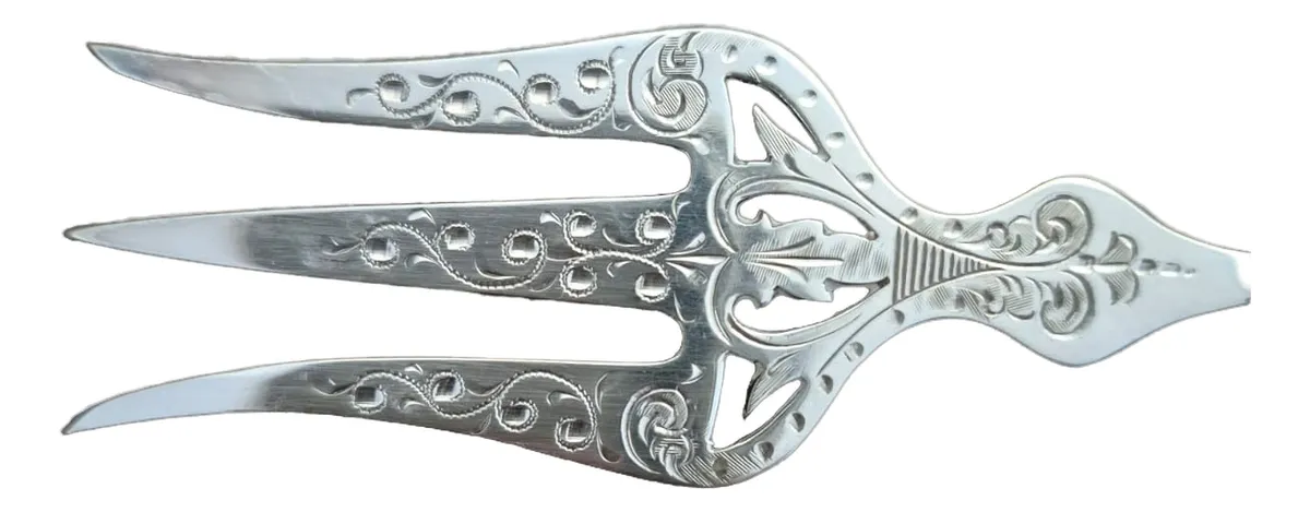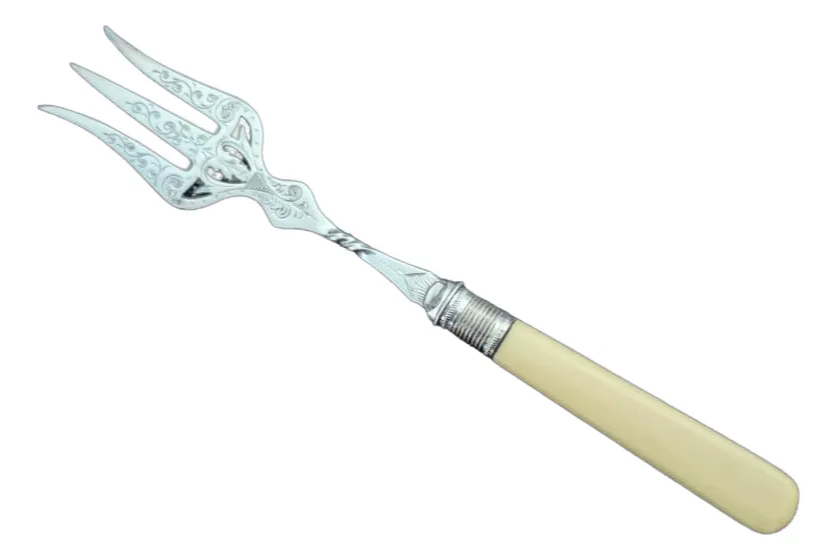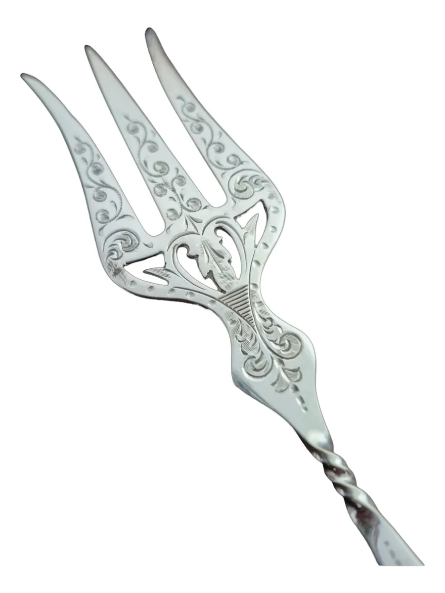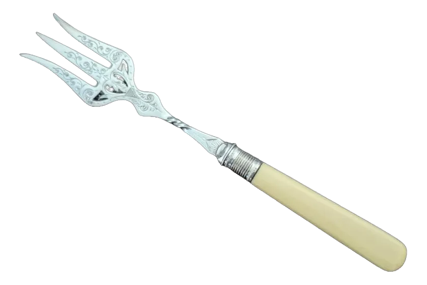 Antigo garfo de serviço para carne em metal prateado e cabo de osso.Mede: 21 cm