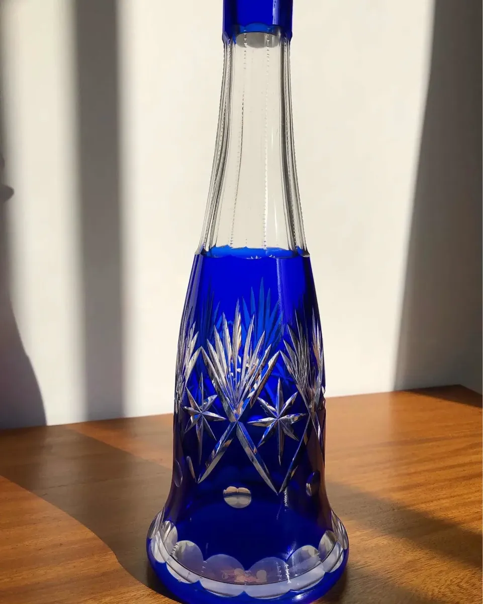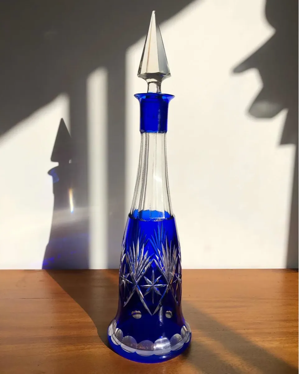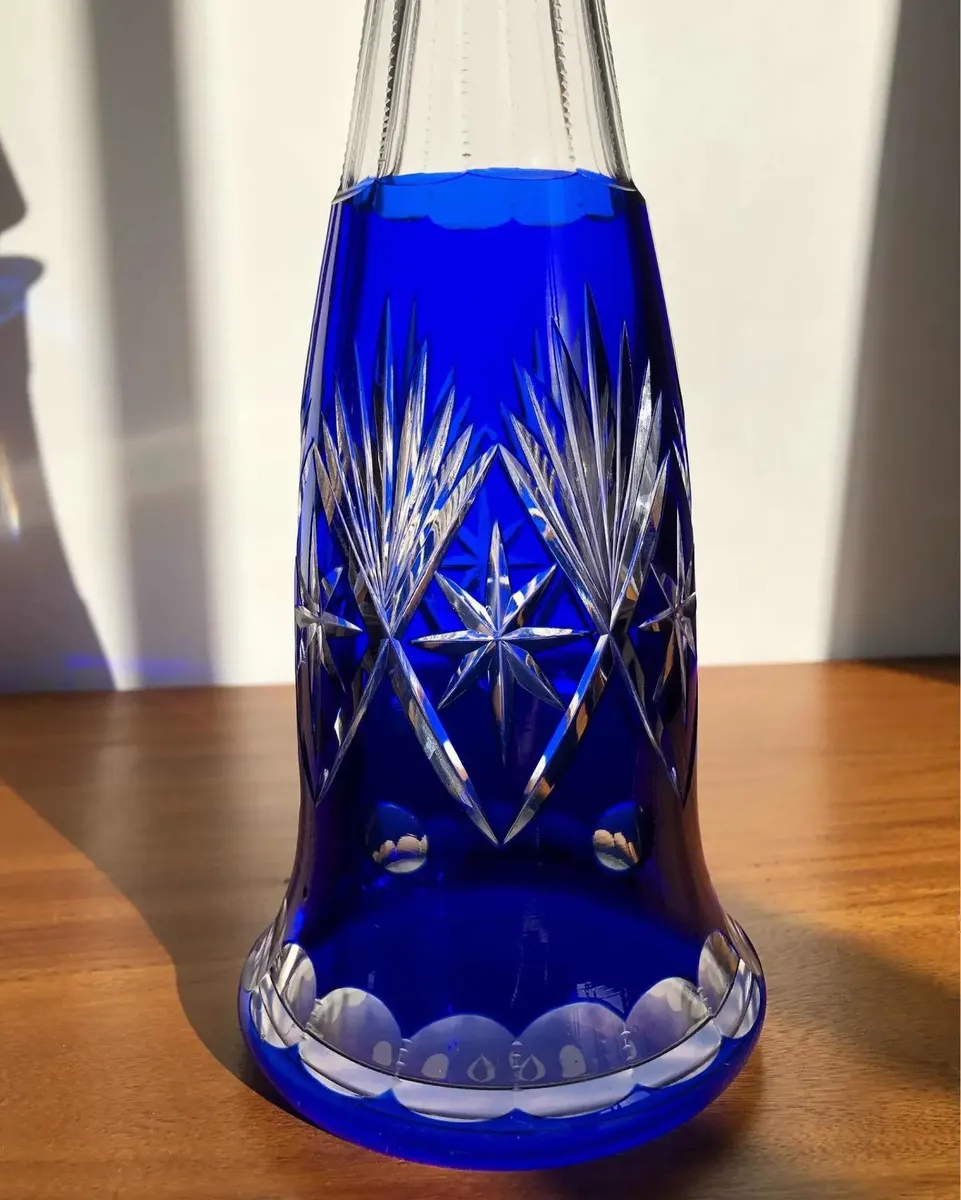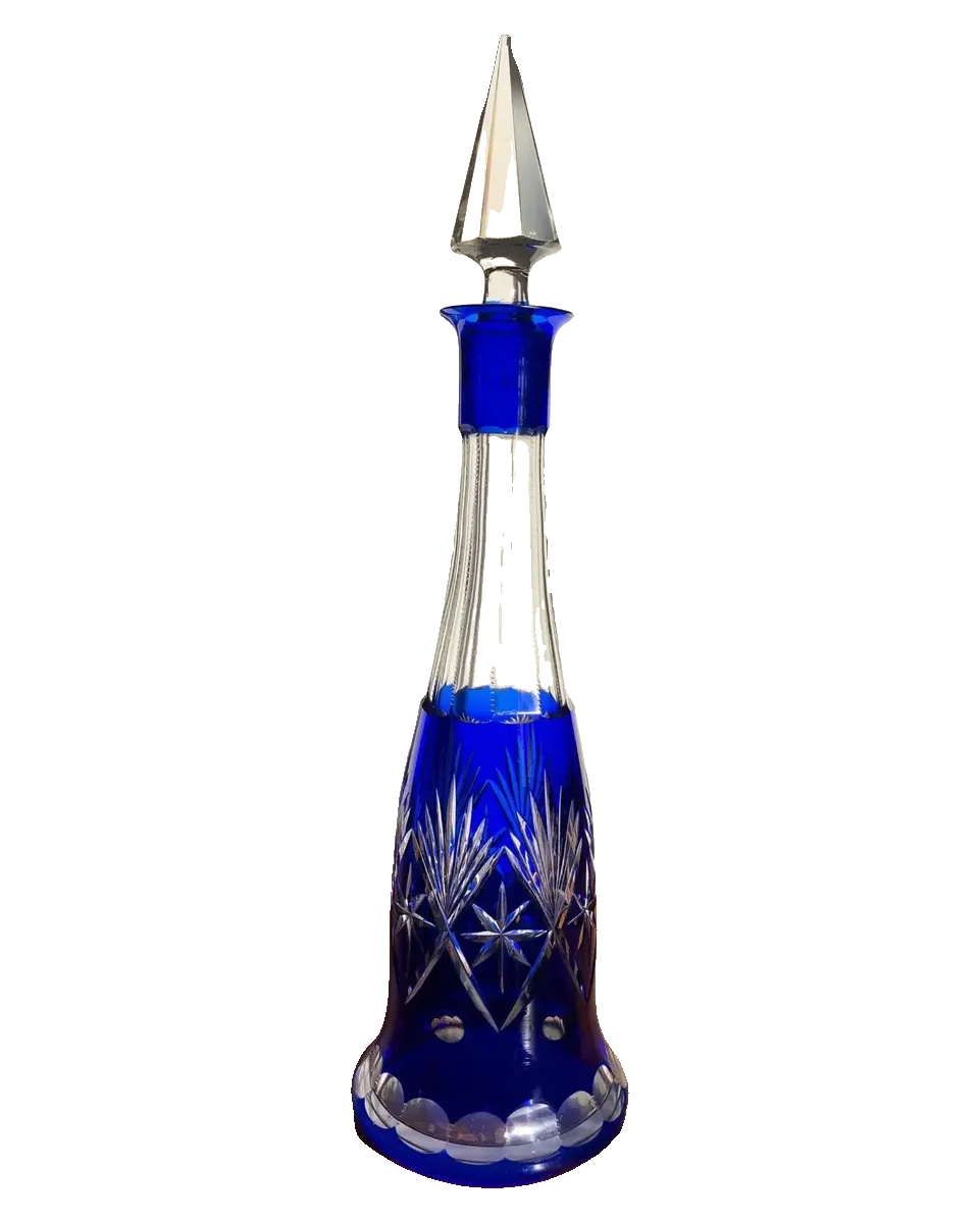 Antiga e grande garrafa em cristal Baccarat doublé na cor azul. Toda lapidada à mão. Início do século XX. Em excelente estado de conservação. Peça centenária e toda original de época.