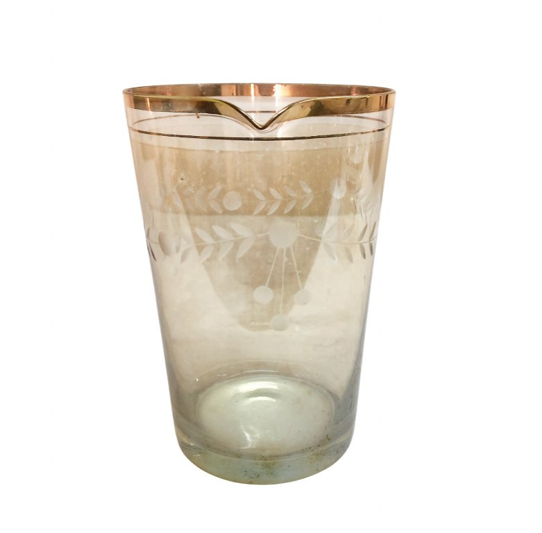 Antiga jarra para drink na tonalidade âmbar com lapidação manual e borda com filete dourado.
