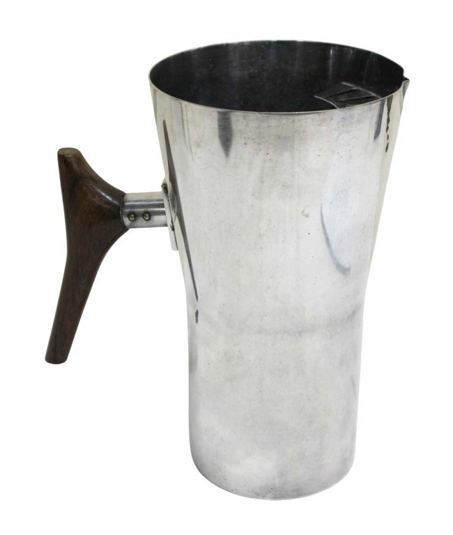 Antiga refresqueira em metal espessurado a prata, em formato cônico, da manufatura Wolff com charmosa pega em jacarandá da Bahia. Apresenta separador interno de gelo.