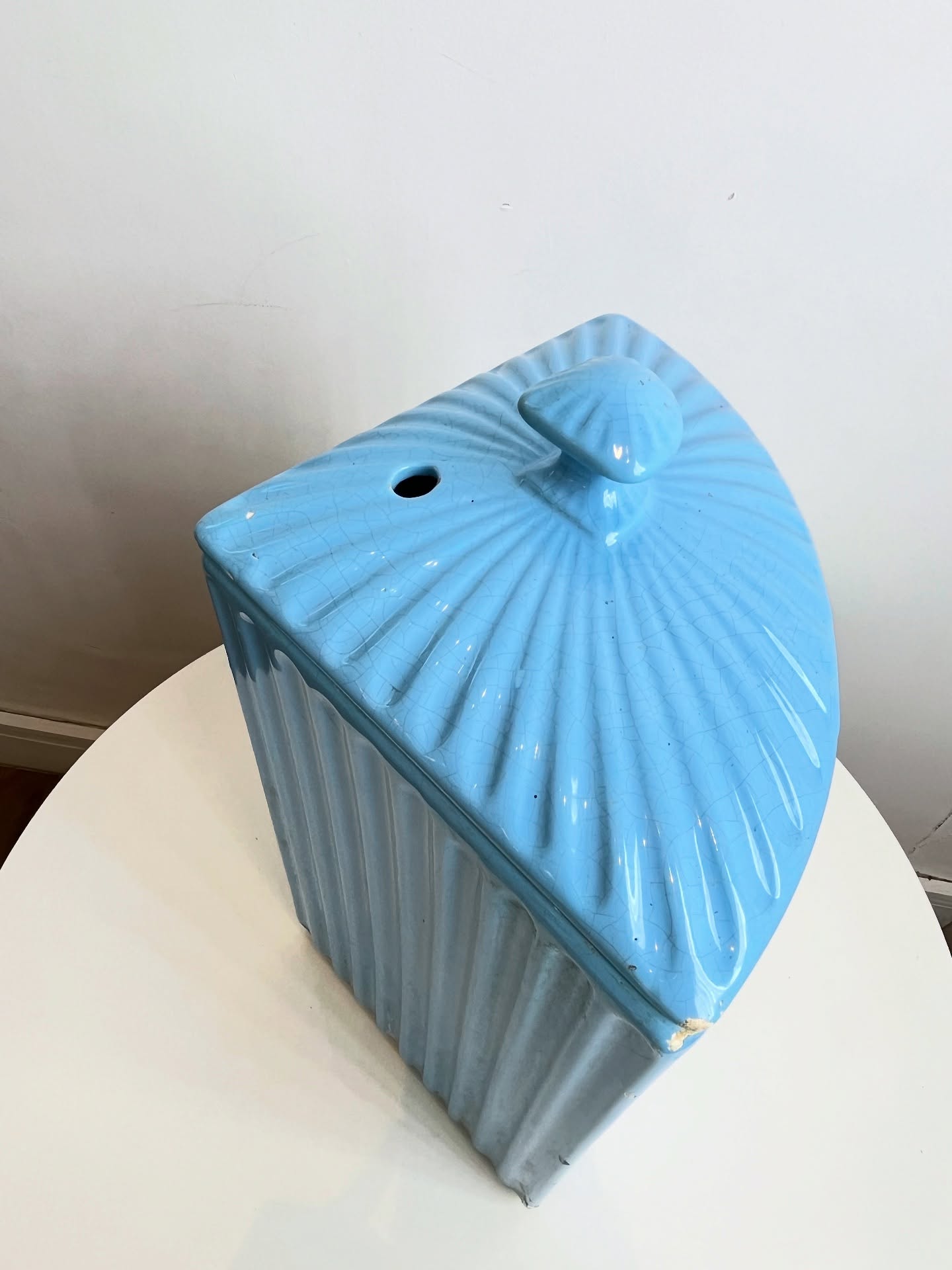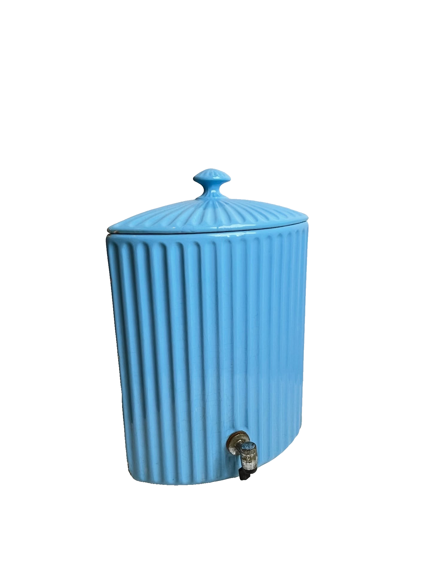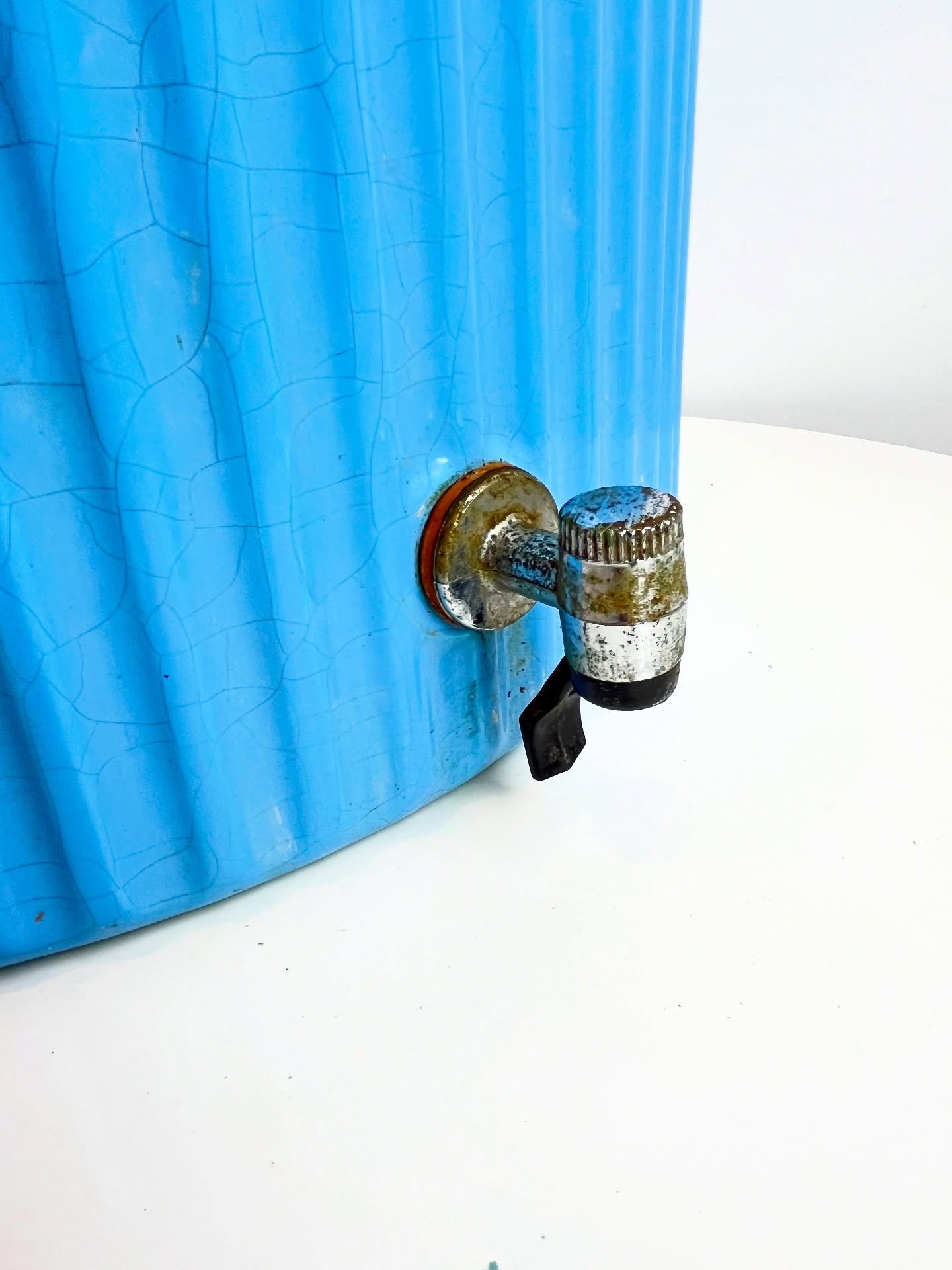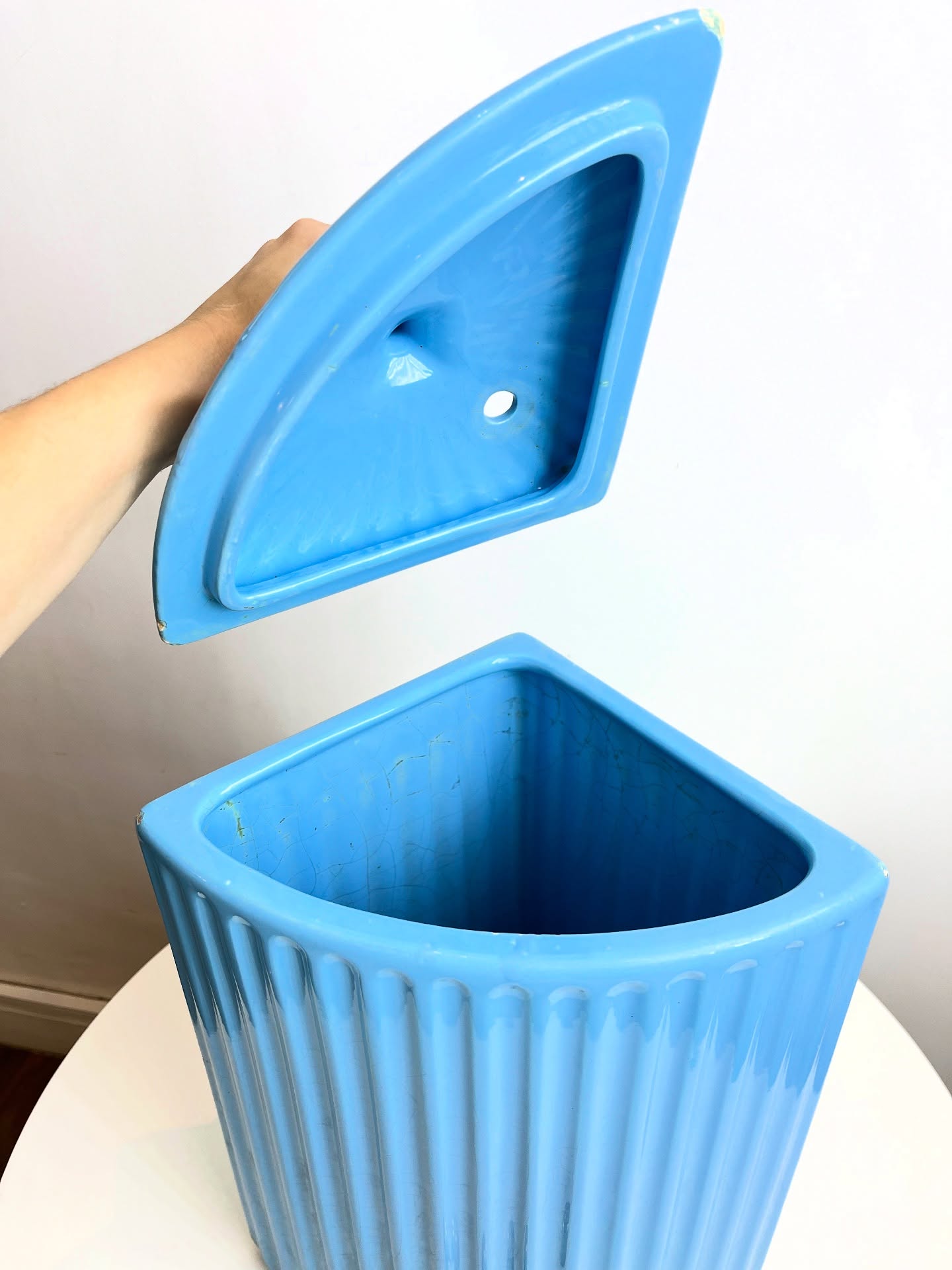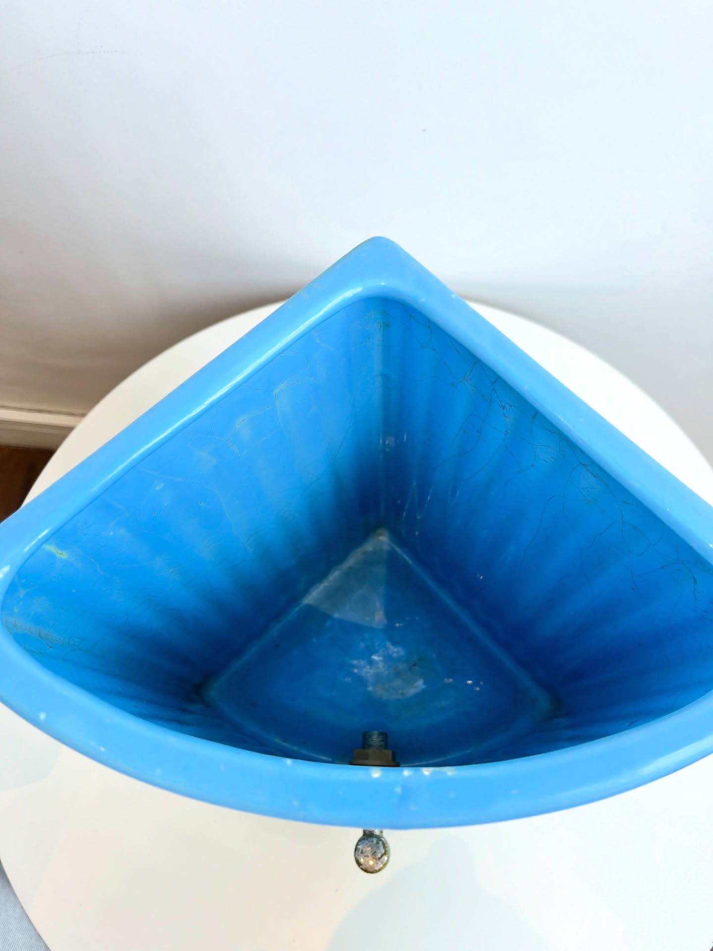 Grande talha em cerâmica esmaltada azul clara, para cantos 90 graus. Apresenta vários lascados como mostrado nas fotos. Precisa trocar o bocal do filtro.
