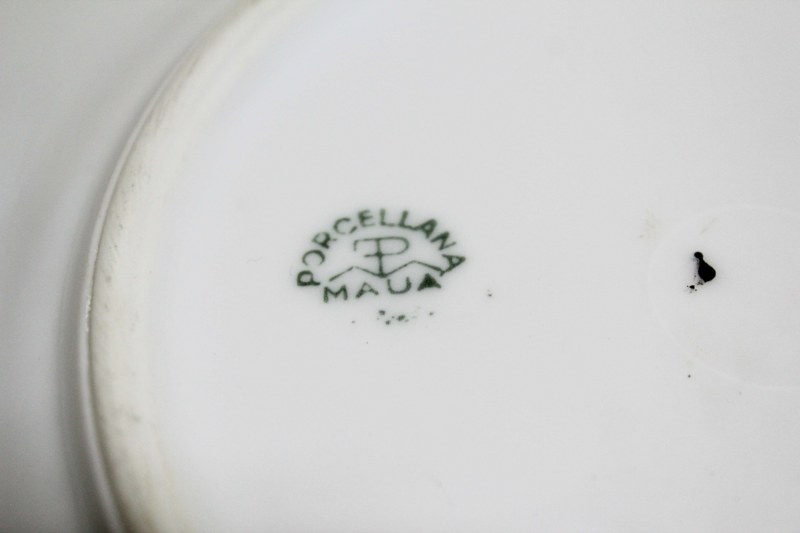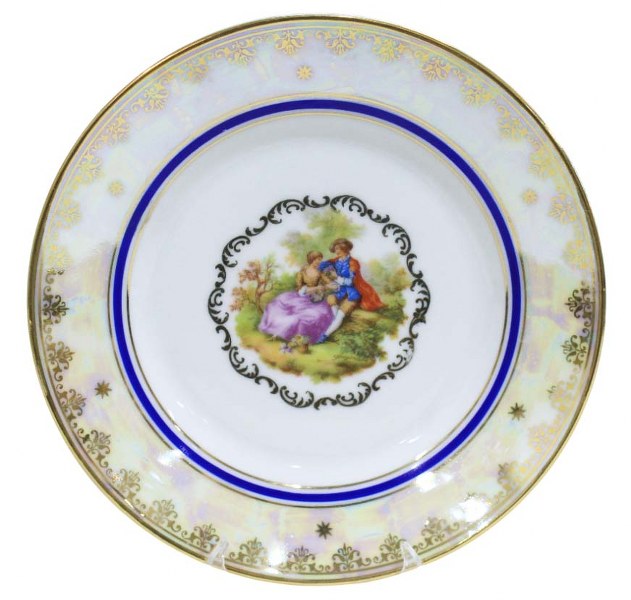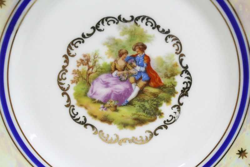 Conjunto de 05 pratos para sobremesa em porcelana branca perolizada, com filetes dourado e faixa azul cobalto. Apresenta cena galante ( Fragonard) da manufatura MAUA.