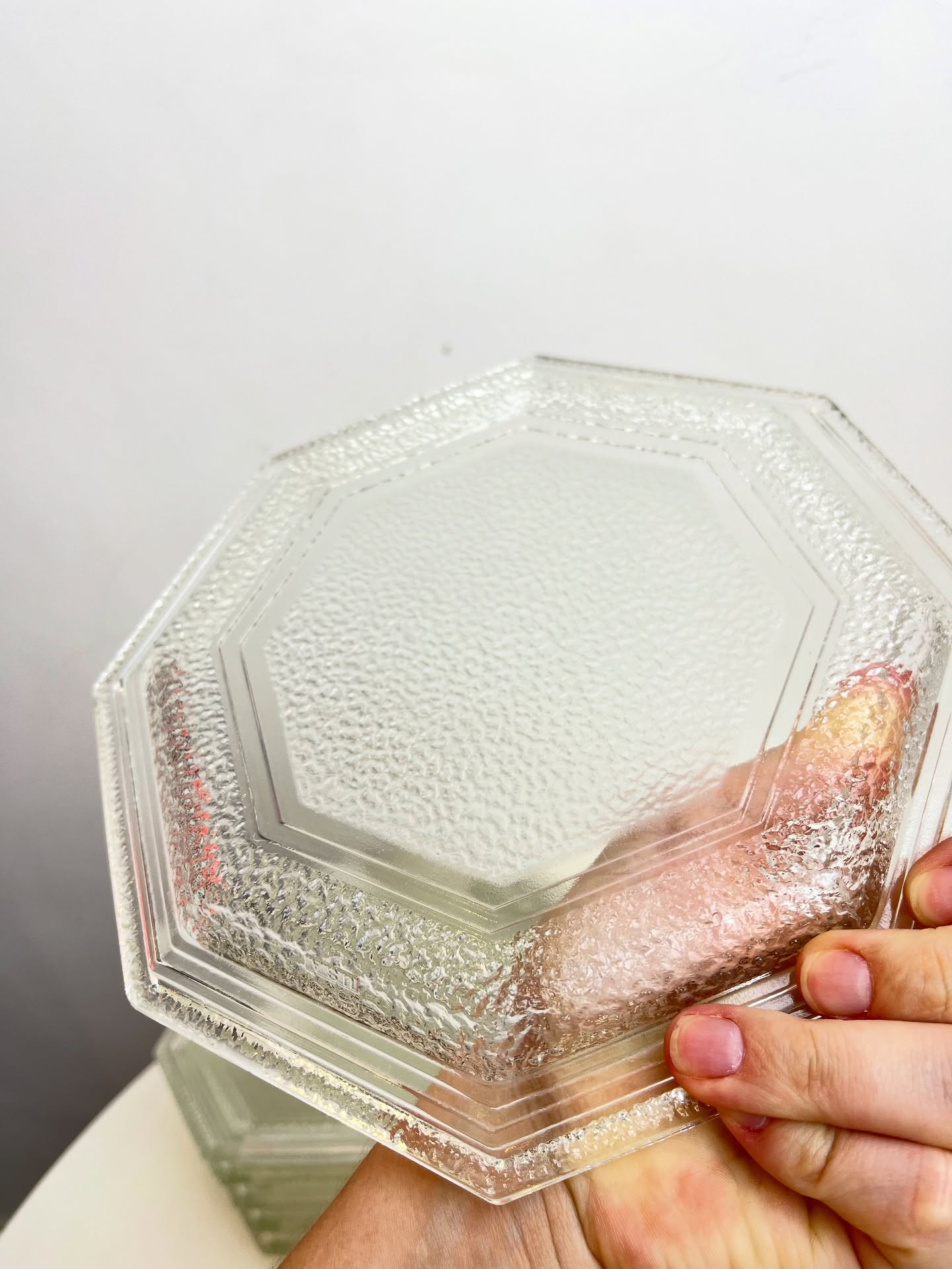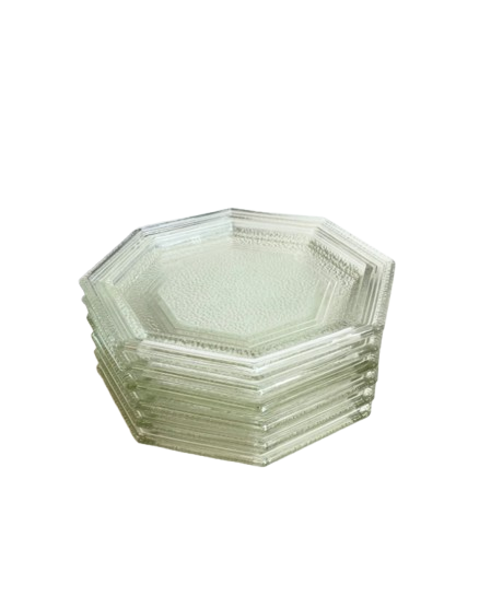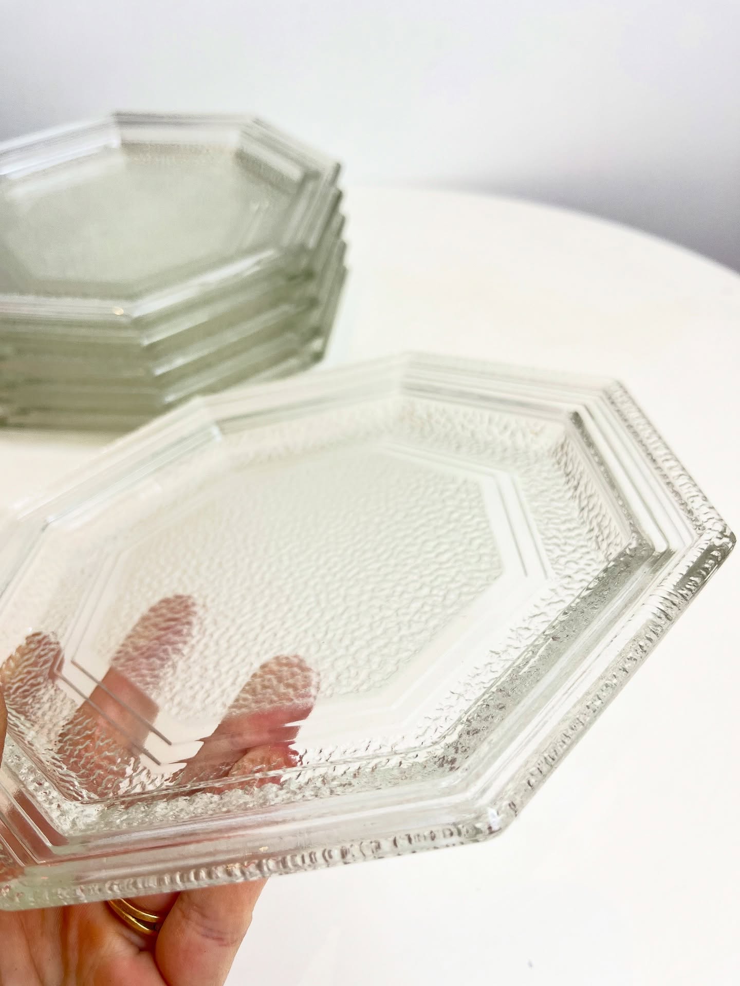 Jogo com 6 pratos de sobremesa em vidro texturizado, da década de 70. Perfeito estado.