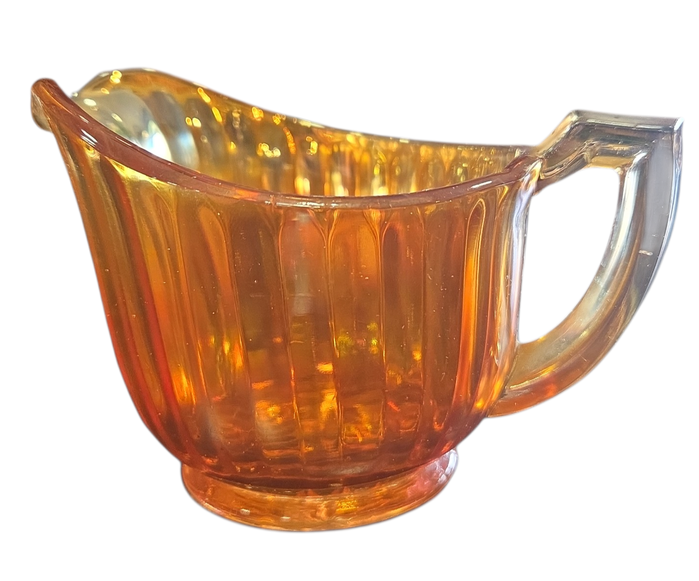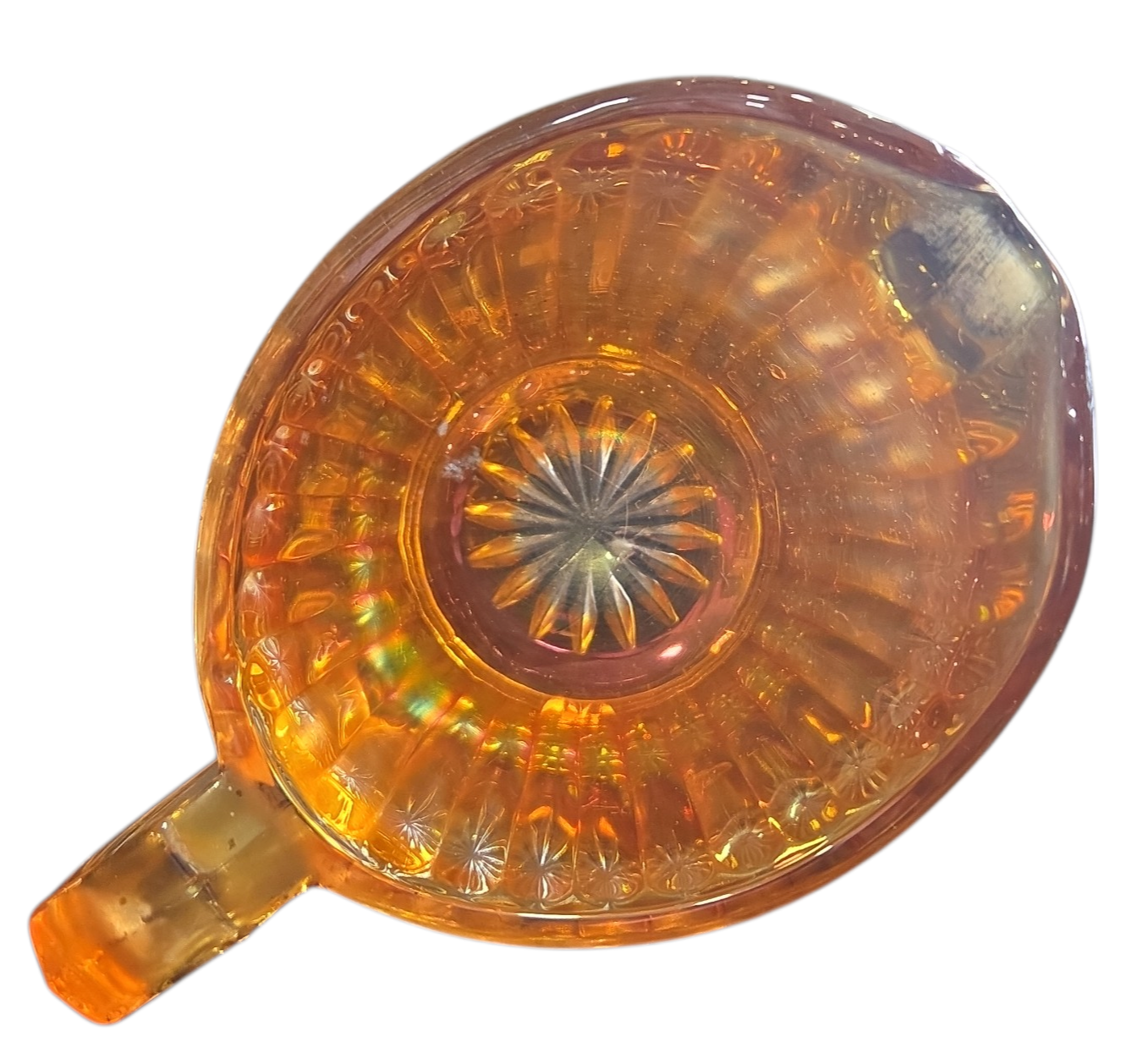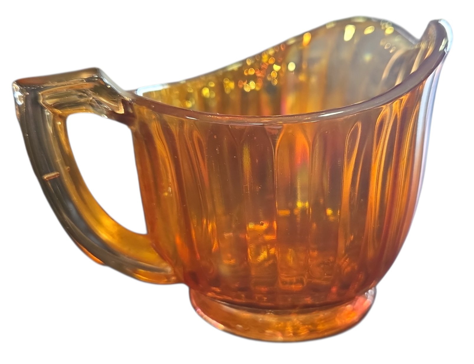 Adicione um toque de sofisticação e nostalgia ao seu café da tarde. Esta cremeira em estilo Carnival Glass é uma peça que brilha por si só, refletindo cores do arco-íris em sua superfície acetinada. Ideal para servir com elegância ou para decorar cristaleiras e nichos.