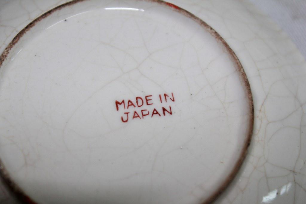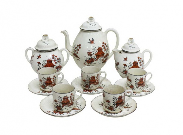 Antigo conjunto para café com 8 peças em louça na tonalidade bege, com decoração típica oriental nas tonalidades laranja e preto, MADE IN JAPAN selada nas peças.