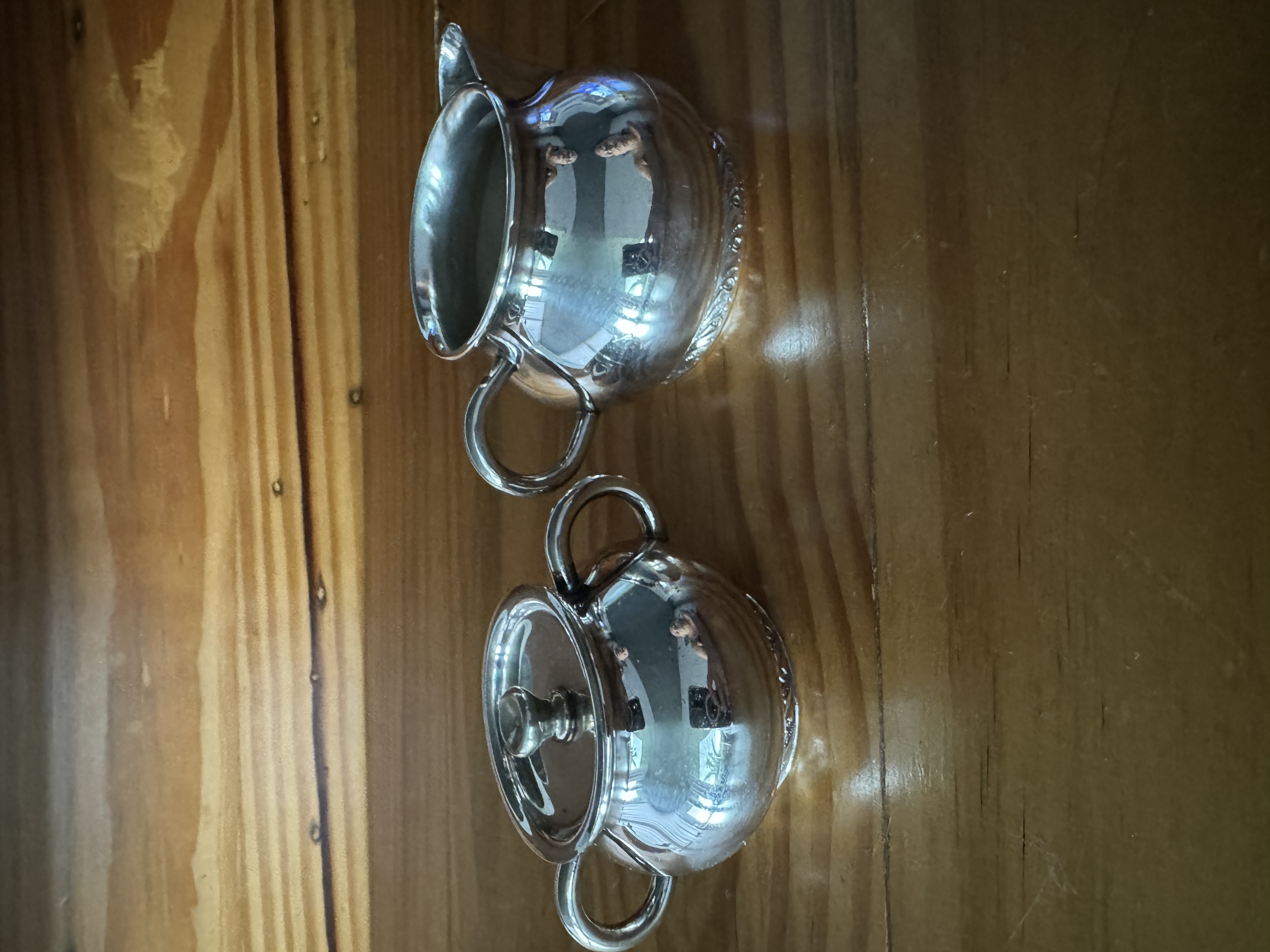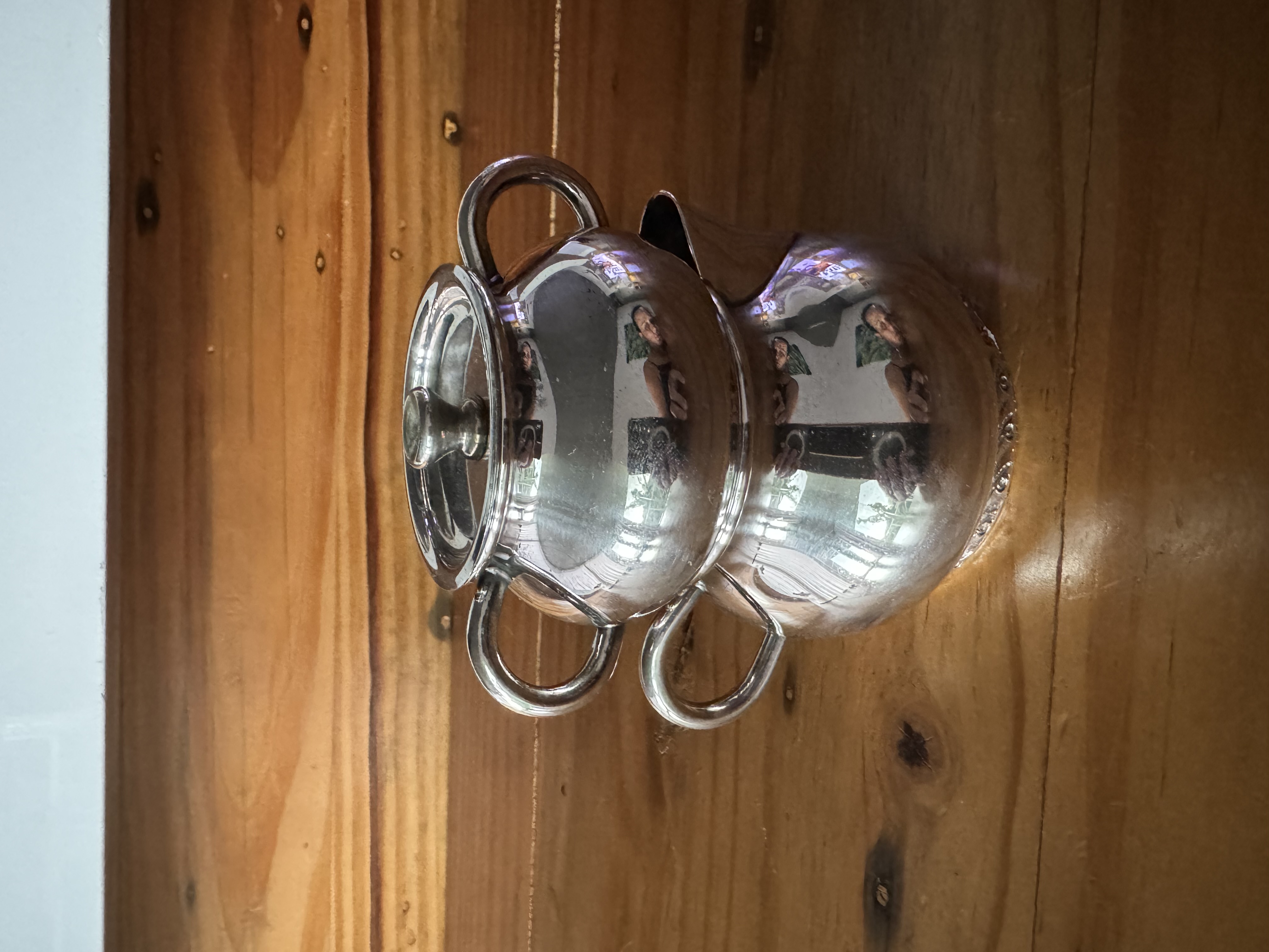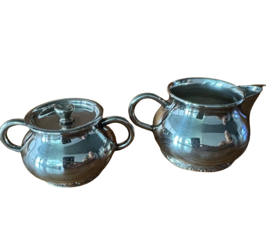 Conjunto clássico de mesa composto por açucareiro com tampa e cremeira, em prata 90 Wolff.
