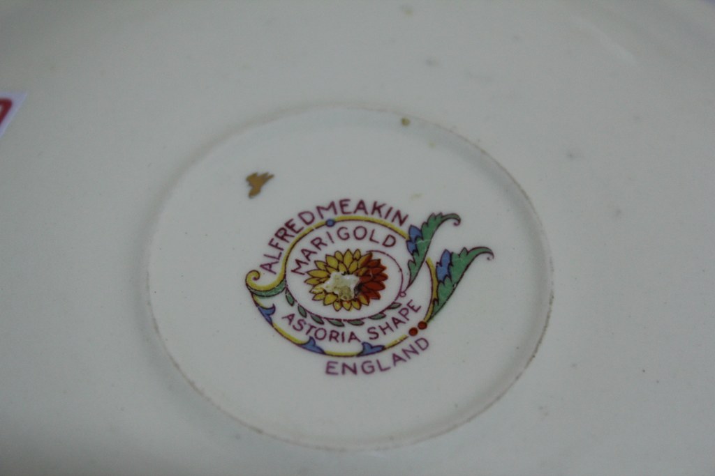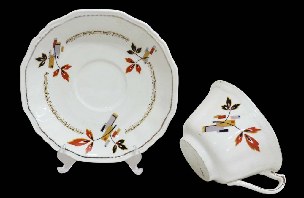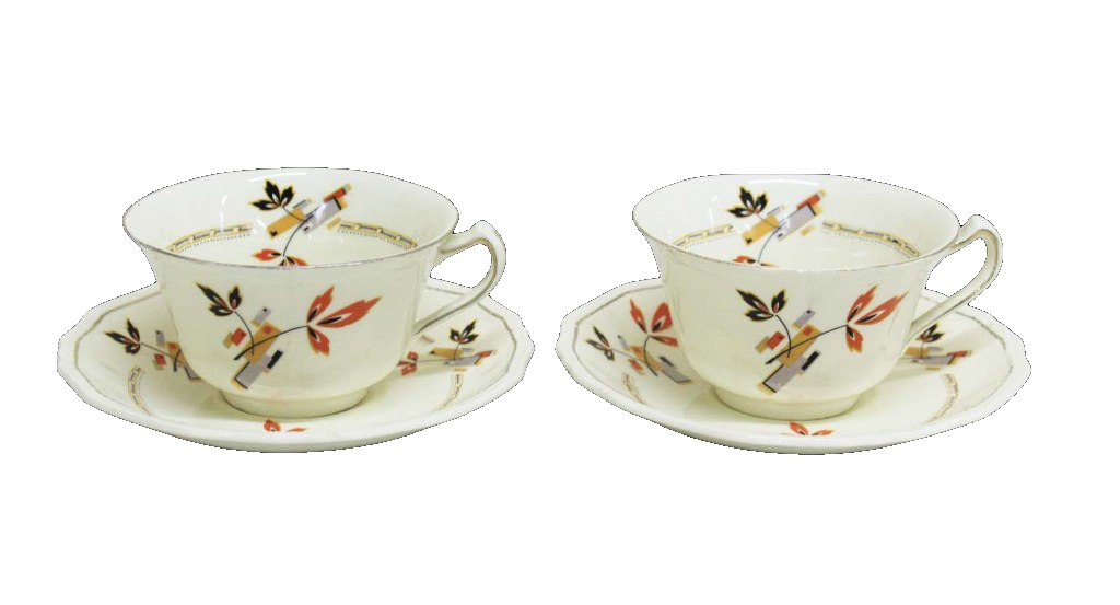 Delicado par de xícaras para chá inglesas, em louça na tonalidade creme. . Decoração no padrão Marigold, folhas estilizadas em vermelho alaranjado, preto e dourado combinadas com formas geométricas ( retângulos e linhas) típicas do estilo Art Deco dos anos 1920/1930. A mistura de motivos florais e geométricos modernos, característicos do período de transição Vitoriano e Art Deco. Da manufatura ALFRED MEAKIN - MARIGOLD - ASTORIA SHAPE- ENGLAND.