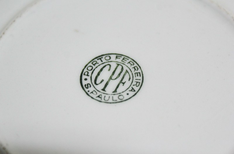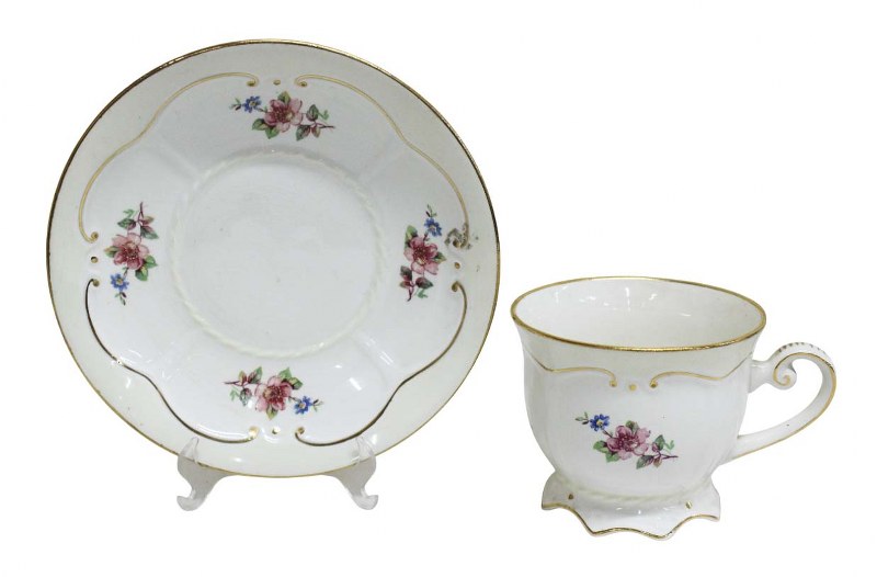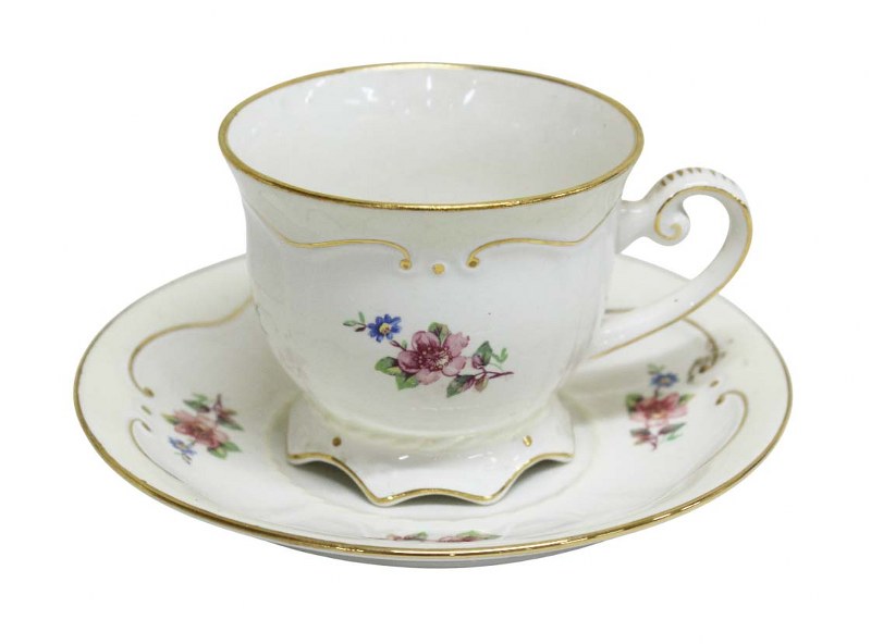 Linda e imponente xícara de chá para coleção em louça, com decoração floral em policromia e filetes dourados. Da manufatura PORTO FERREIRA S.PAULO.
