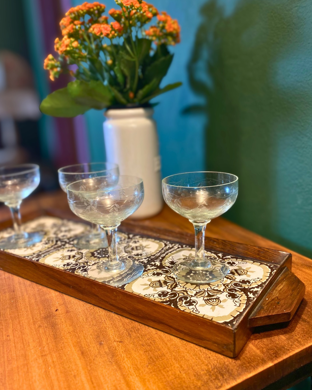 Bandeja Vintage de Madeira nobre de JACARANDÁ ornada com azulejos floridos nos tons de preto e cinza em design moderno e estilizado.