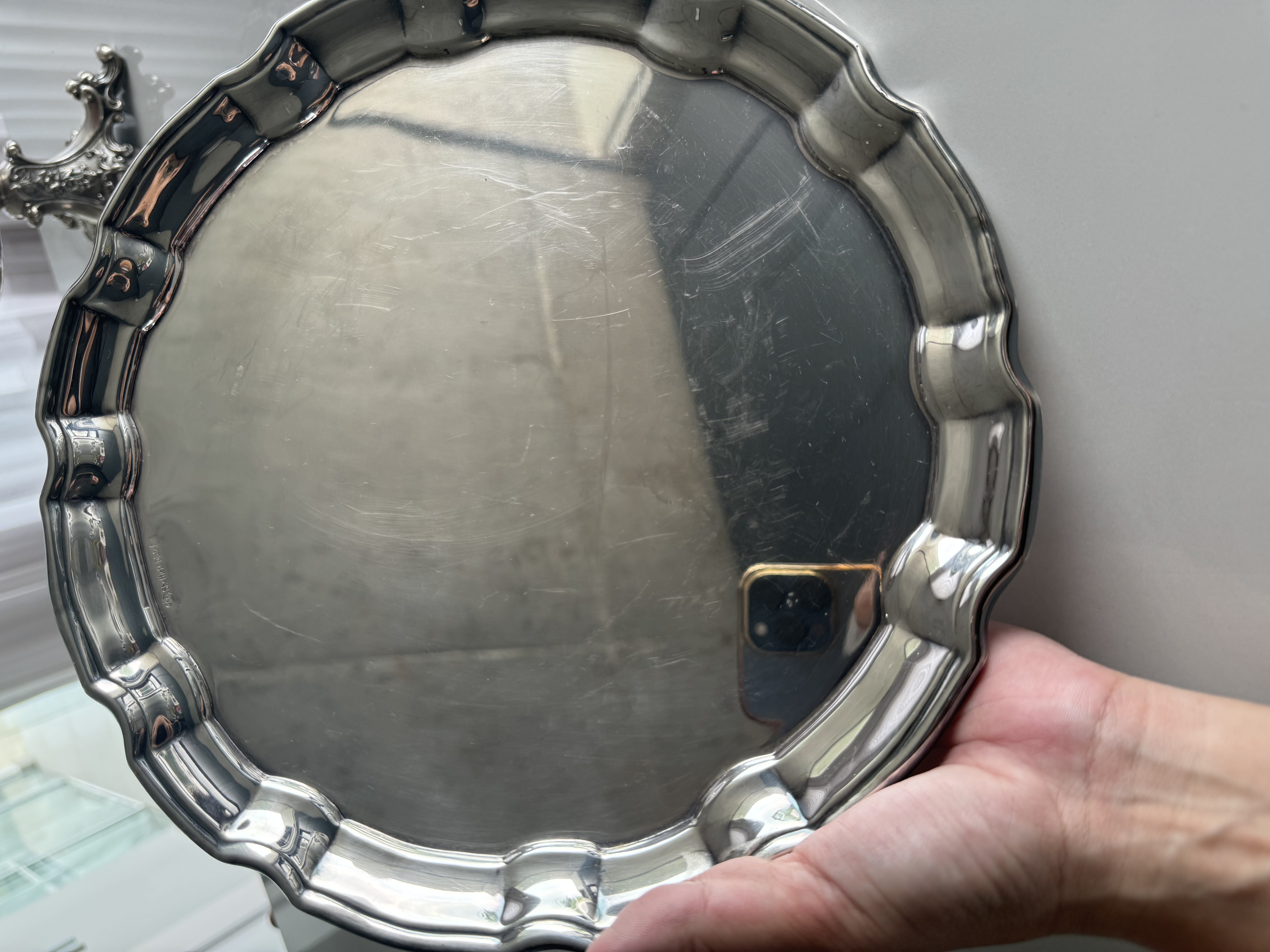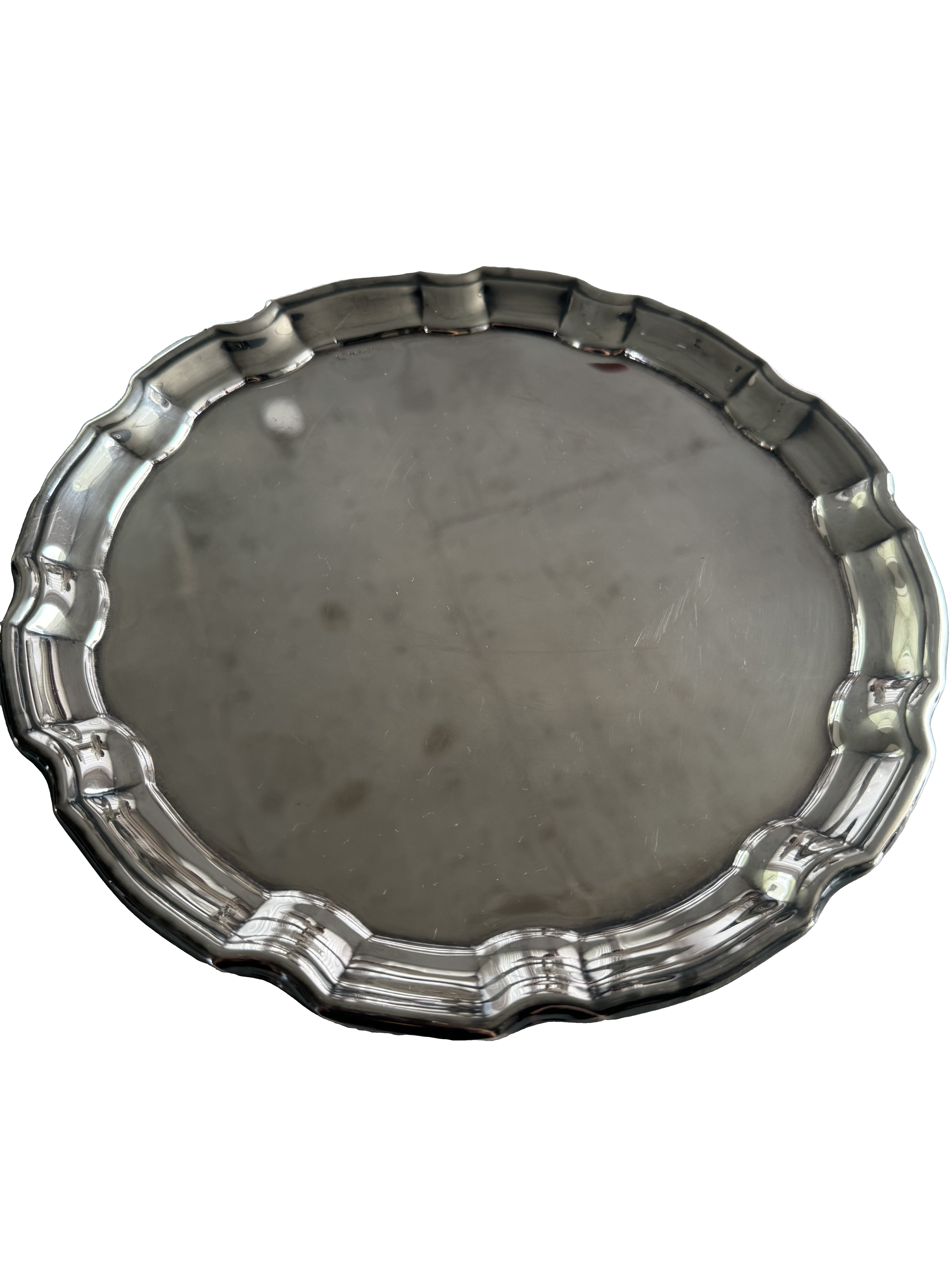 Bandeja em Sheffield Plate, com borda recortada e ondulação tradicional — desenho atemporal que atravessa décadas sem perder elegância.