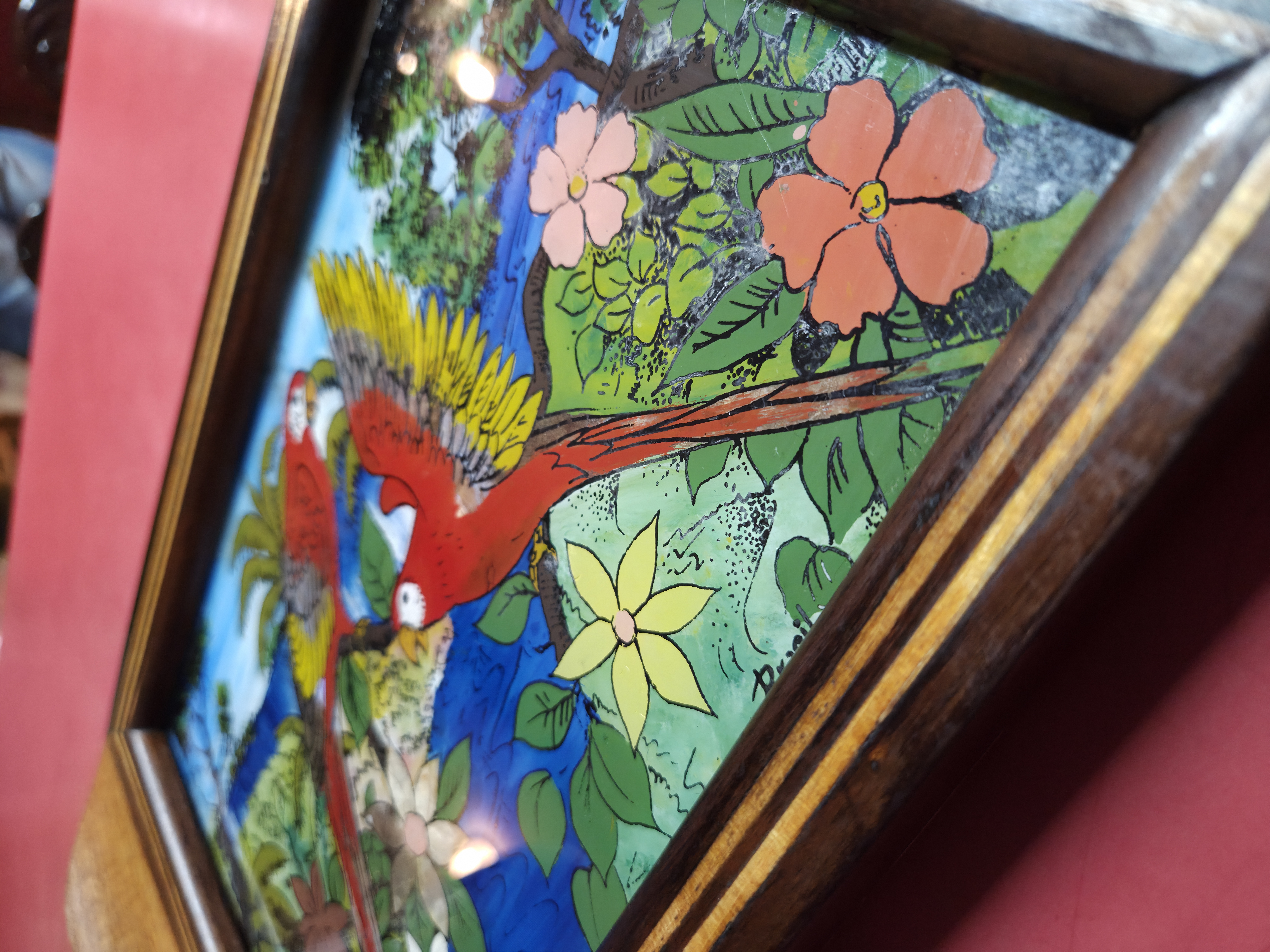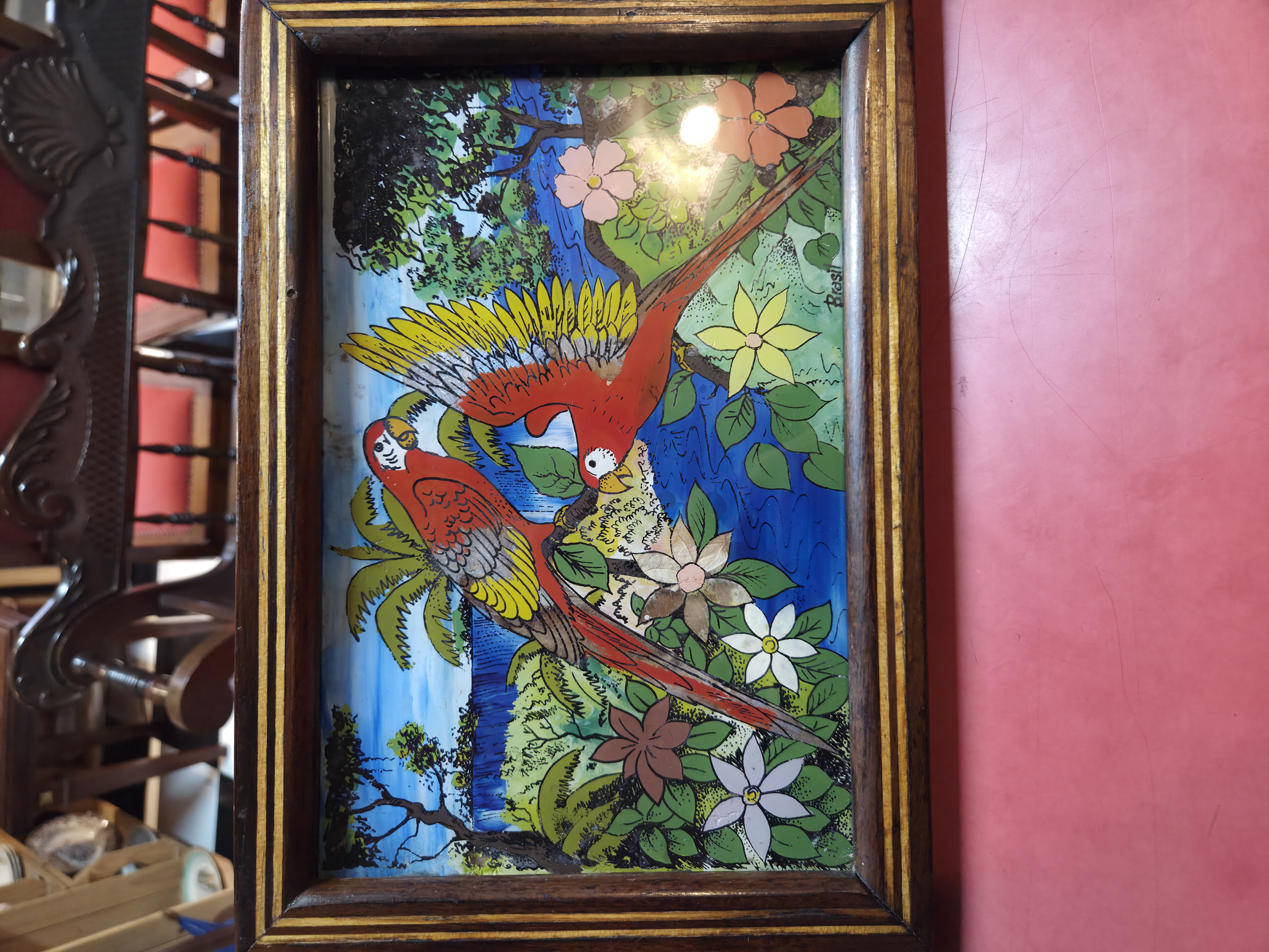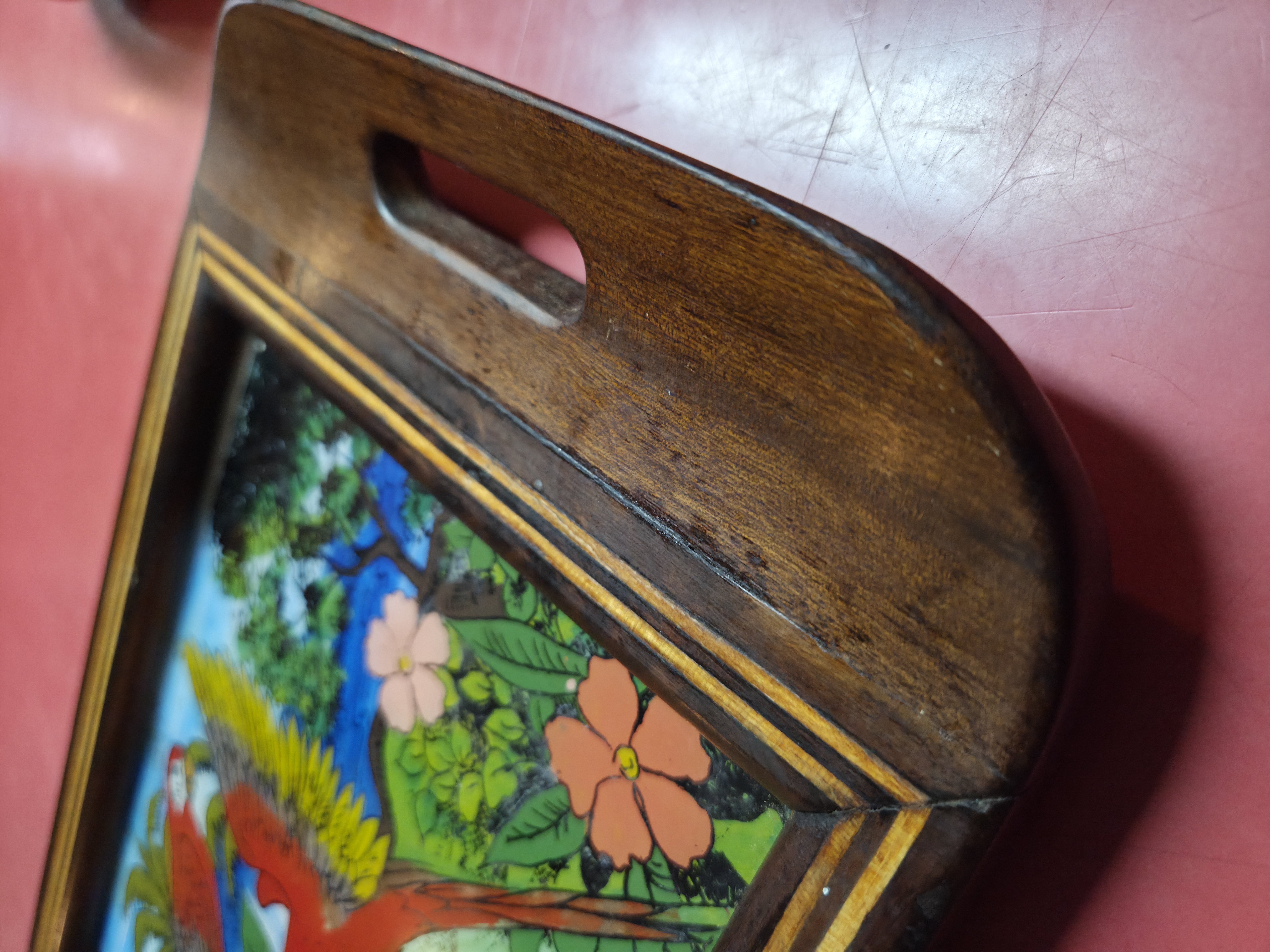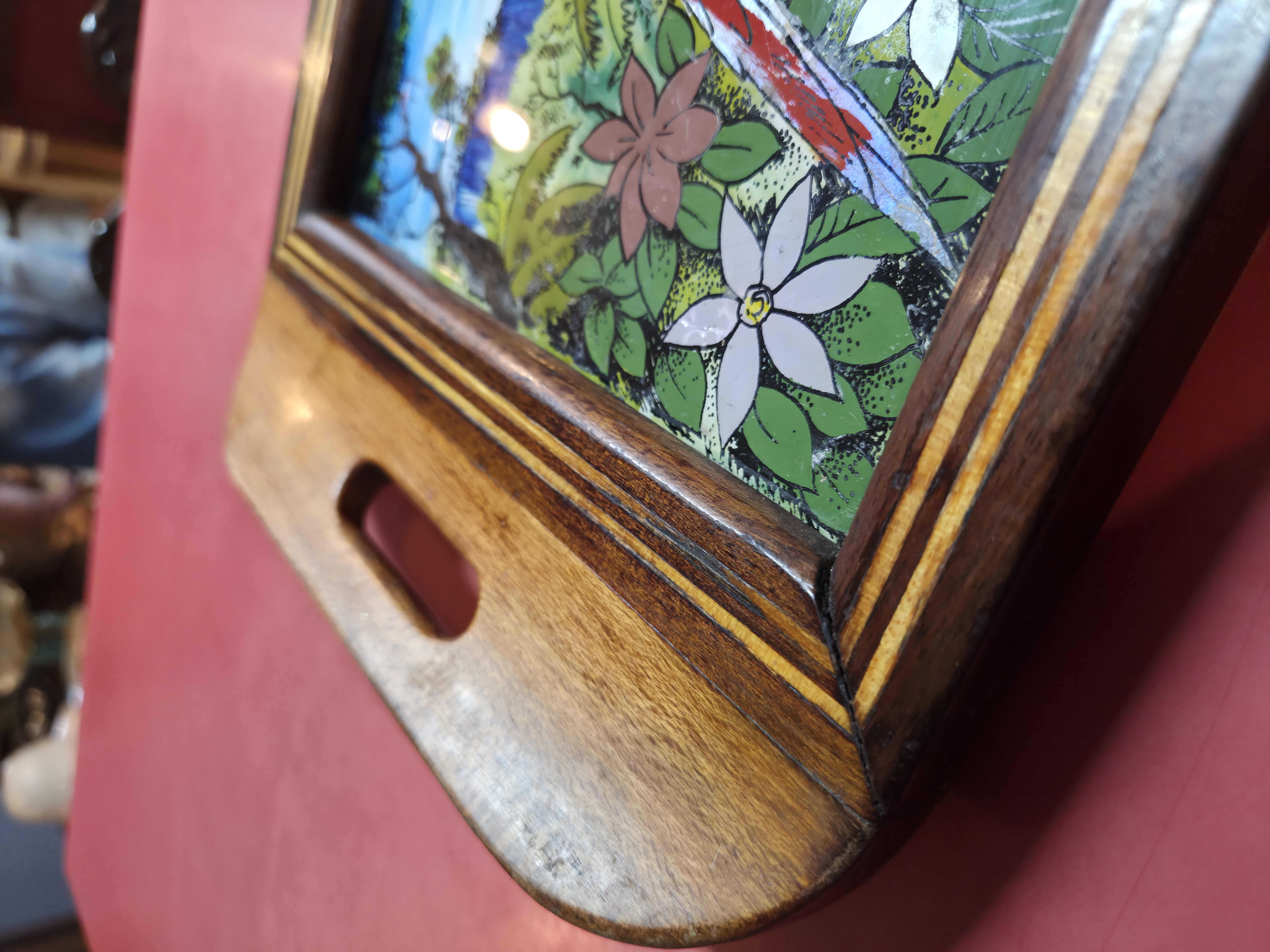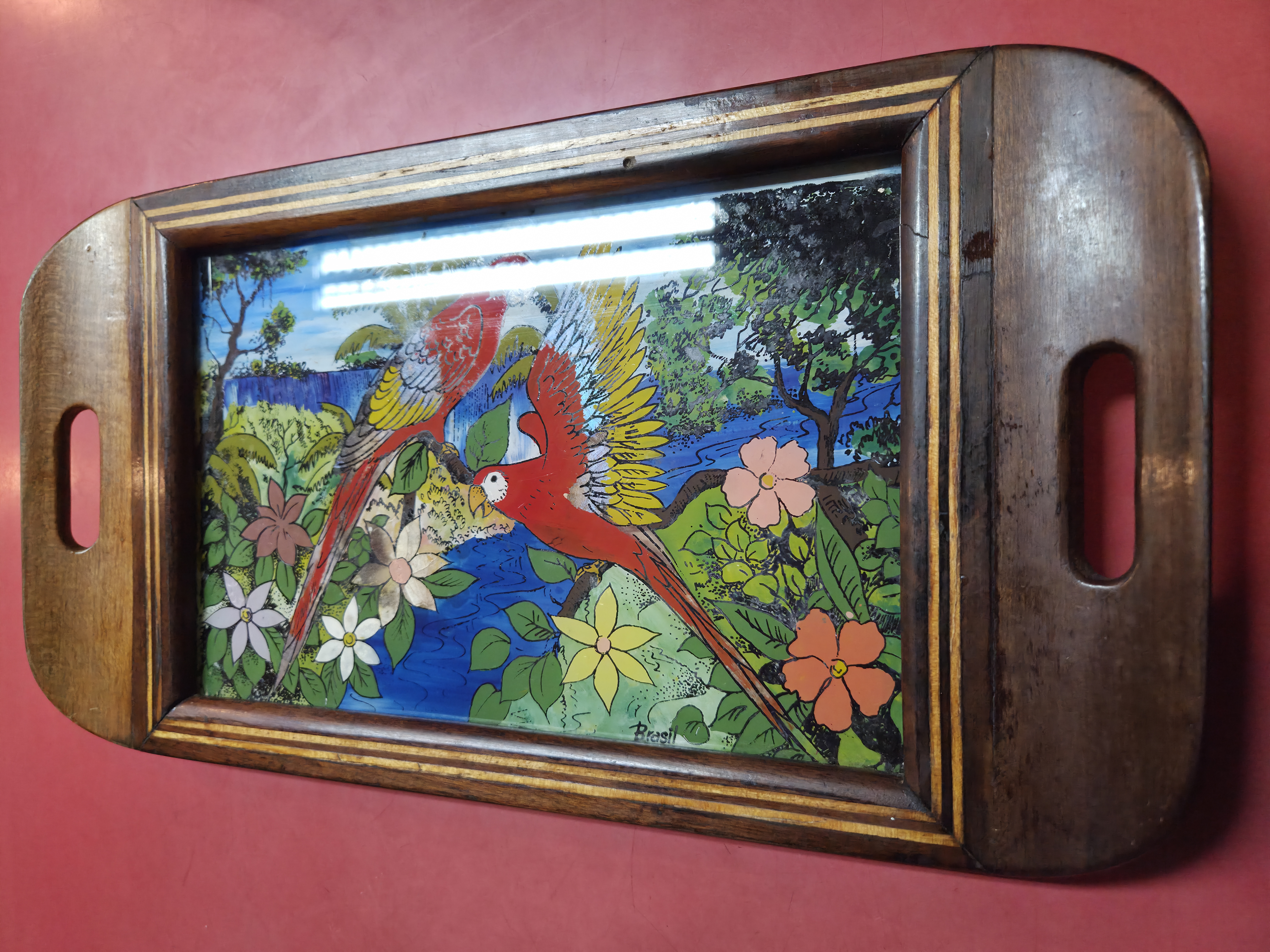 Bela bandeja antiga, um verdadeiro exemplar de artesanato artístico. A peça apresenta uma moldura robusta em madeira nobre com detalhes em marchetaria linear, proporcionando um contraste elegante. O centro é composto por uma pintura feita sob vidro, retratando uma cena tropical com araras e flora exuberante, enriquecida com a aplicação de asas de borboleta autênticas, que garantem um brilho iridescente natural único.