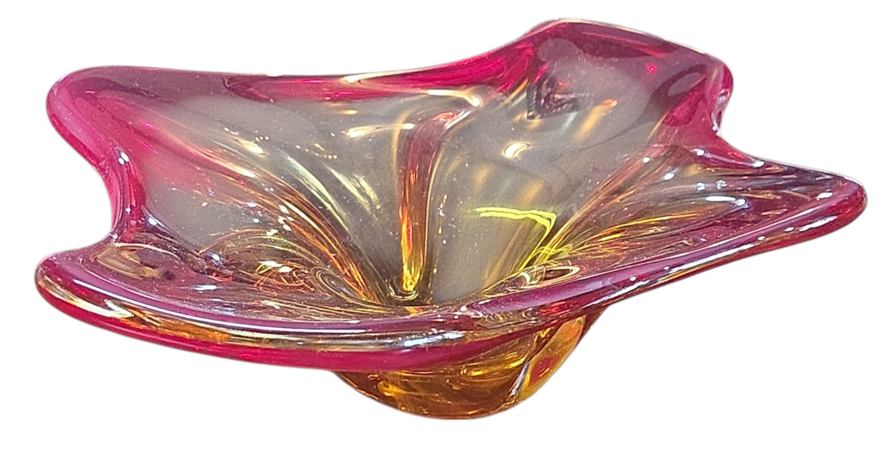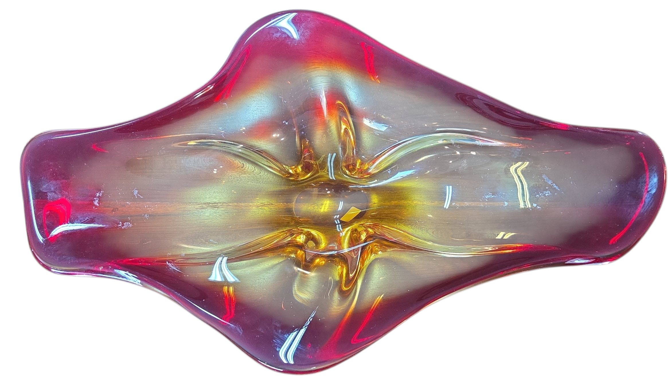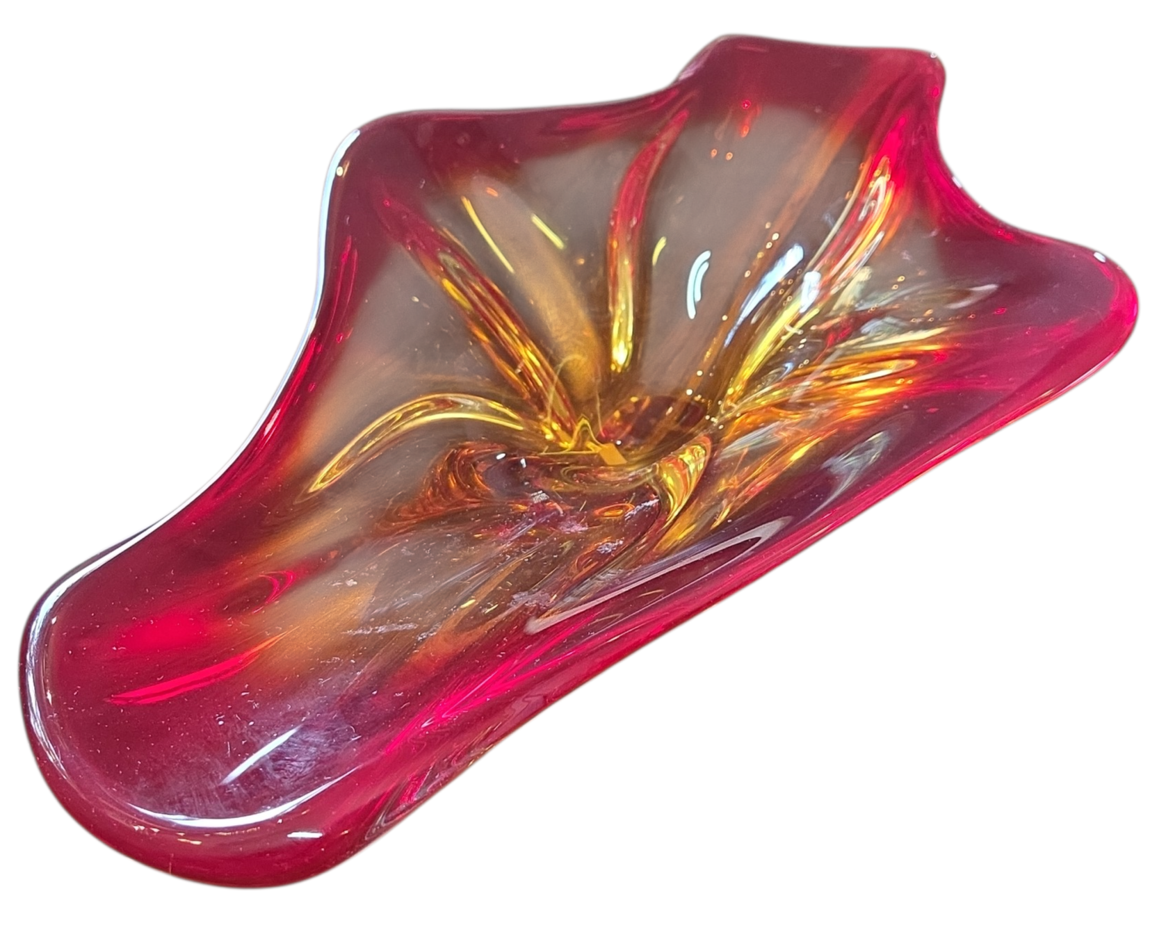 Esta peça é um exemplo magnífico da técnica de vidro artístico, apresentando um design fluido e orgânico que captura a luz de forma espetacular. A transição de cores entre o vermelho vibrante e o centro translúcido com reflexos dourados confere uma profundidade visual única, característica das melhores manufaturas de Murano.