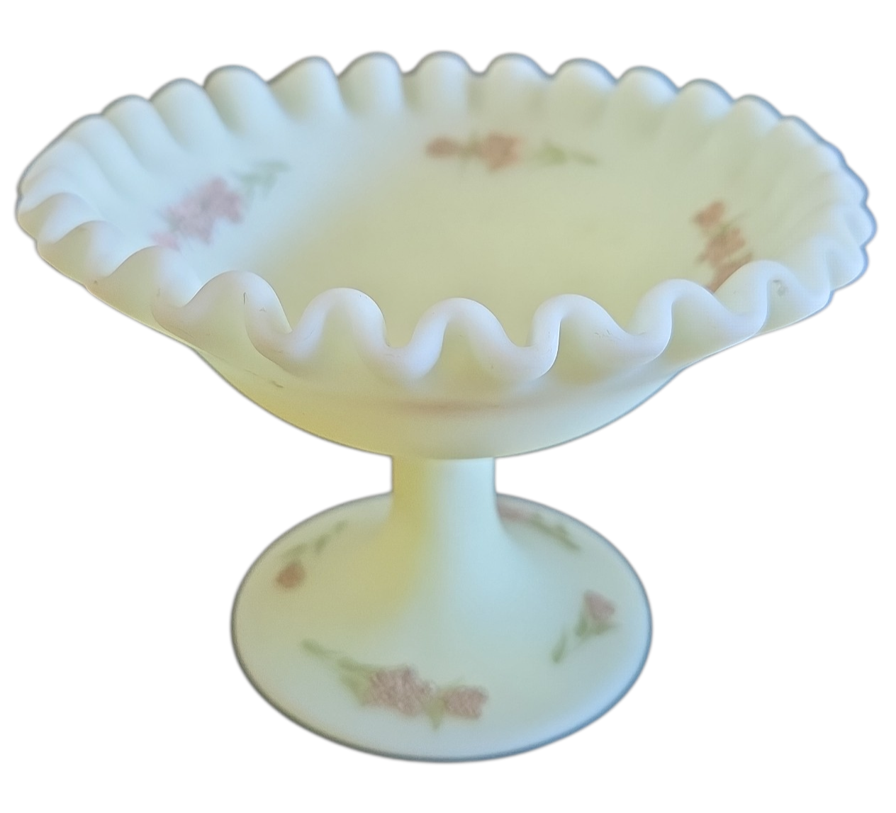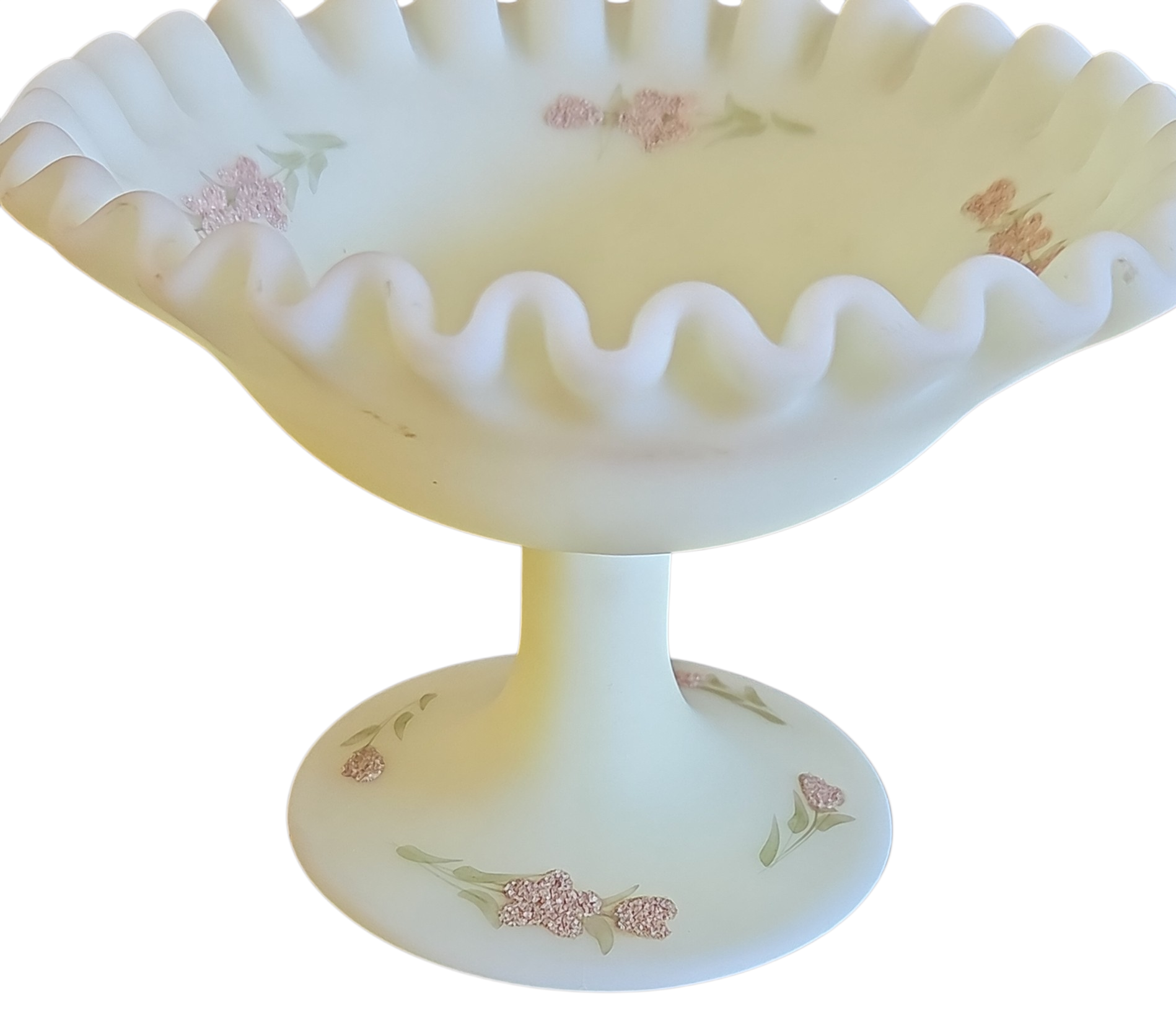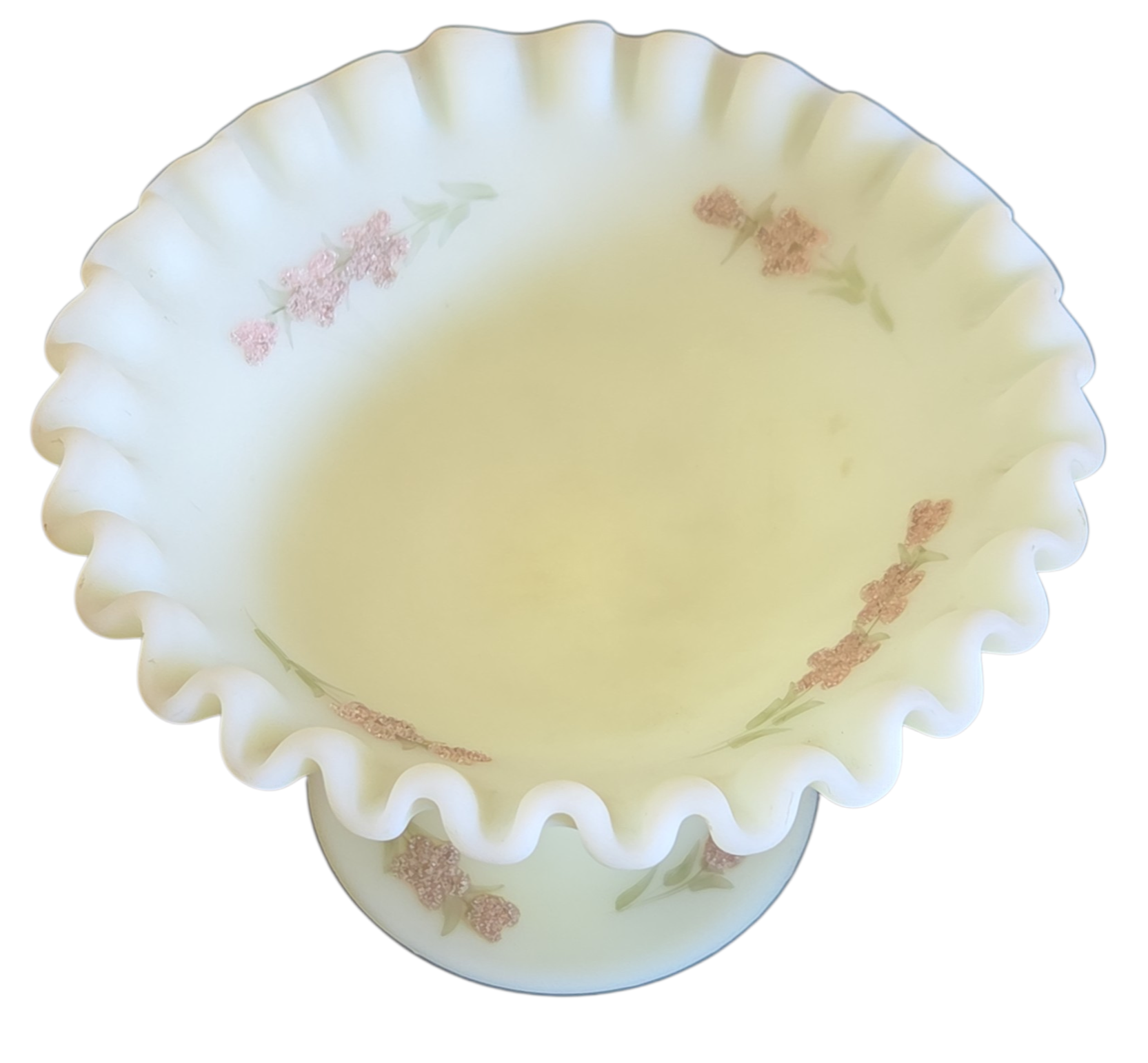 Uma verdadeira joia para colecionadores de vidro artístico americano. Esta peça vintage da renomada marca Fenton é fabricada em vidro de urânio (Uralina), conhecida por sua tonalidade verde-amarelada única que exibe um brilho neon fluorescente intenso sob luz ultravioleta (luz negra).