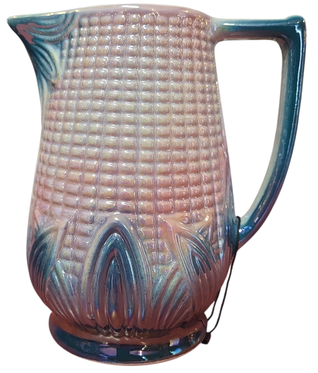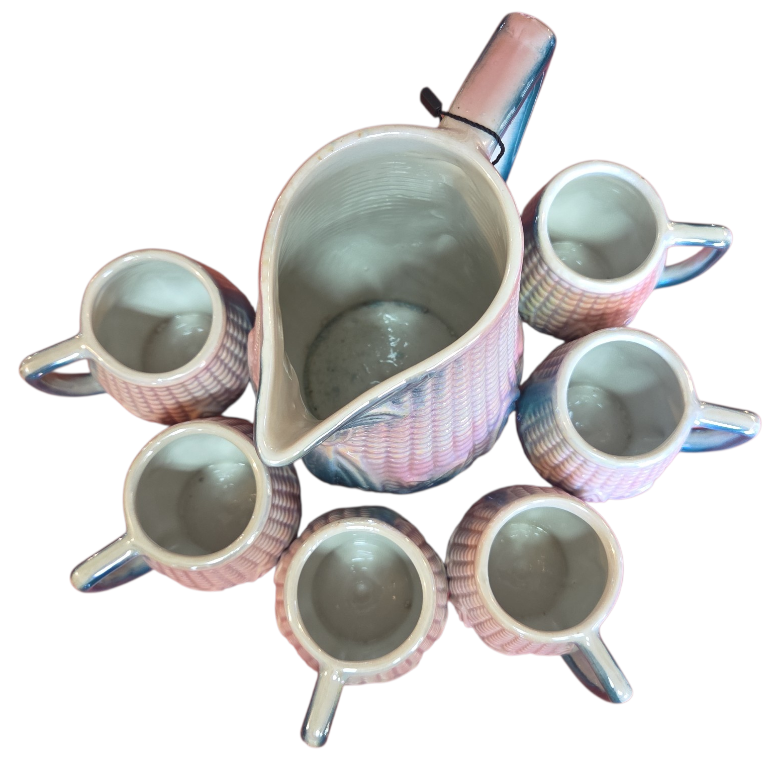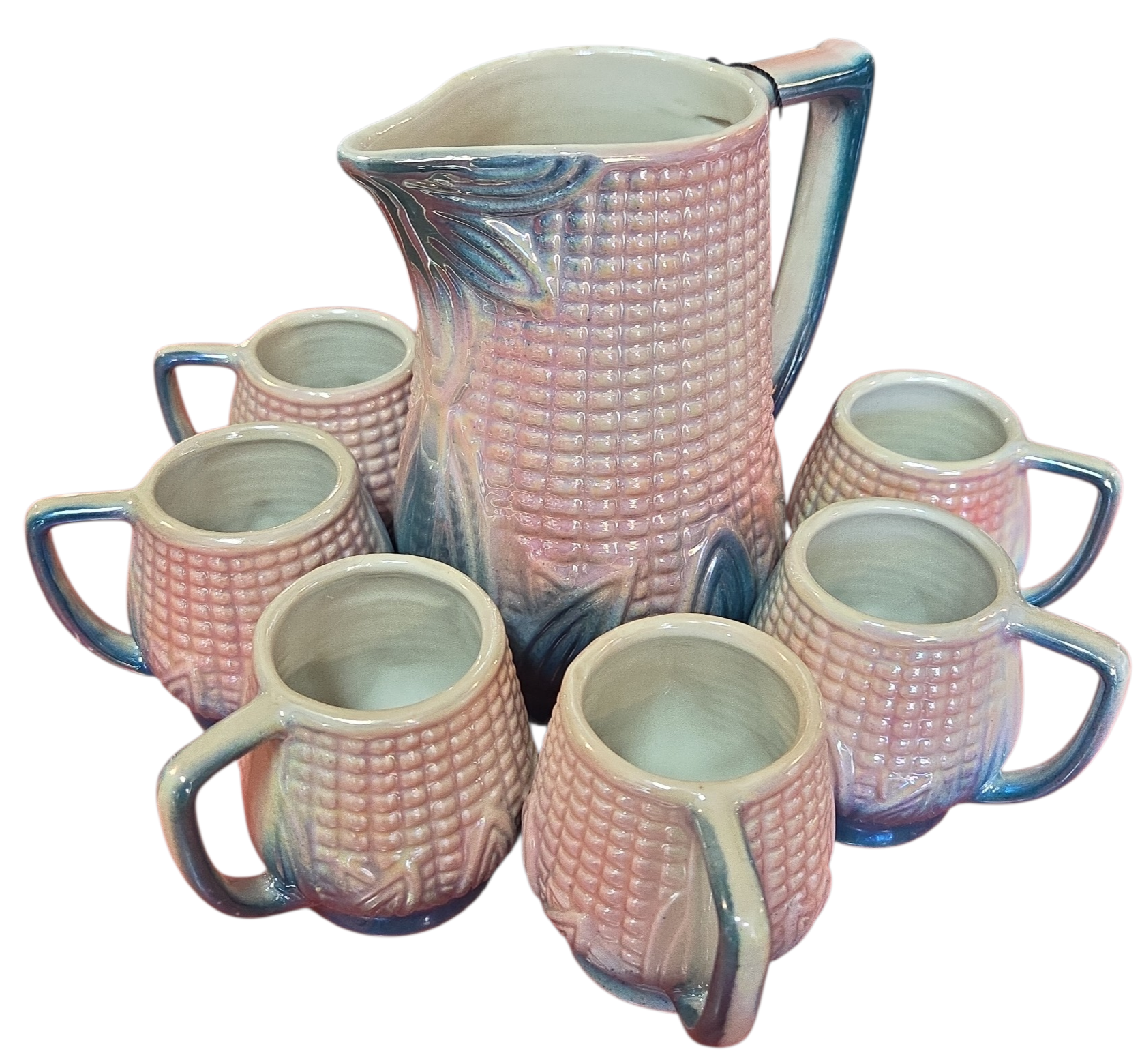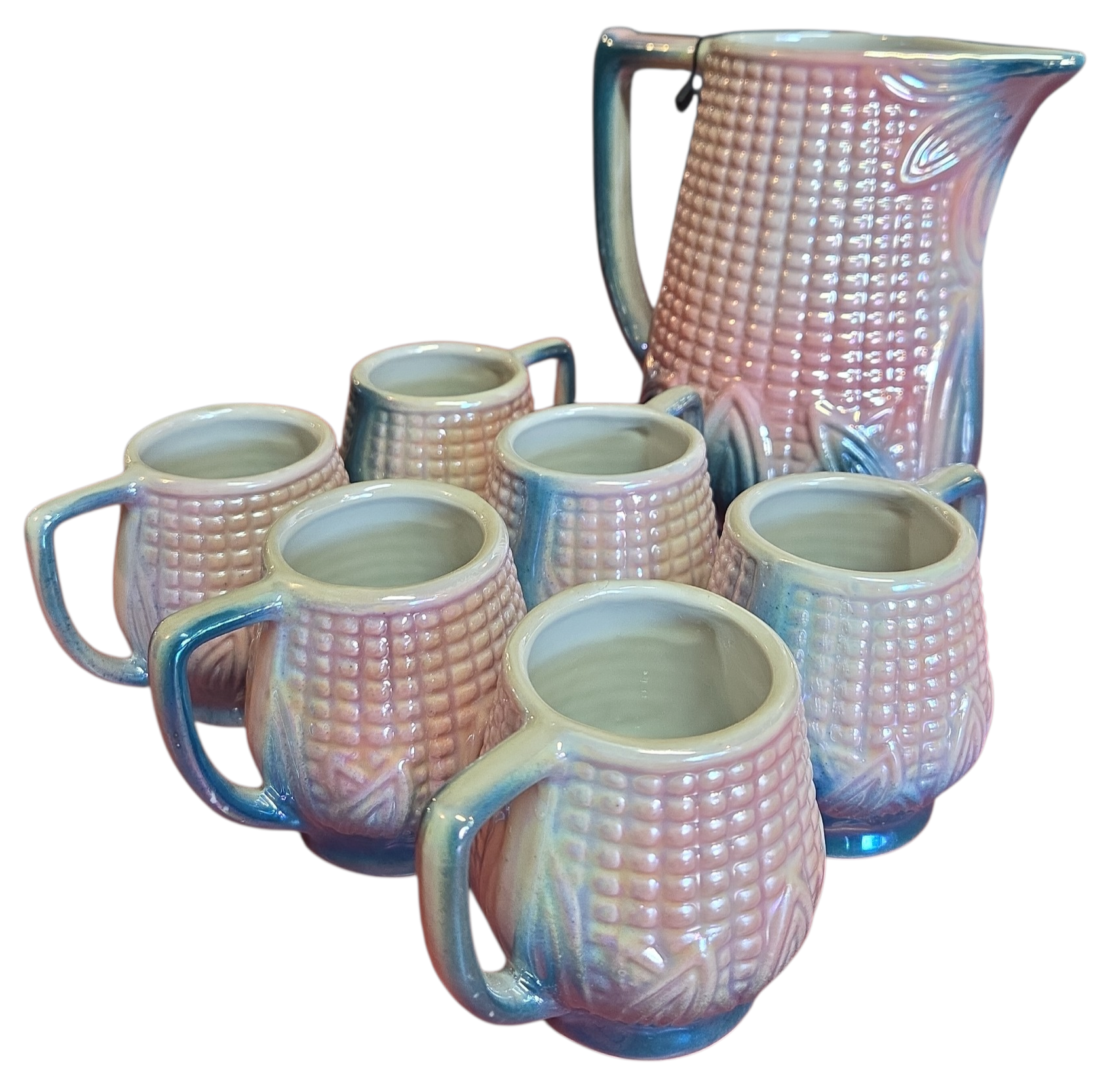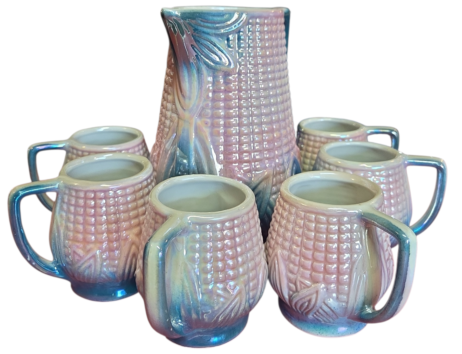 Magnífico conjunto de refresco vintage em cerâmica figurativa, apresentando um design detalhado em relevo de espiga de milho com acabamento iridescente. As peças possuem um brilho perolado único que muda de tonalidade conforme a incidência da luz, variando entre tons de rosa, azul e dourado.