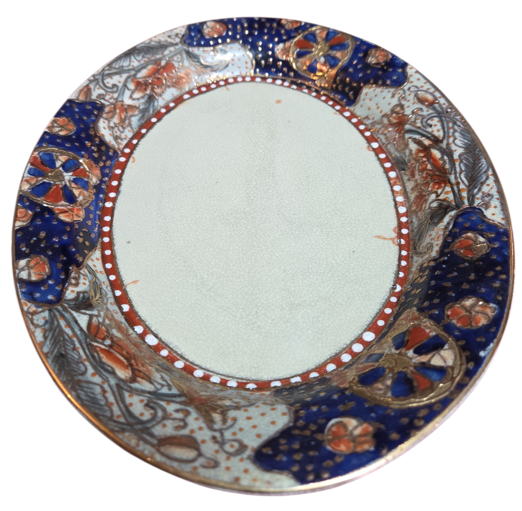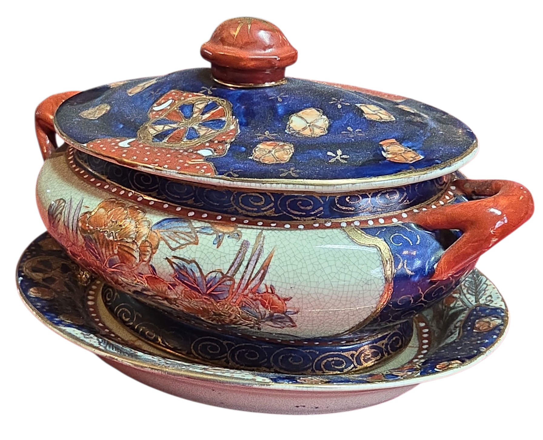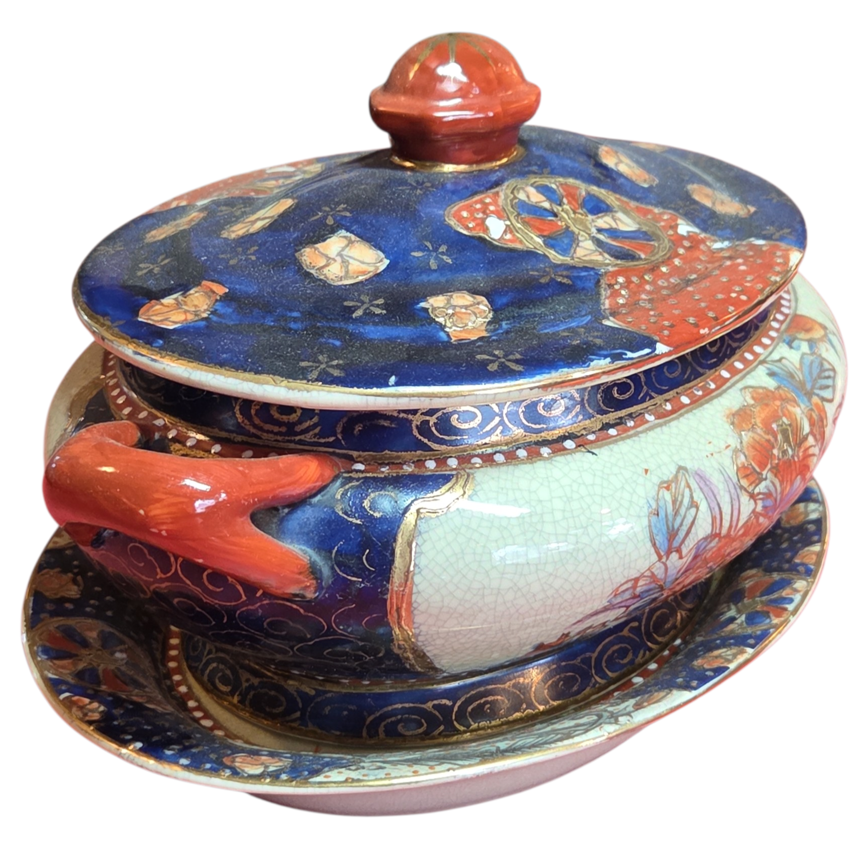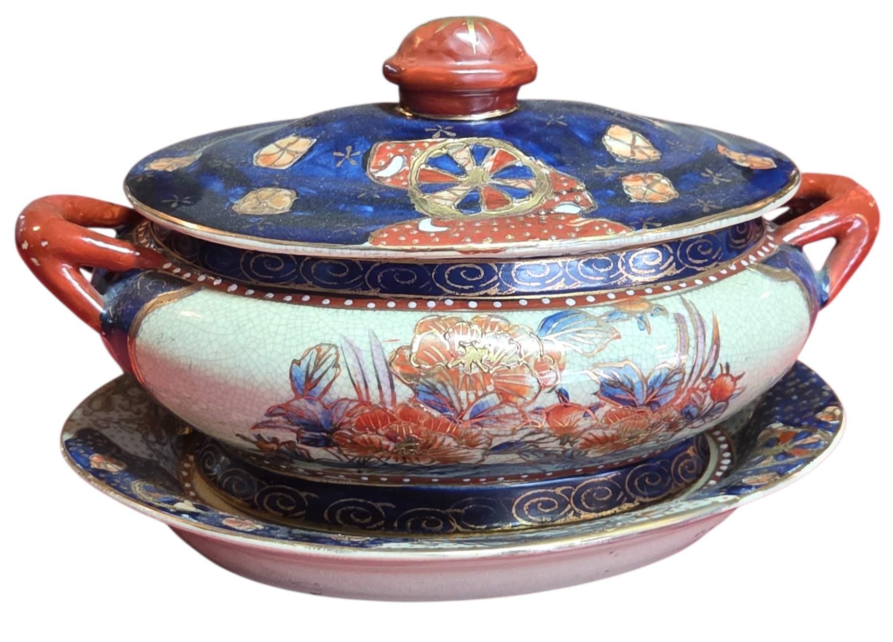 Belíssima sopeira com presentoir (prato de base) em porcelana oriental, uma peça de grande impacto visual e refinamento técnico. Decorada com uma paleta clássica de azul cobalto, terracota e toques dourados, esta peça exibe o domínio da arte cerâmica asiática, com ricas cenas florais e padrões geométricos tradicionais.
