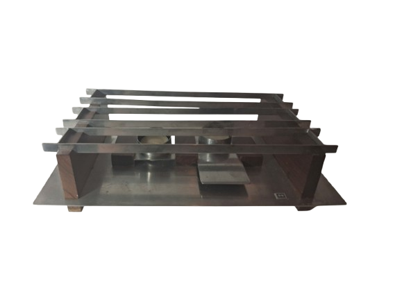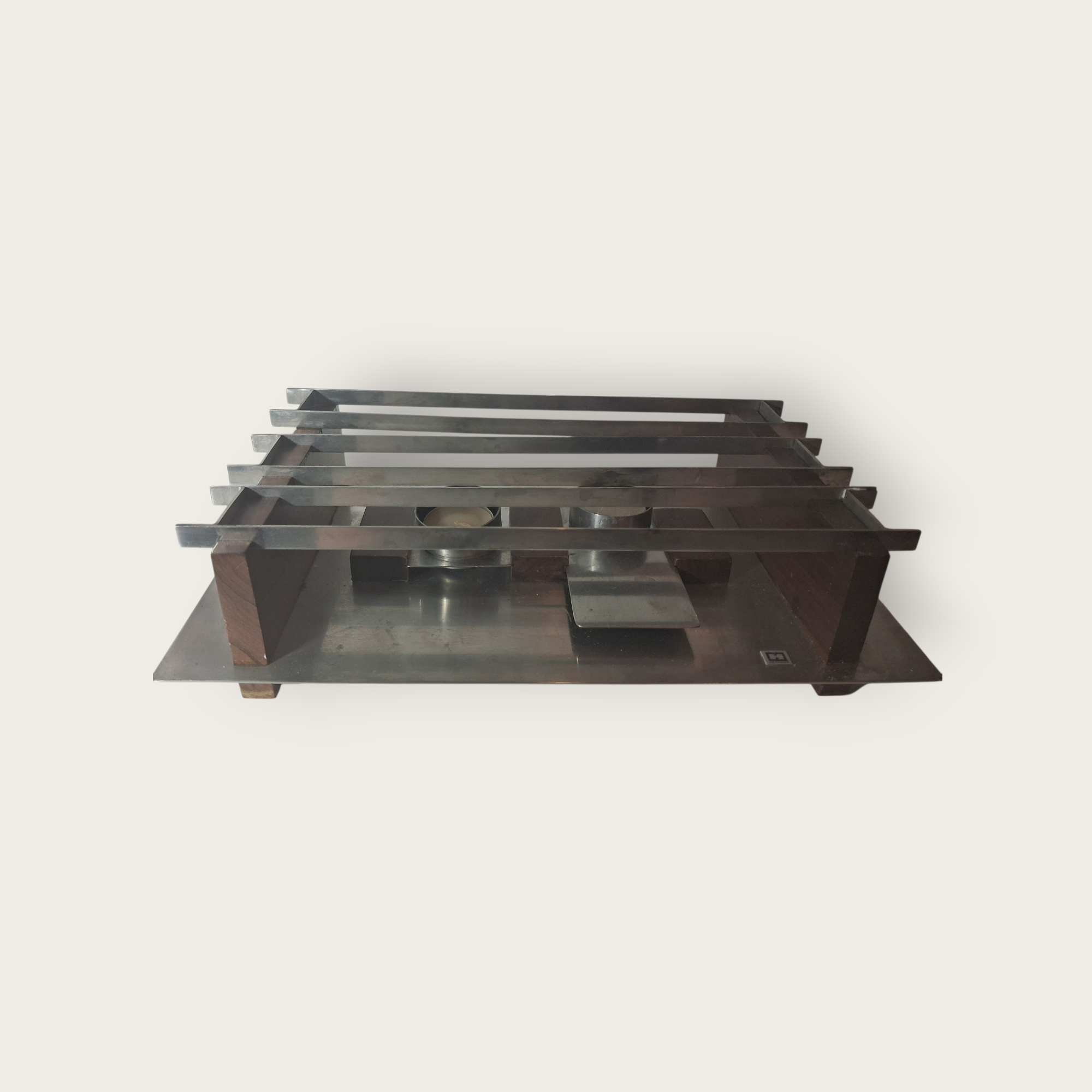 Peça utilitária de design consagrado dos anos 70. Em aço inox, marca HERCULES, base retangular, grelha em barras em aço e laterais em madeira nobre.