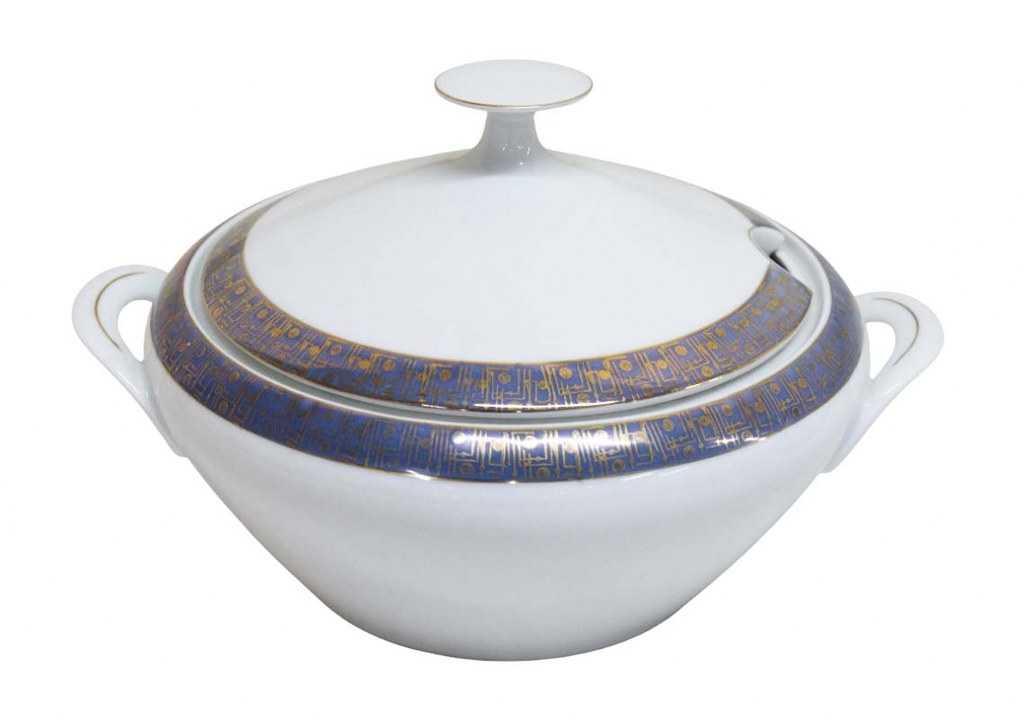 Sopeira em porcelana branca com decoração de barrado azul com douração. Da manufatura REAL SÃO PAULO MADE IN BRAZIL. Medidas 17A X 28C de alça a alça