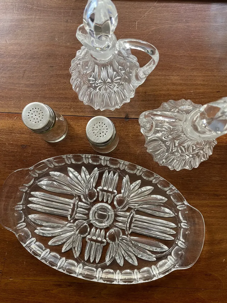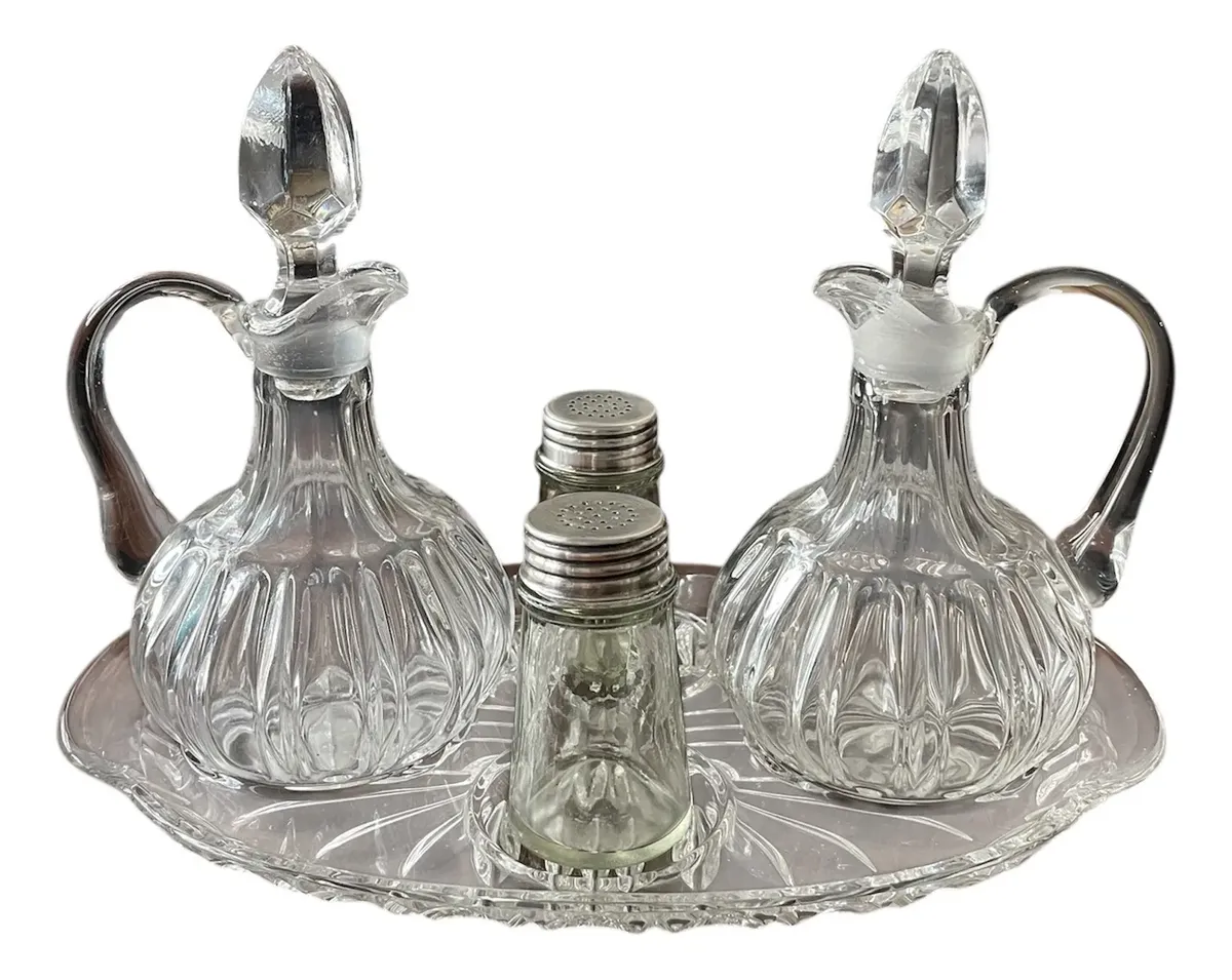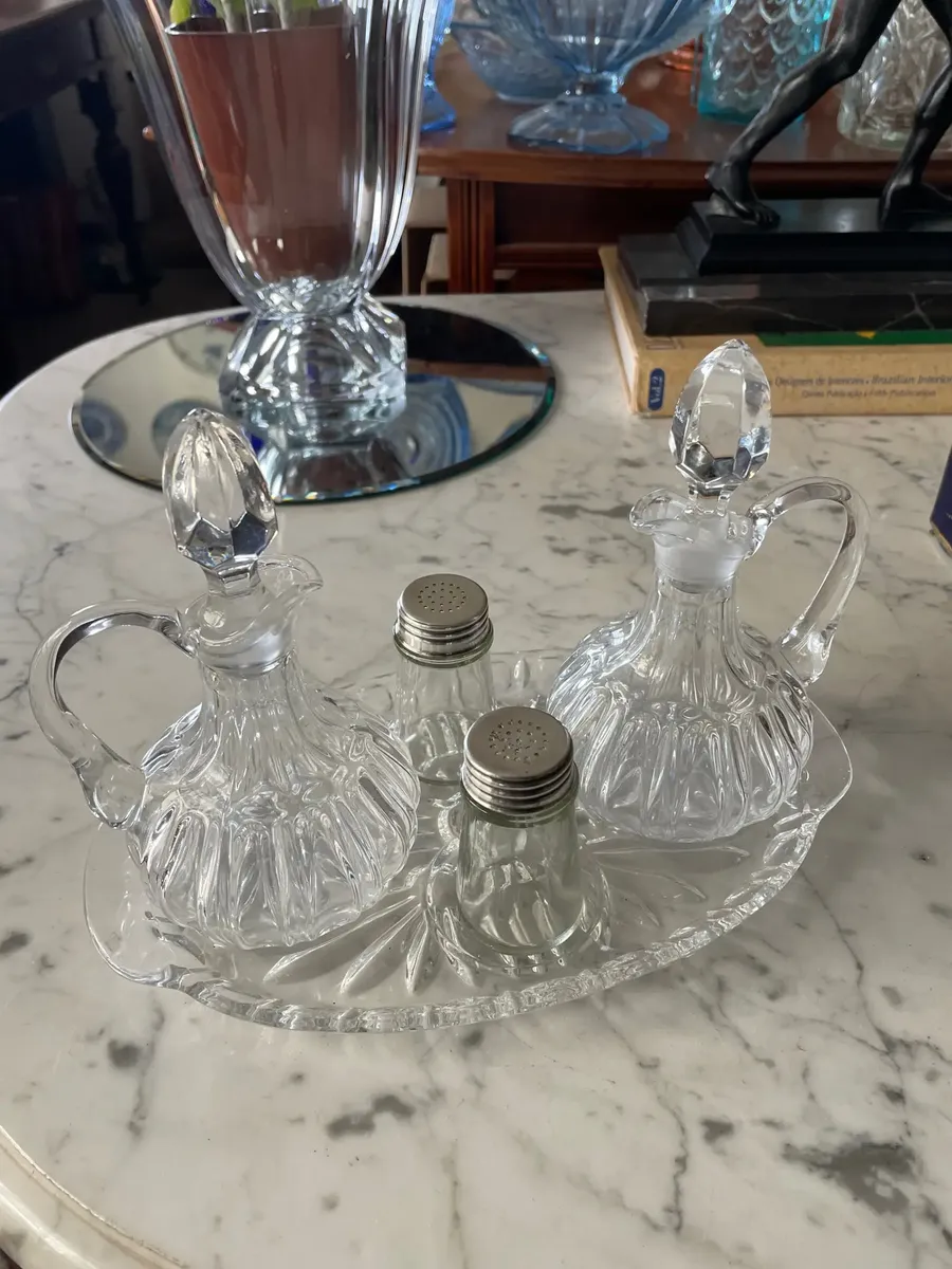 Antigo galheteiro em cristal francês prensado. Composto por cinco peças. **Uma das garrafinhas tem um lascado na borda. Última foto do anúncio**