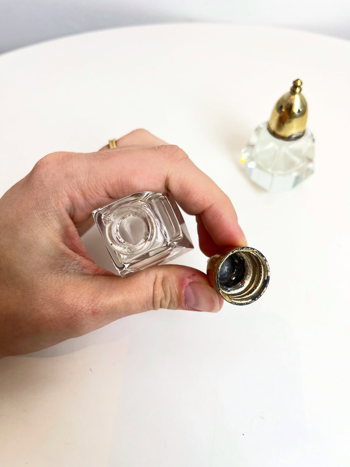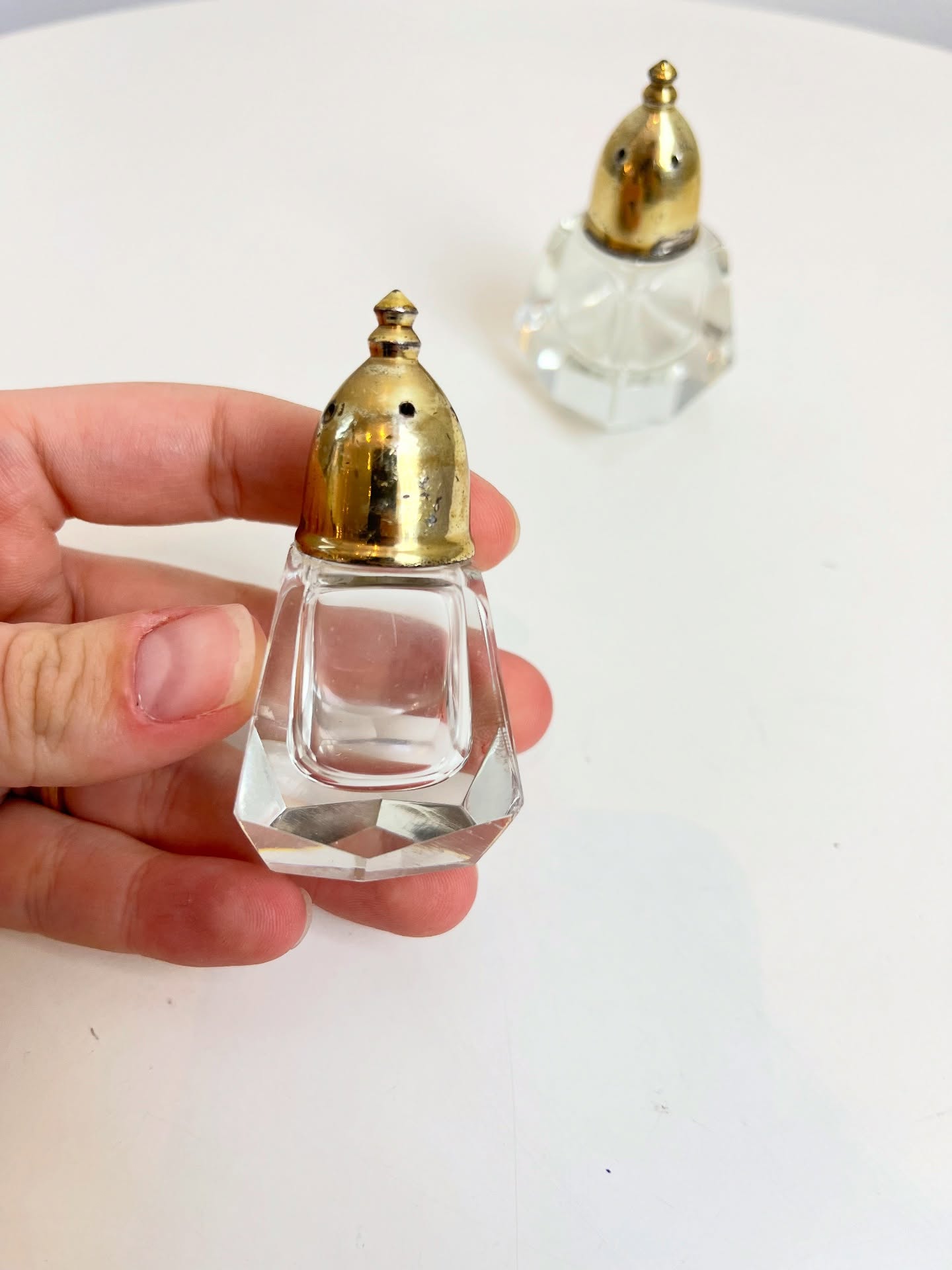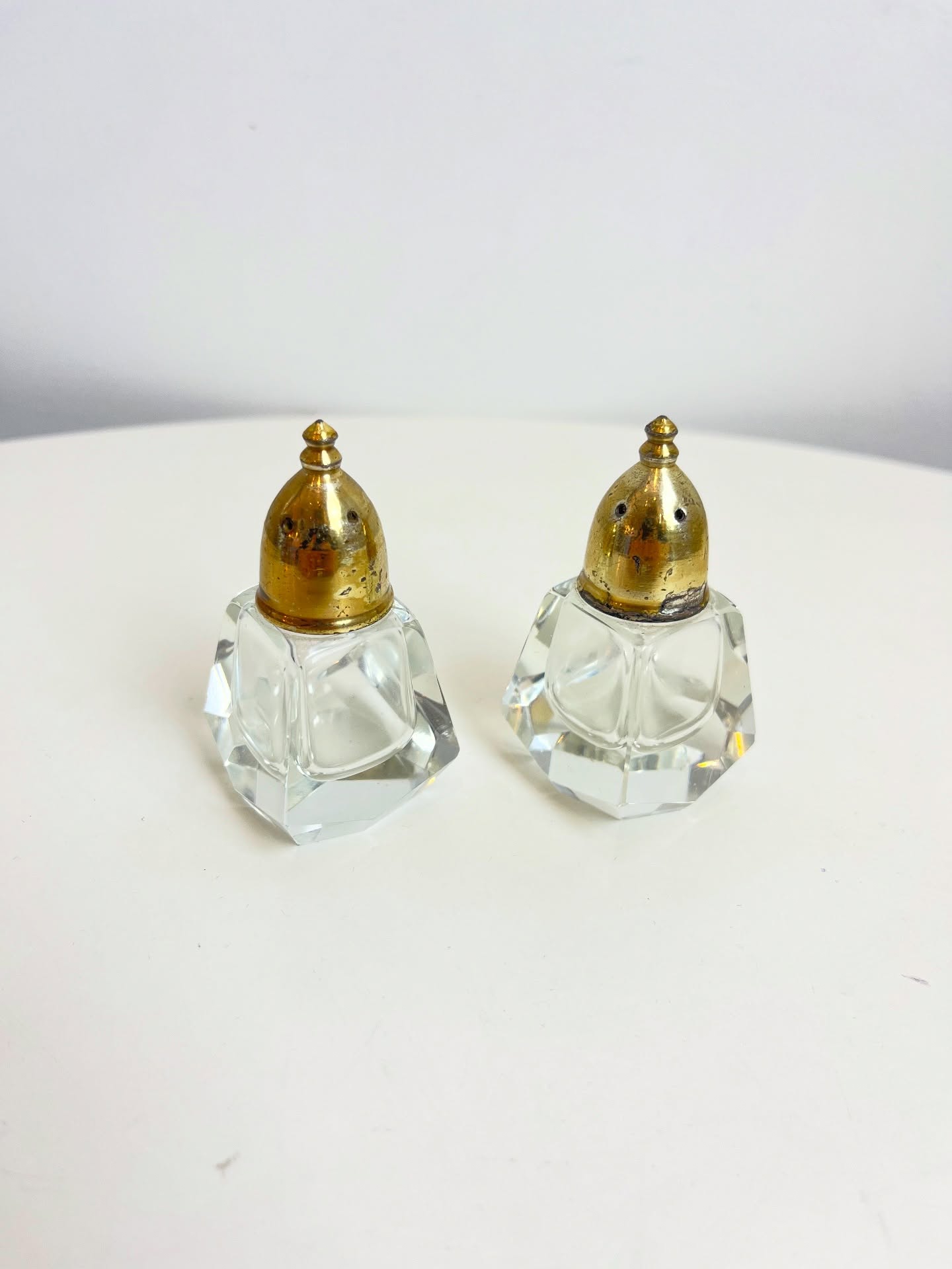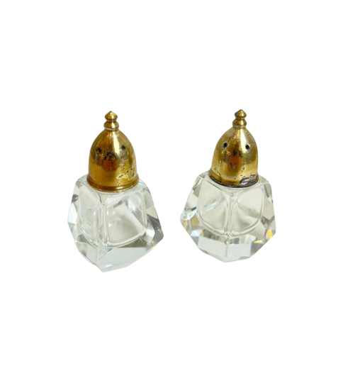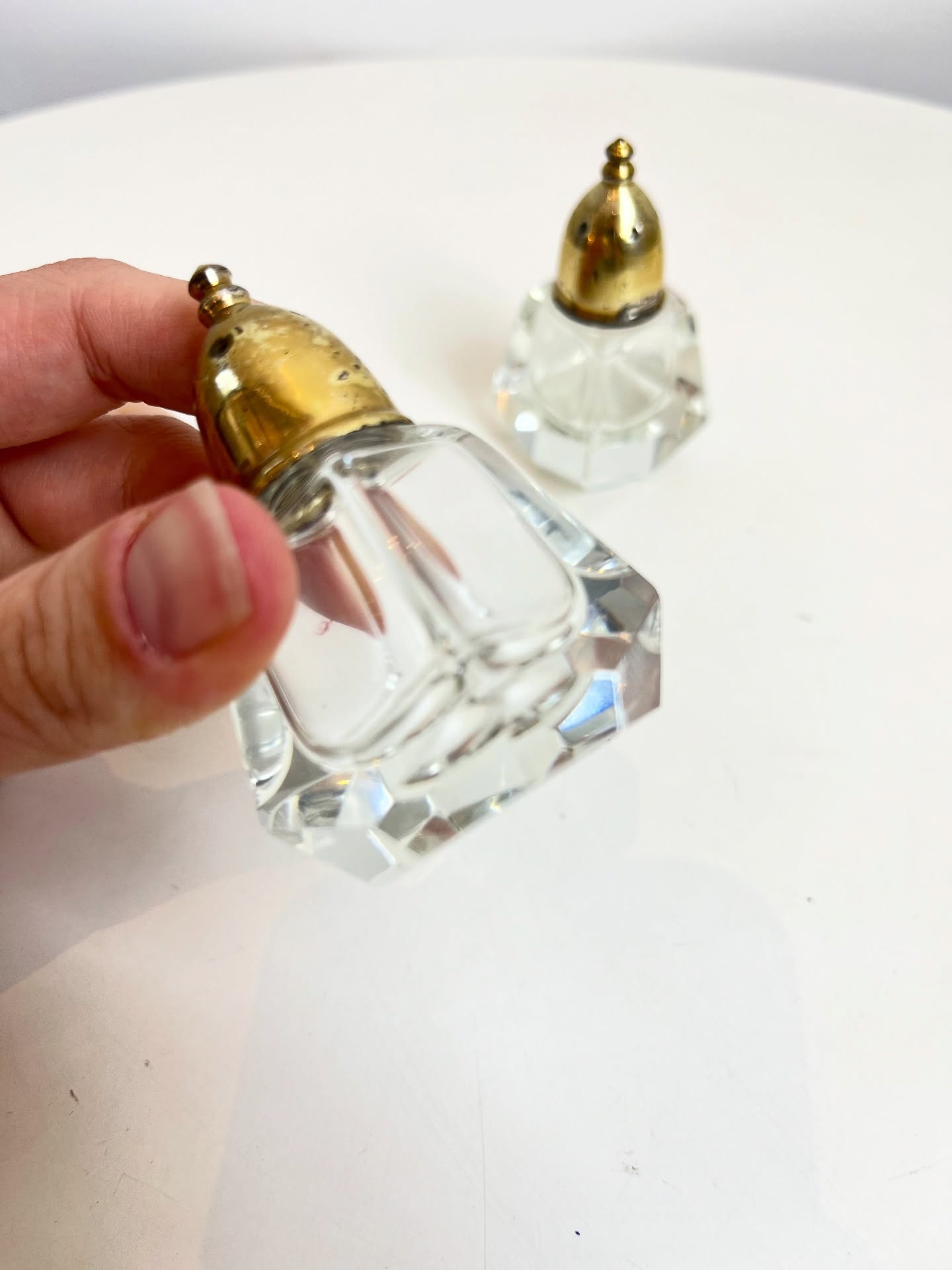 Dupla de saleiro e pimenteiro em cristal e metal banhado. Marcas do tempo e uso no metal. Mínimos e quase imperceptíveis bicados na base.