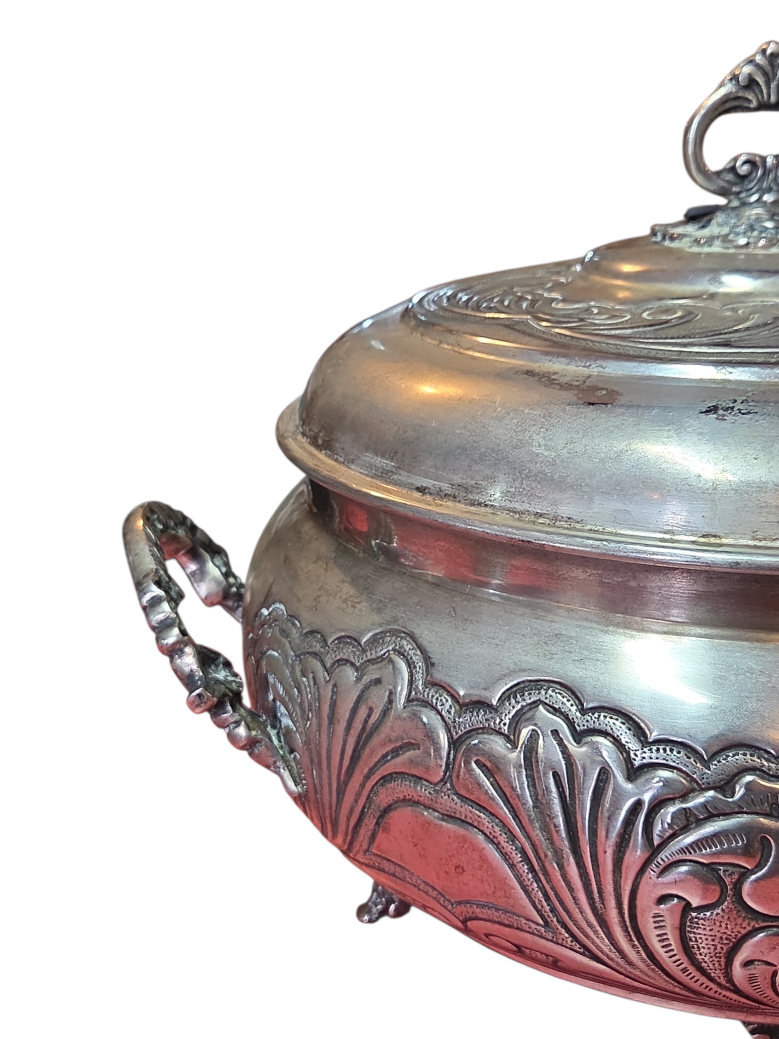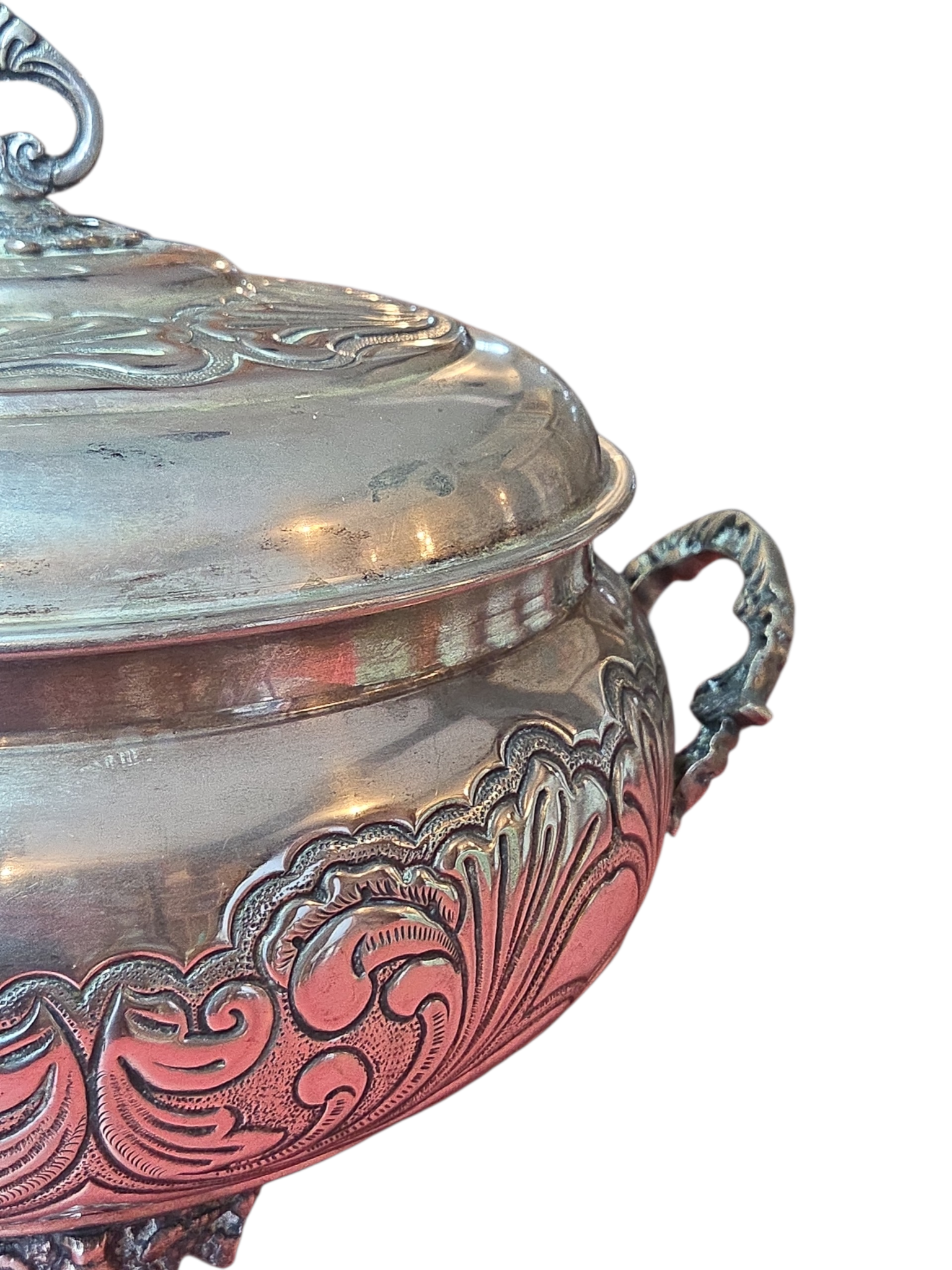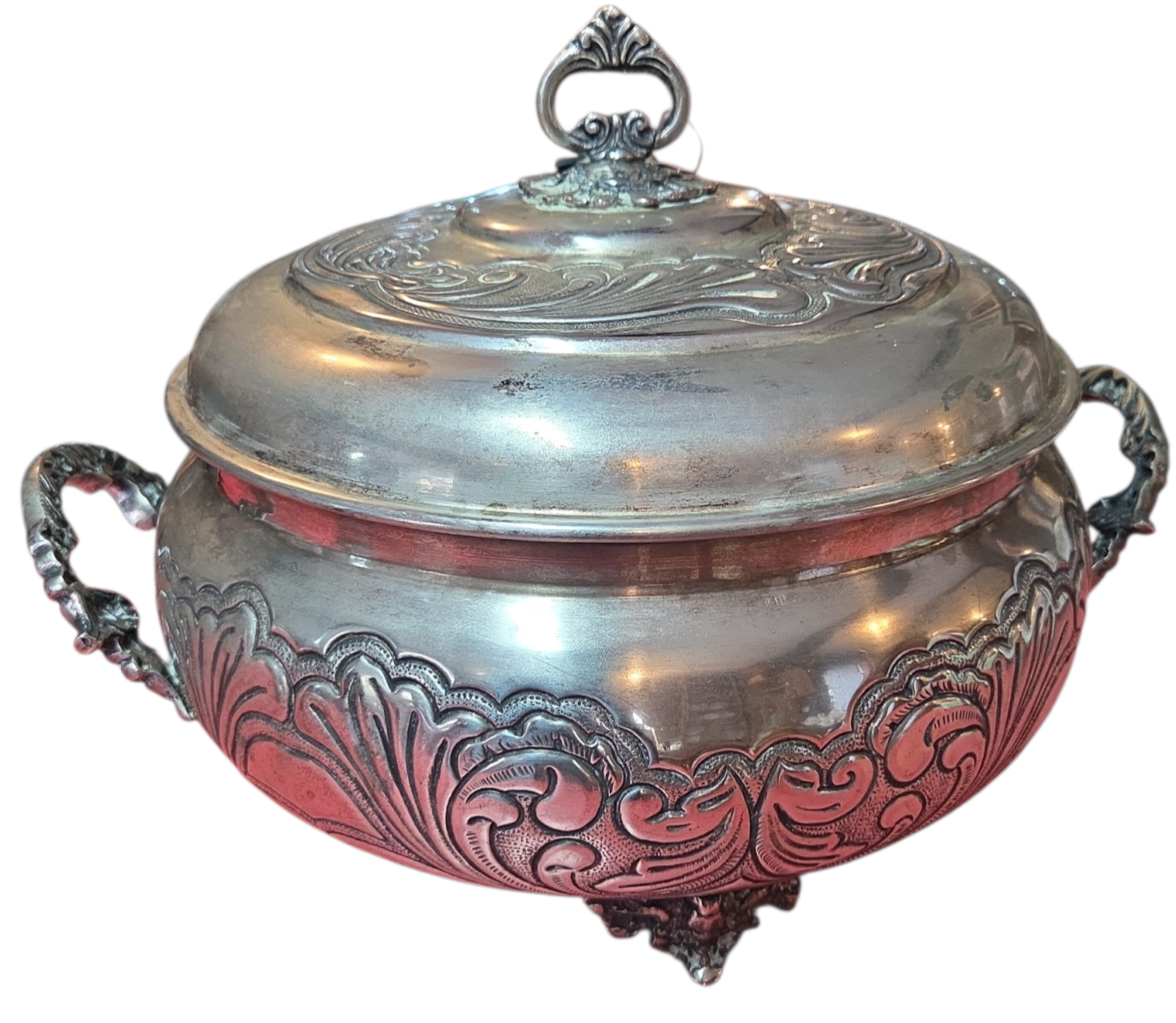 Esta magnífica terrina (sopeira) é um exemplar legítimo de prataria de alta qualidade, produzida com banho de Prata 90. A peça se destaca pelo seu corpo robusto e acabamento ricamente trabalhado, apresentando uma decoração em relevo que percorre toda a sua circunferência e a tampa.