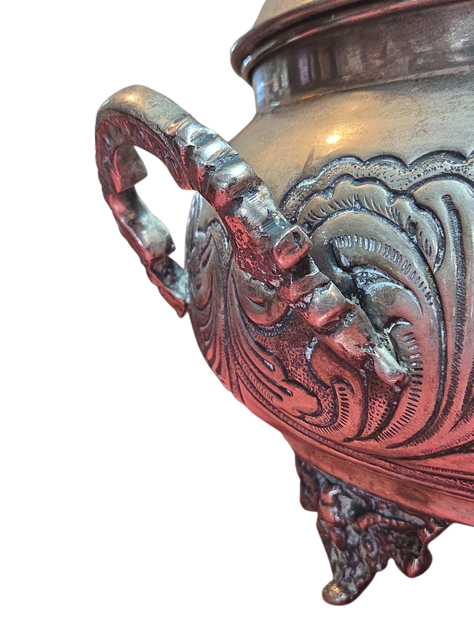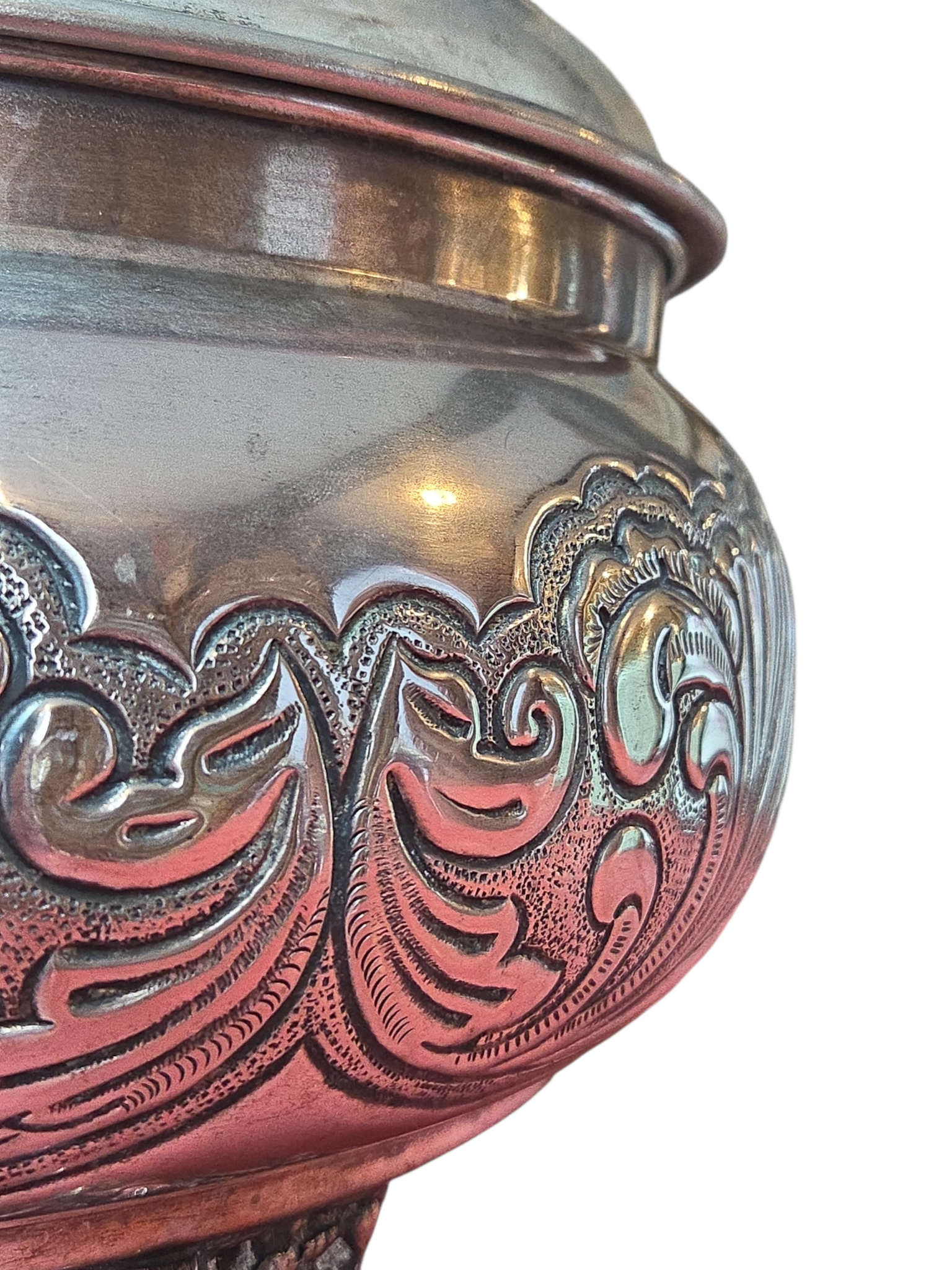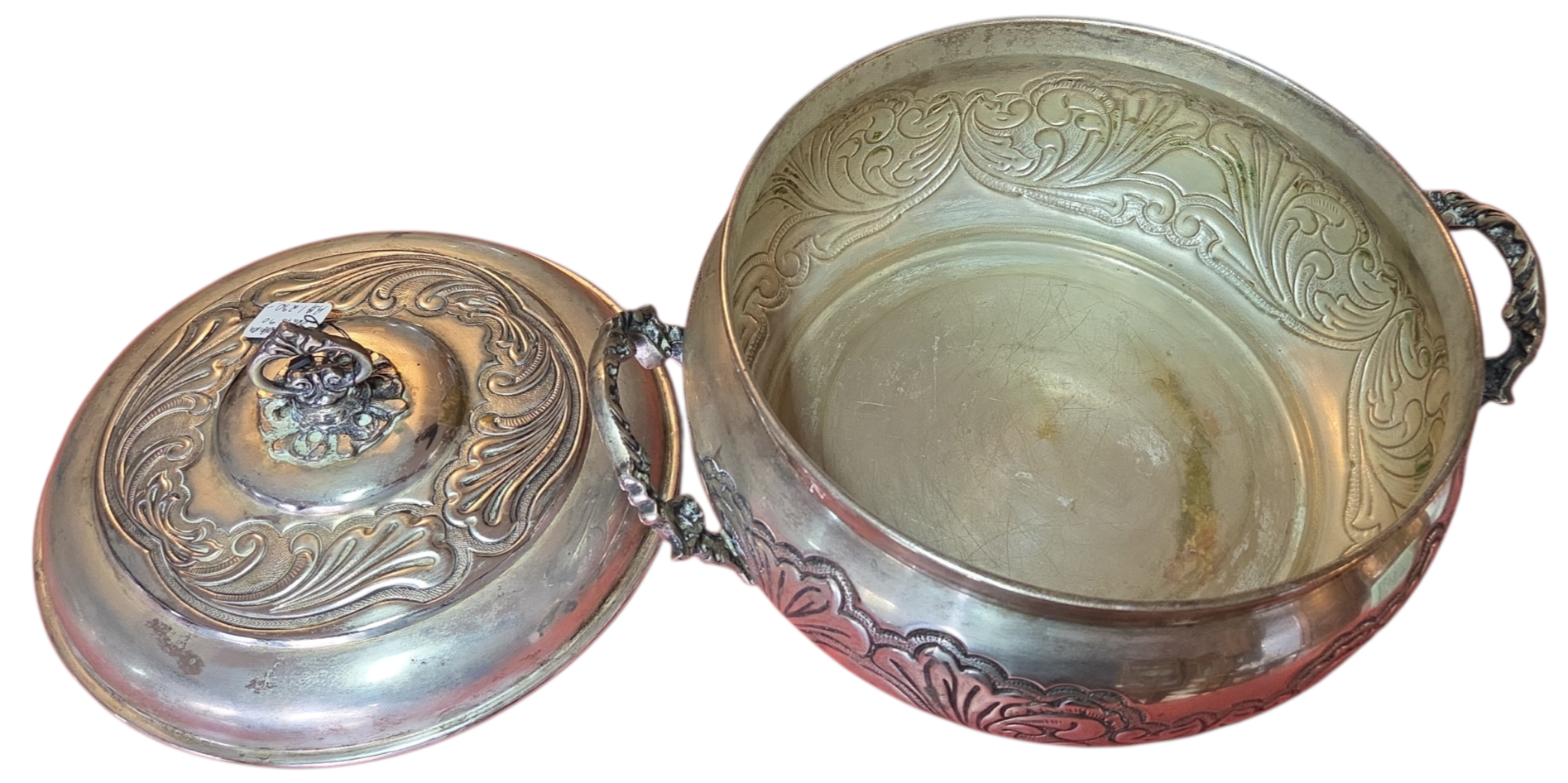 Esta magnífica terrina (sopeira) é um exemplar legítimo de prataria de alta qualidade, produzida com banho de Prata 90. A peça se destaca pelo seu corpo robusto e acabamento ricamente trabalhado, apresentando uma decoração em relevo que percorre toda a sua circunferência e a tampa.