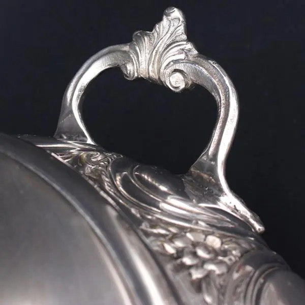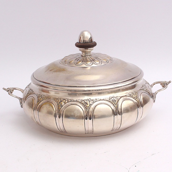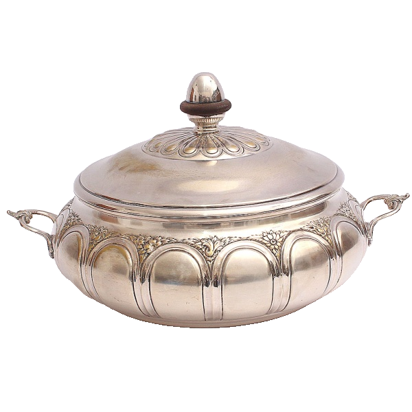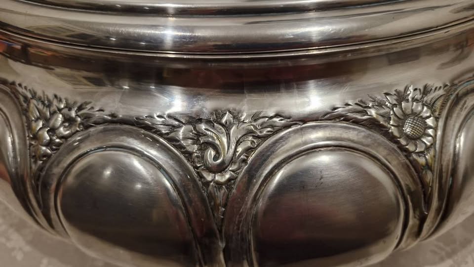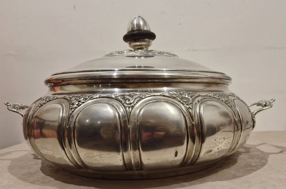 Extraordinária sopeira portuguesa banhada a prata, marca Fernando Alves, toda trabalhada, bem grande com capacidade de 10 litros, medindo 55cm de largura e 29cm de altura.
