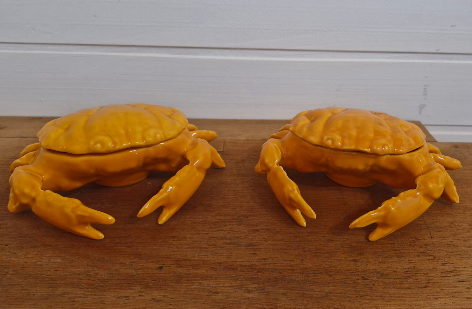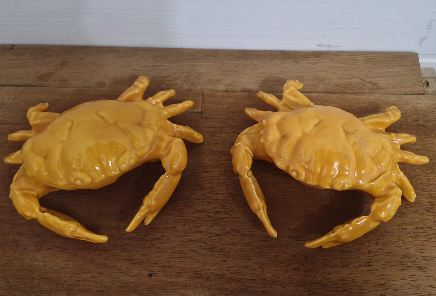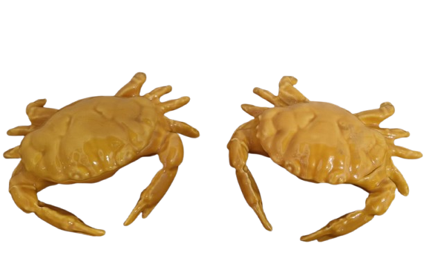Peças confeccionadas em cerâmica, apresentam um acabamento esmaltado ou brilhante na cor laranja, simulando a aparência de um crustáceo cozido. Muito decorativas para casas de praia e pousadas.